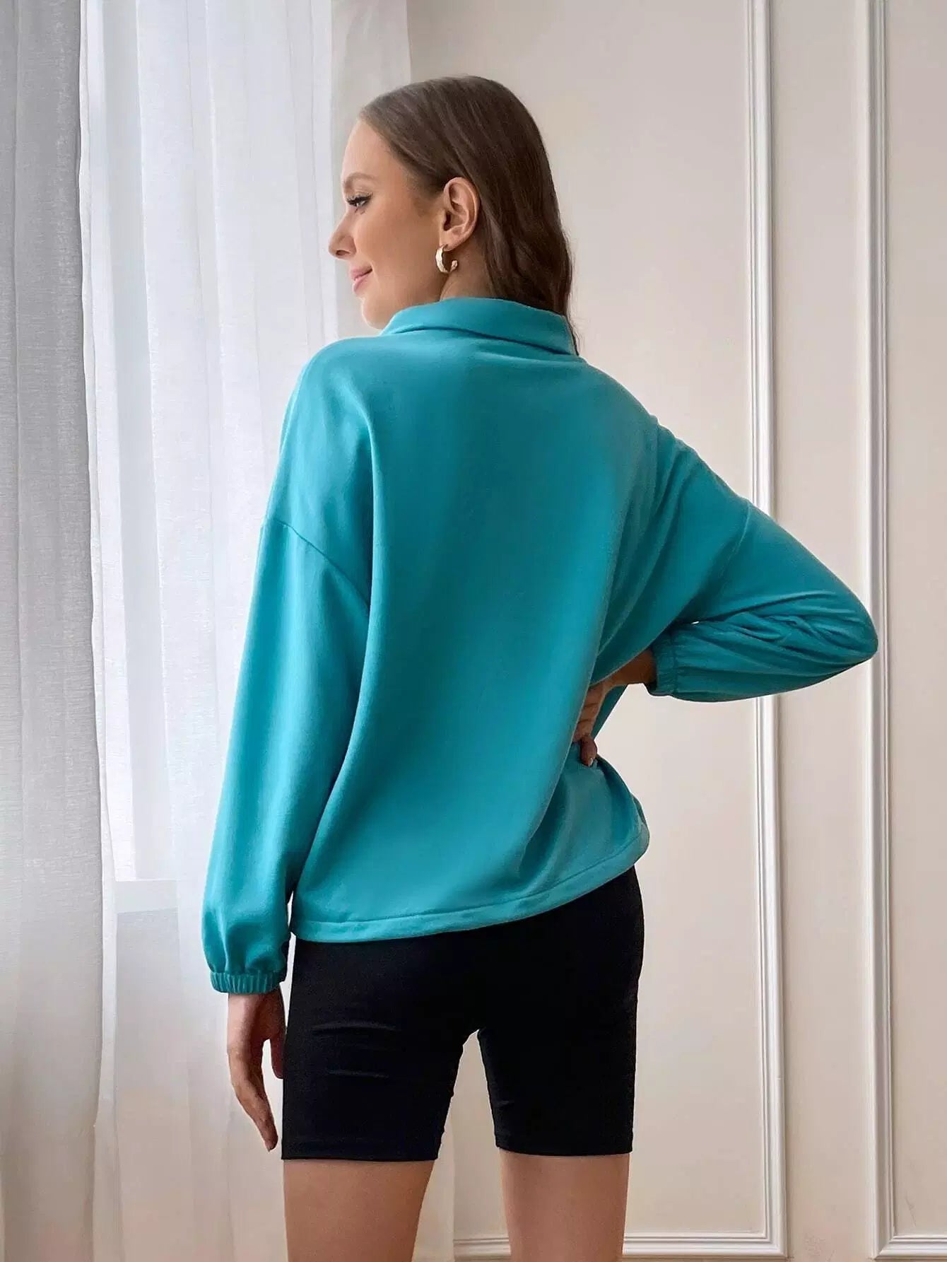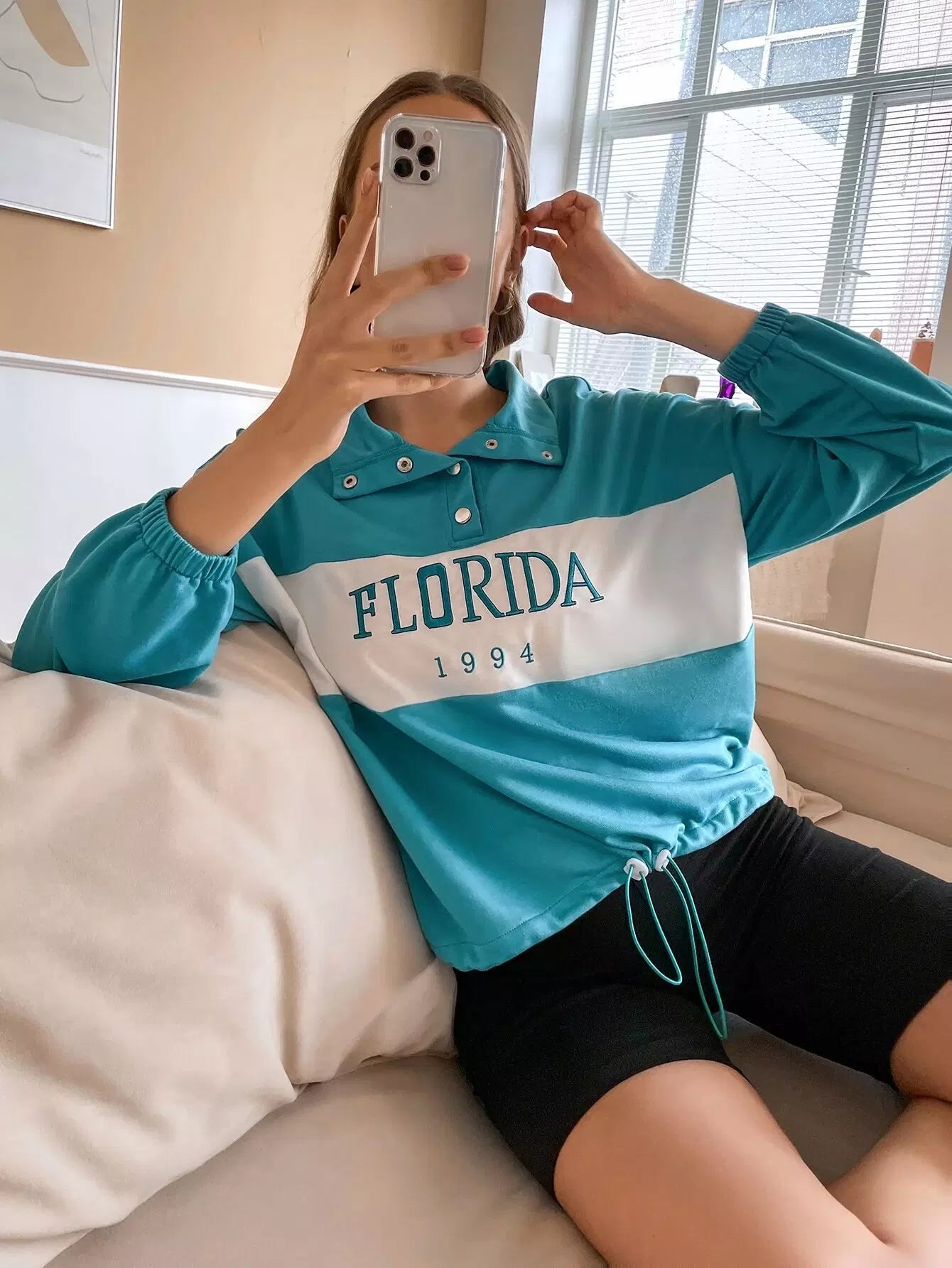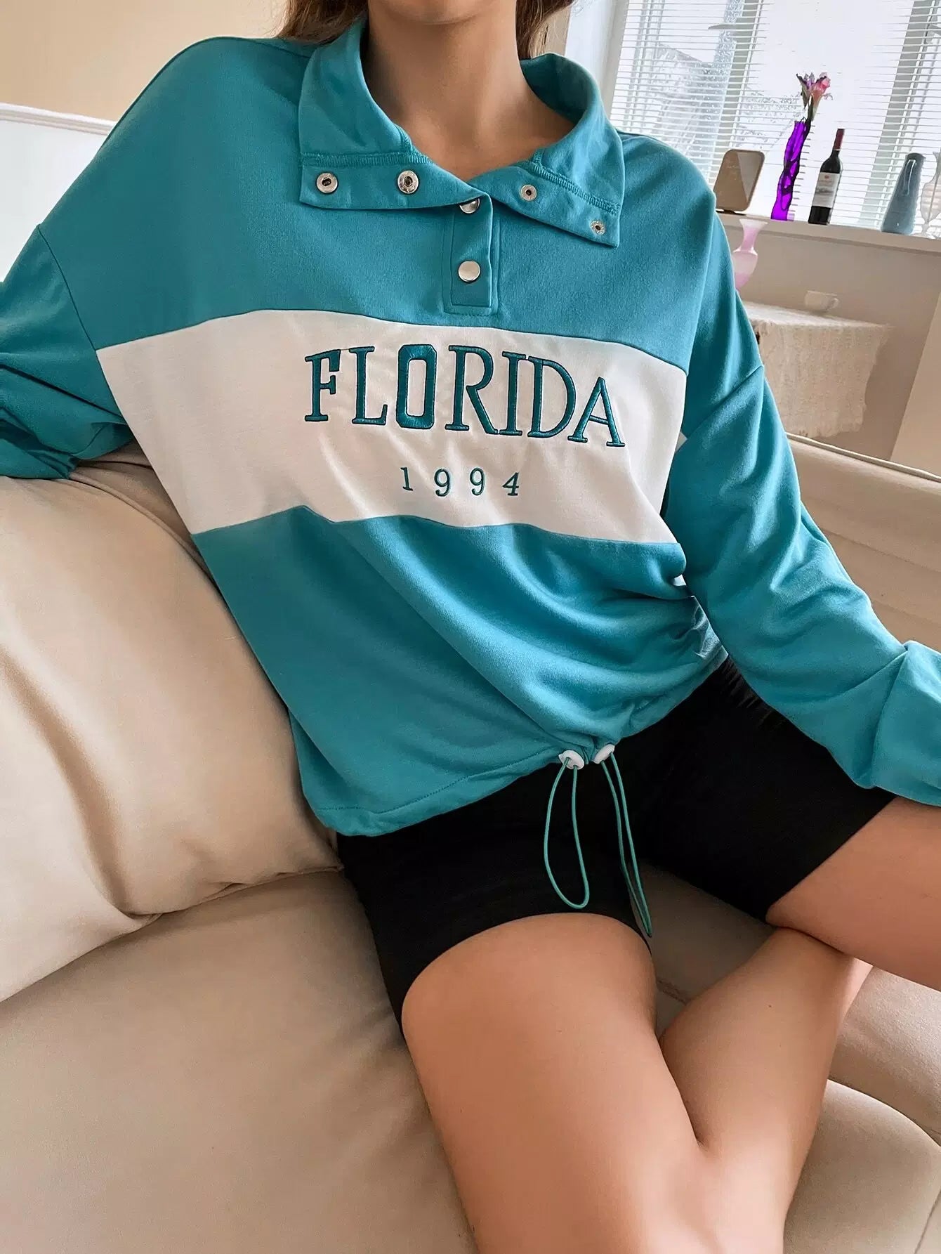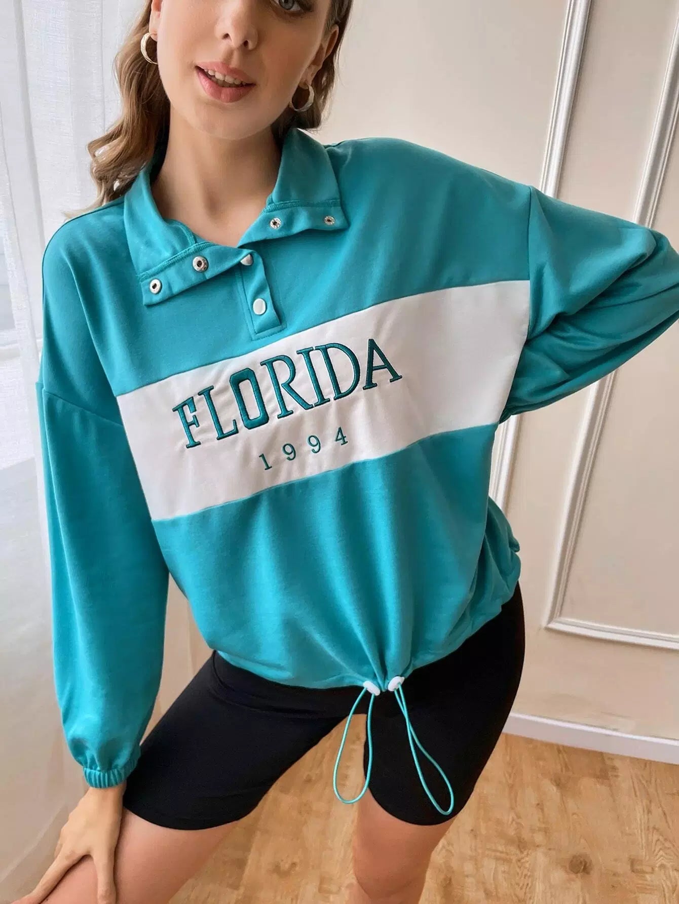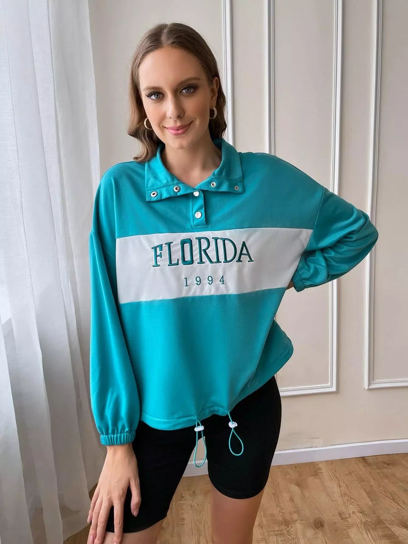 Letter Embroidery Half Button Drop Shoulder Pullover