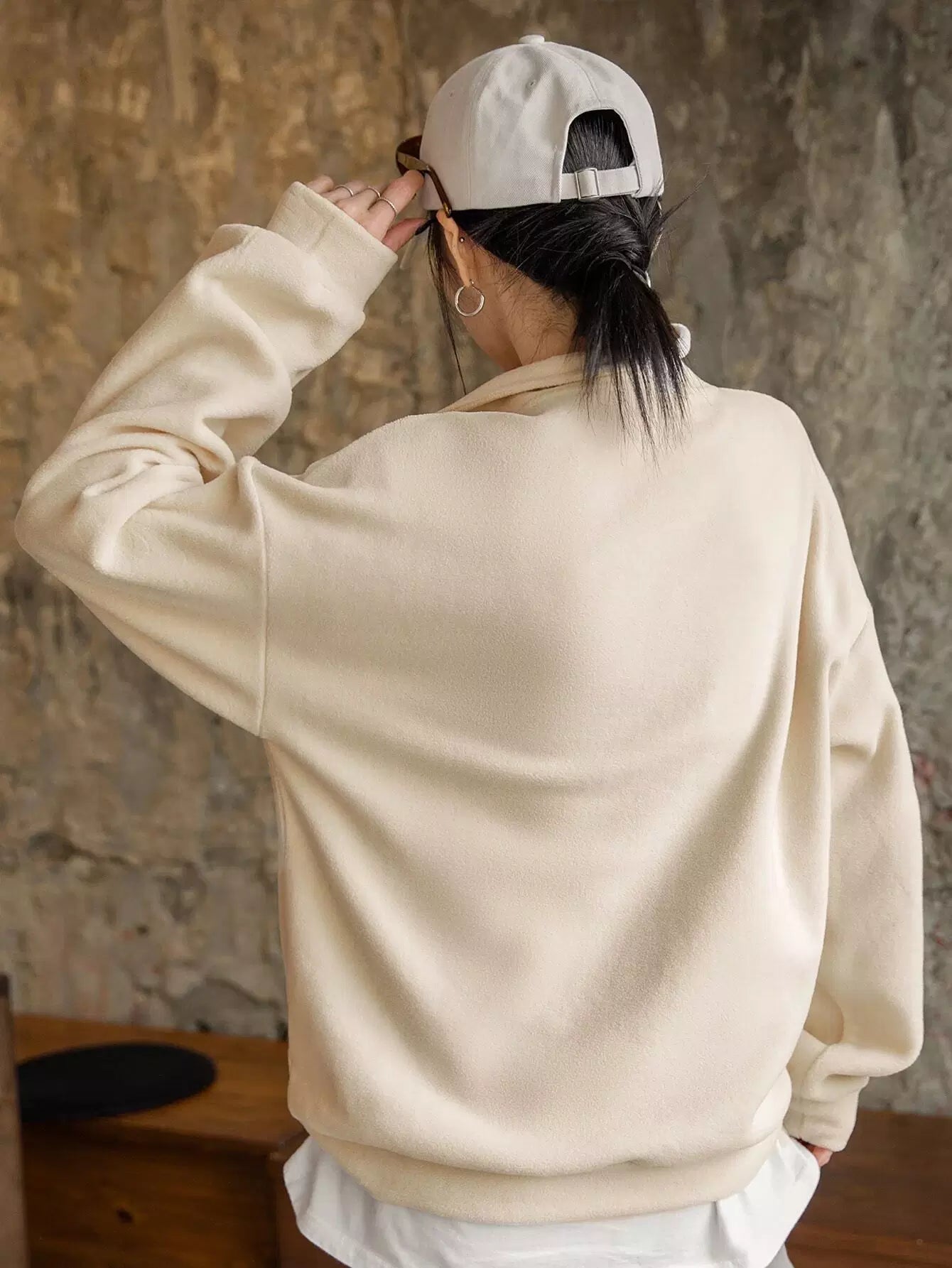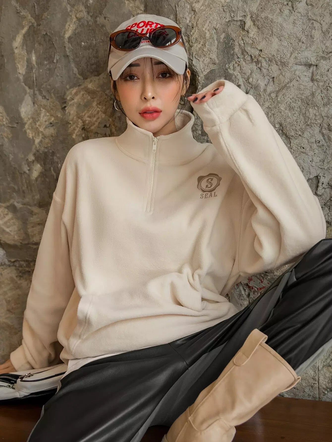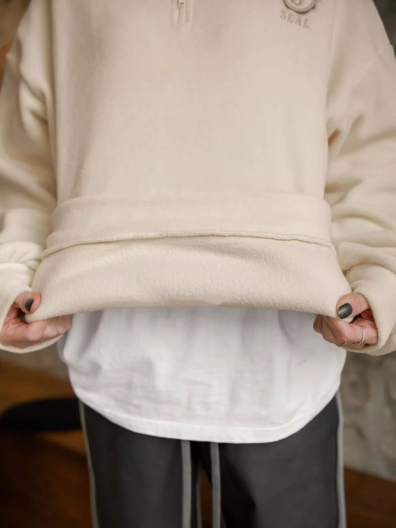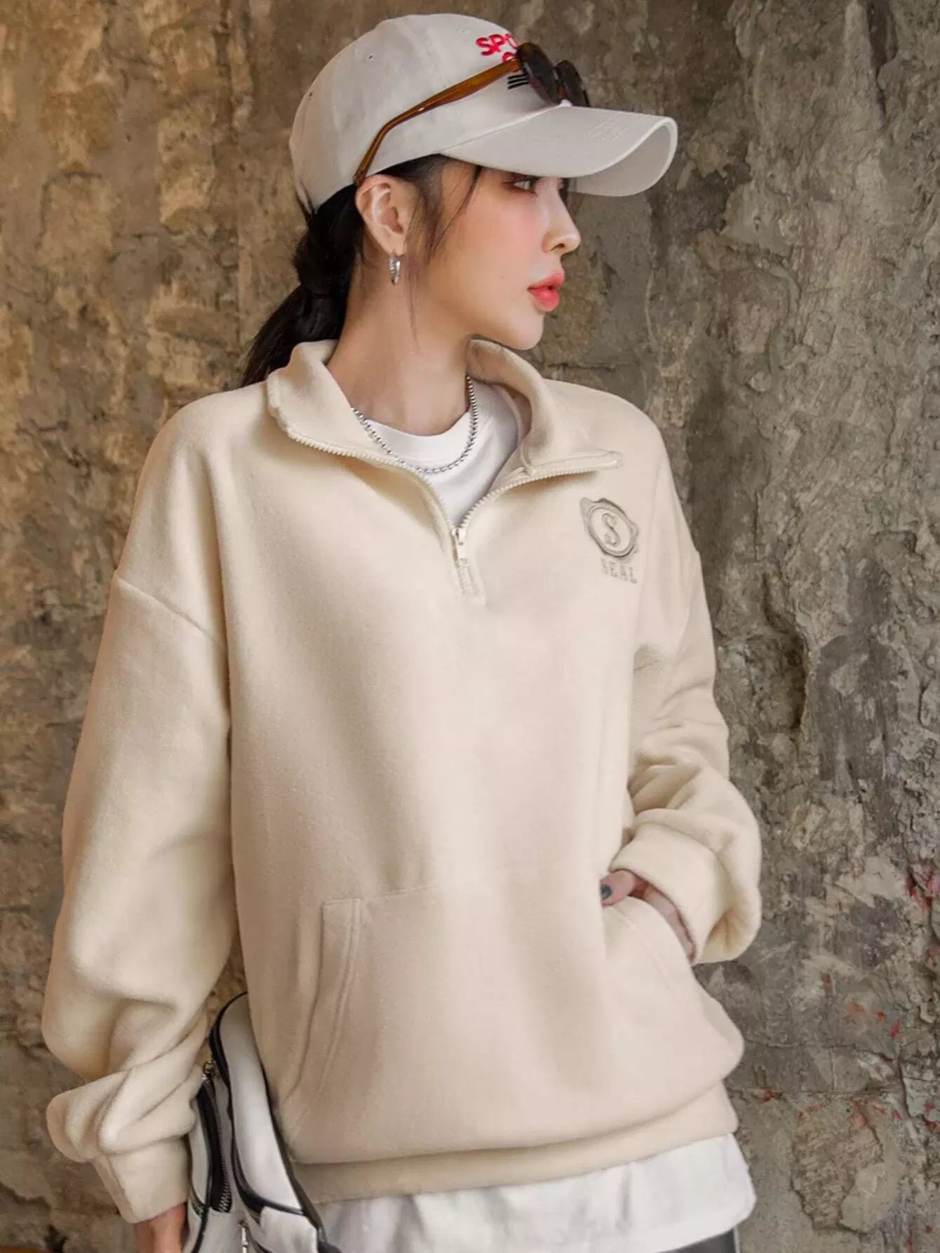 Letter Embroidery Quarter Zipper Drop Shoulder Fleece Pullover Without Tee