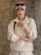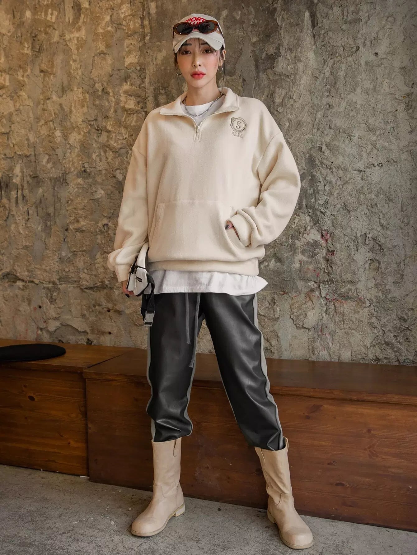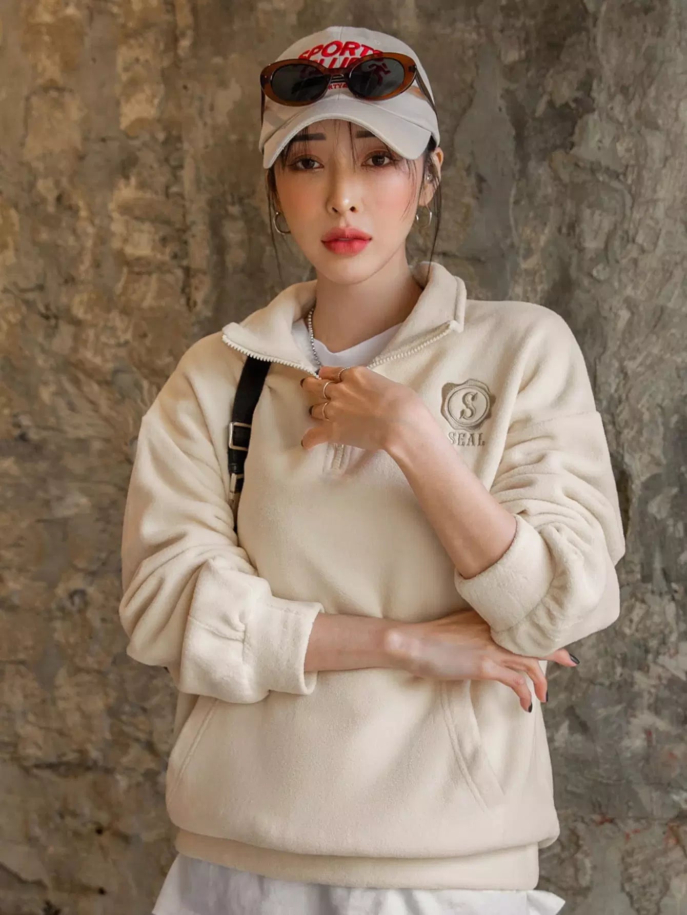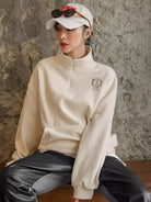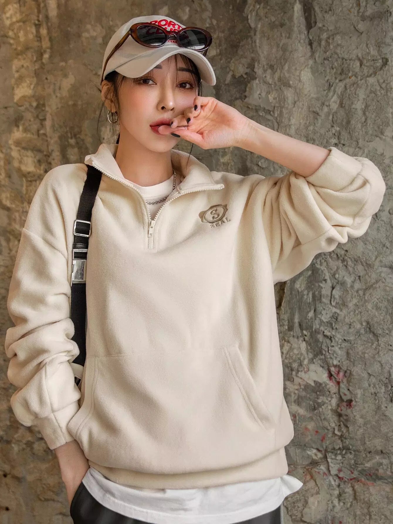 Letter Embroidery Quarter Zipper Drop Shoulder Fleece Pullover Without Tee