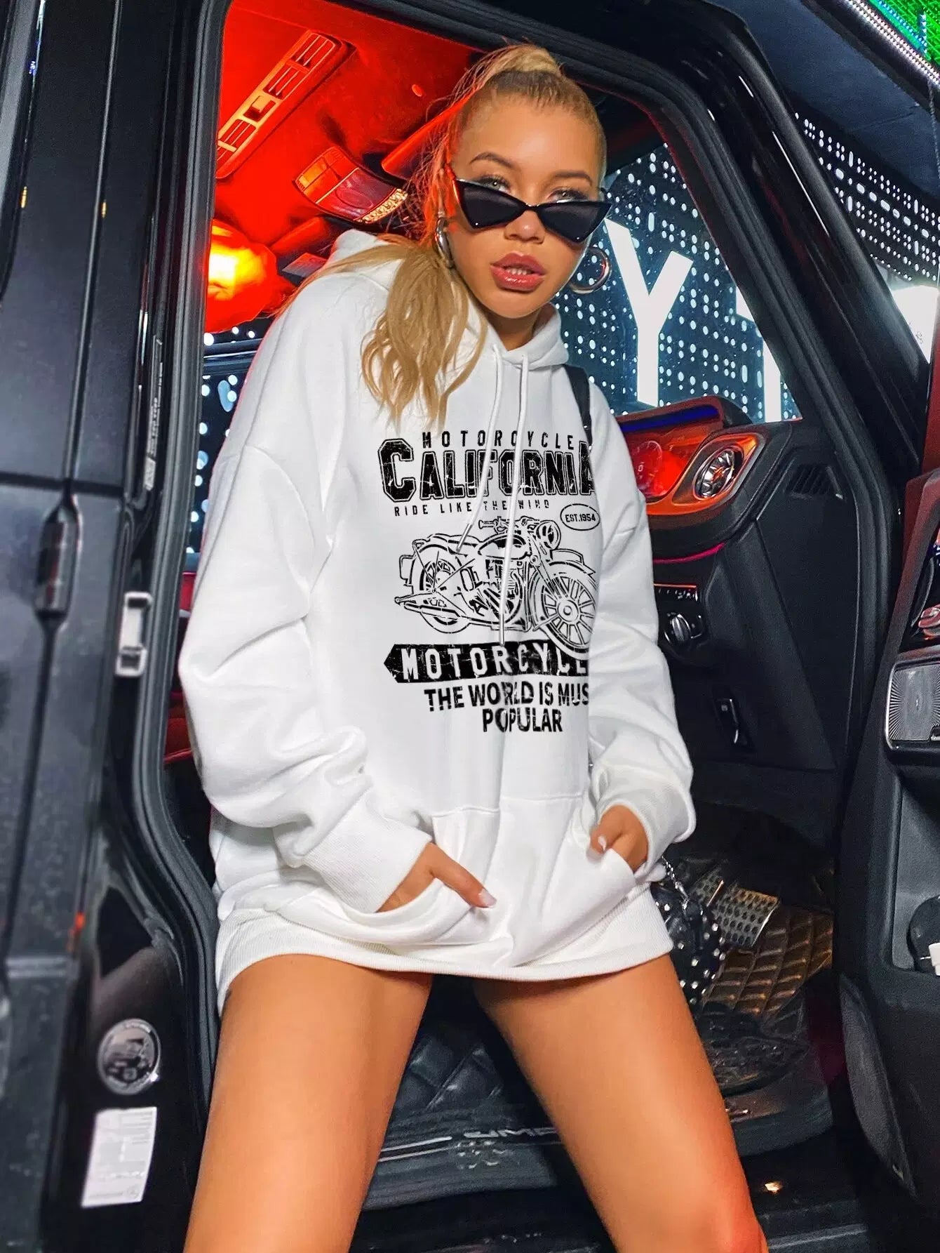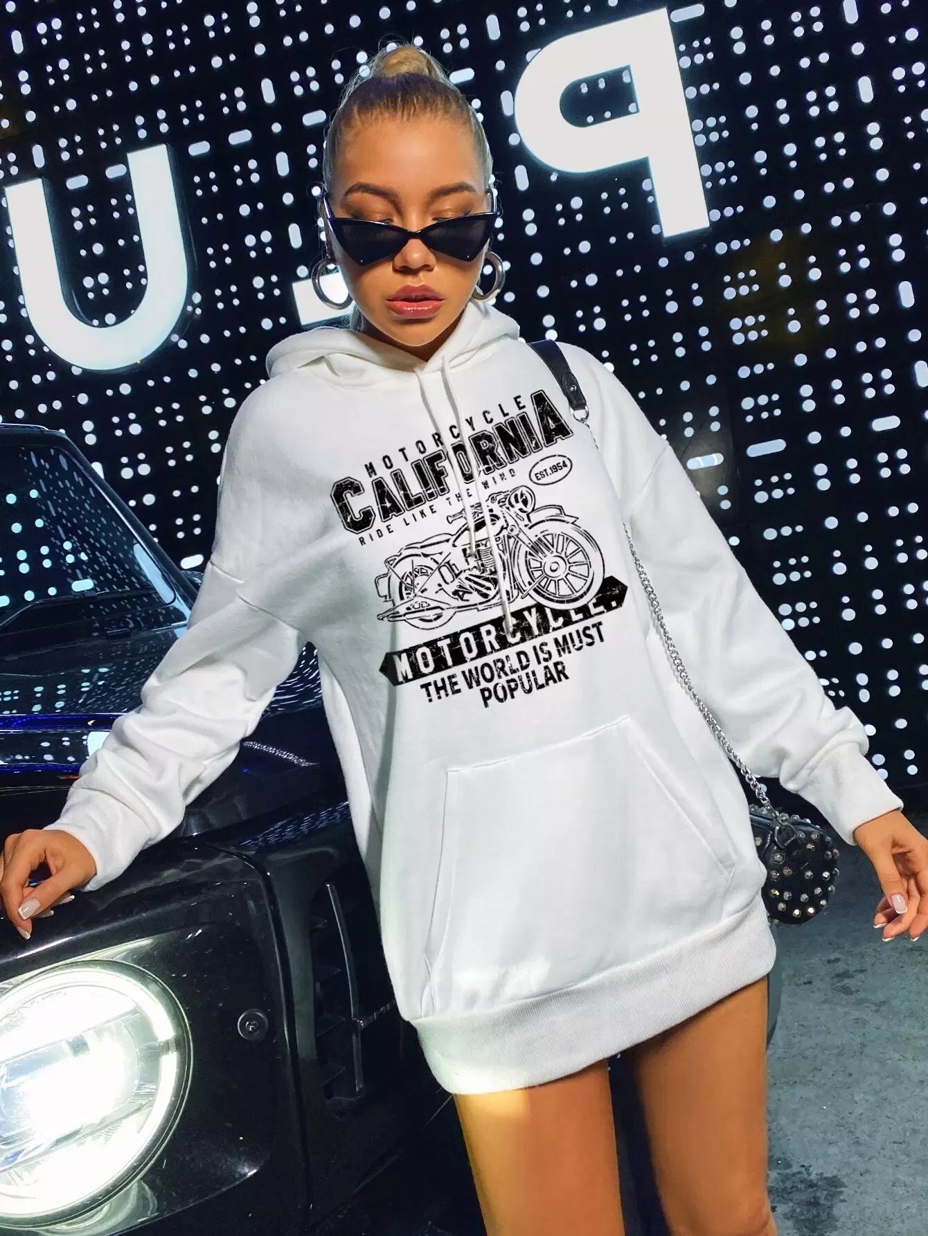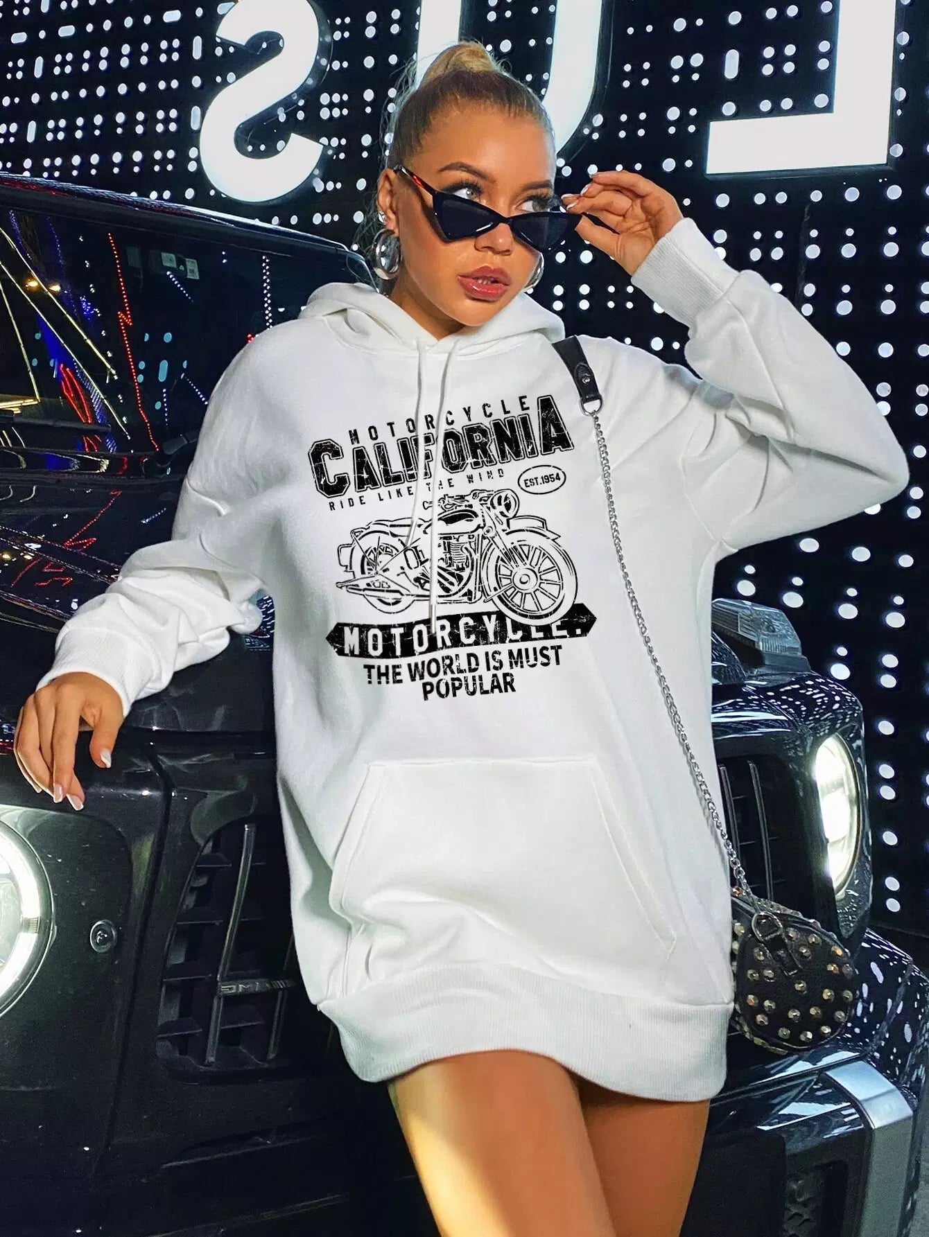 Motorbike And Letter Graphic Kangaroo Pocket Oversized Hoodie