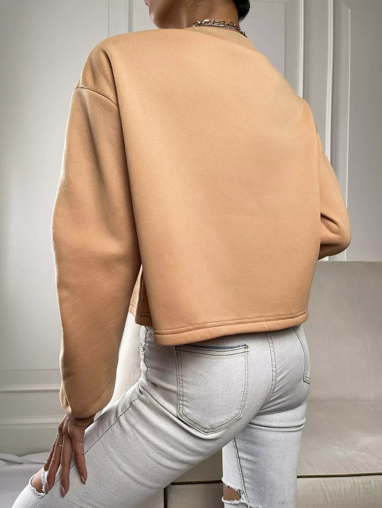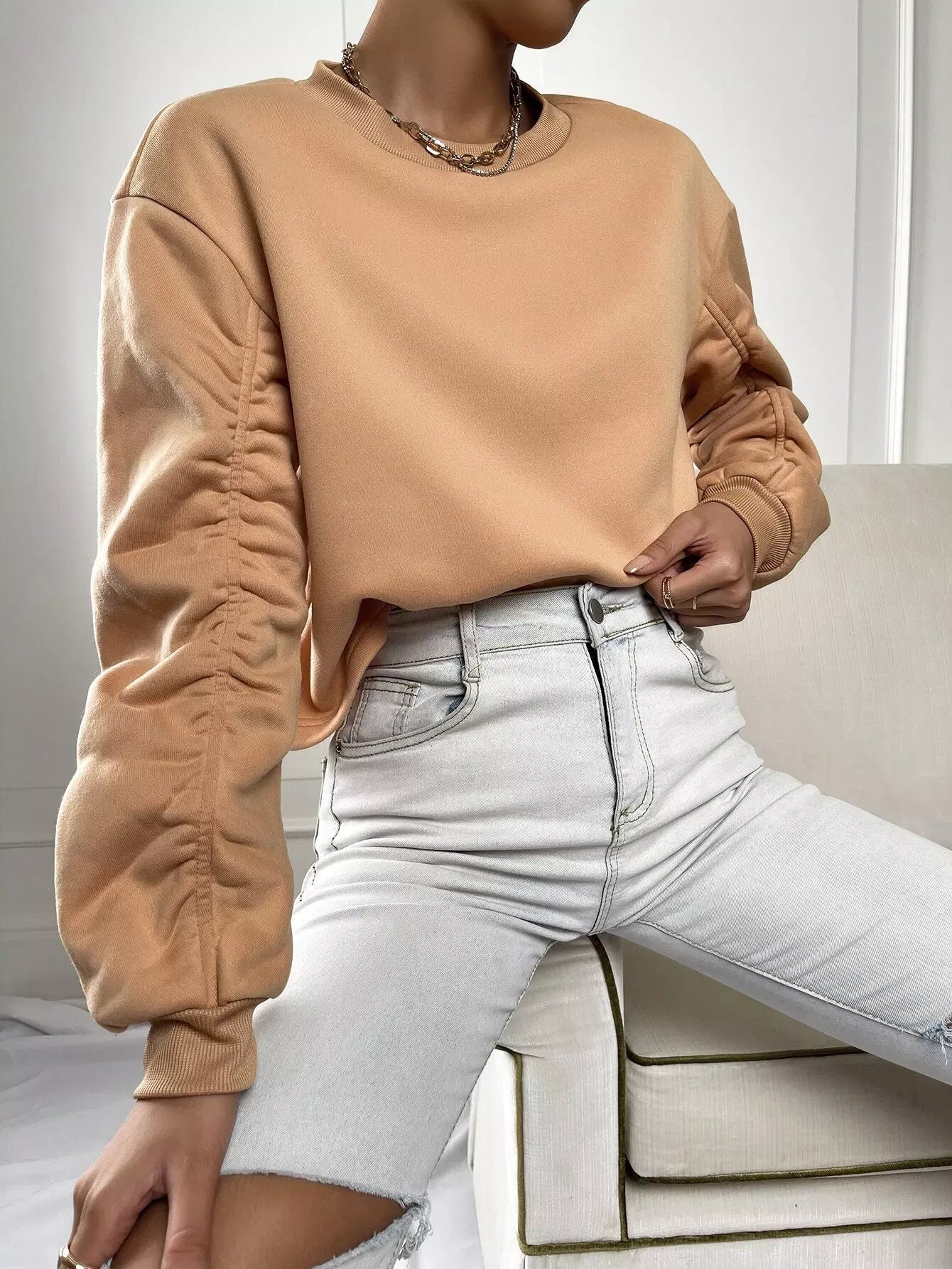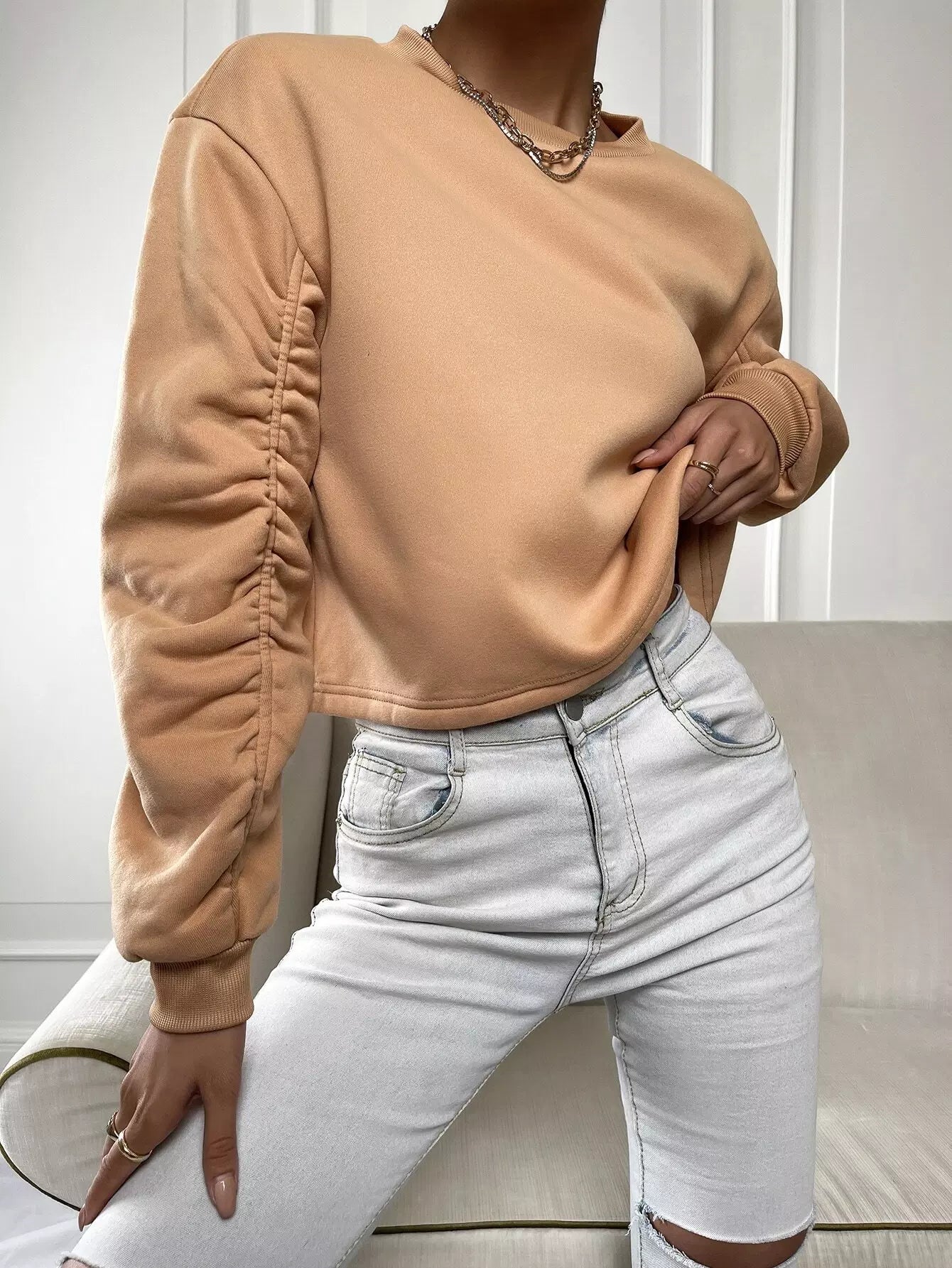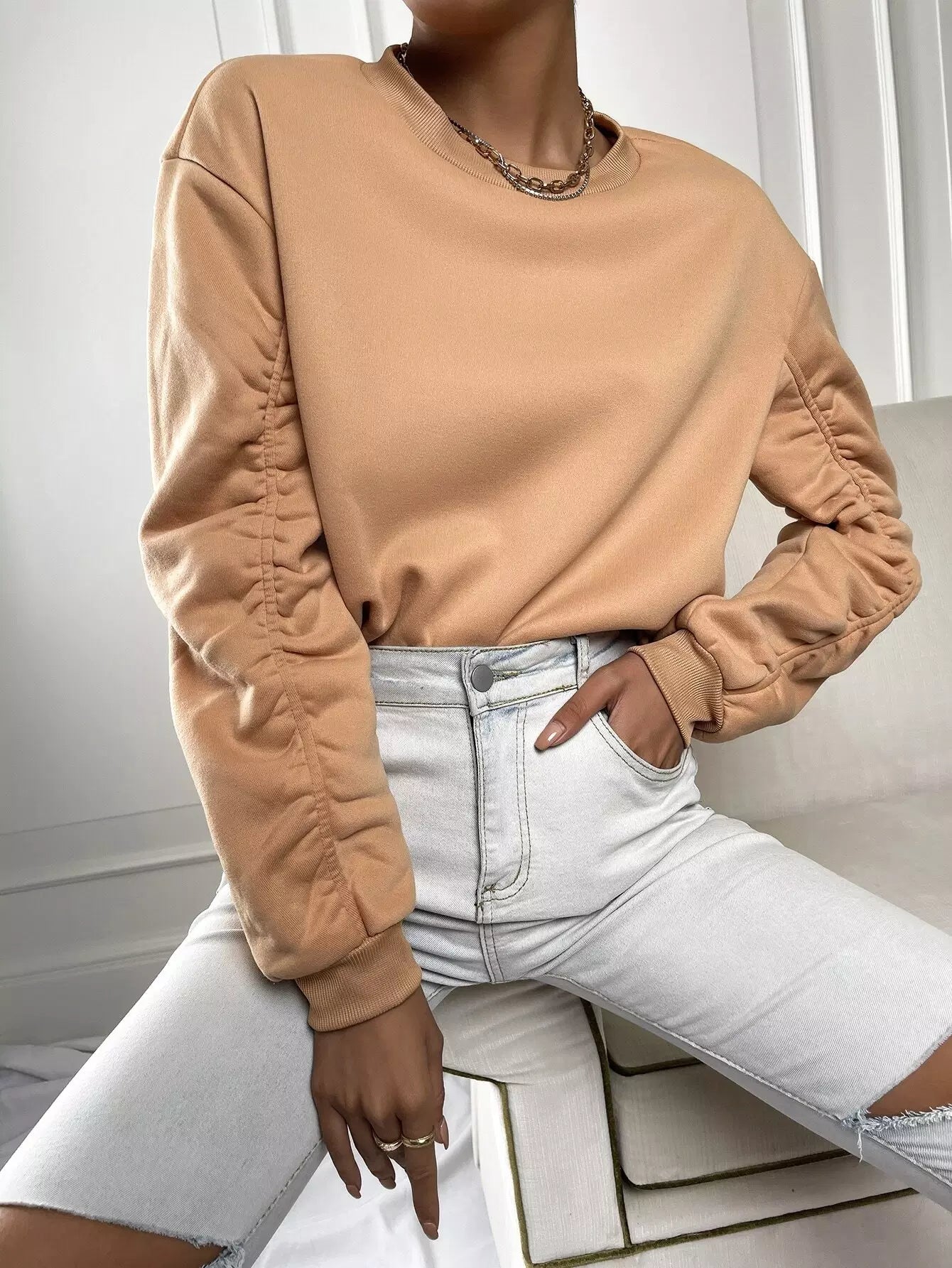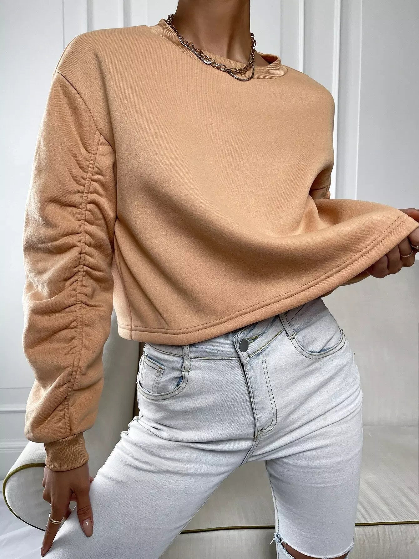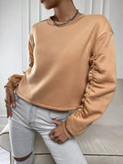 Solid Ruched Drop Shoulder Sweatshirt