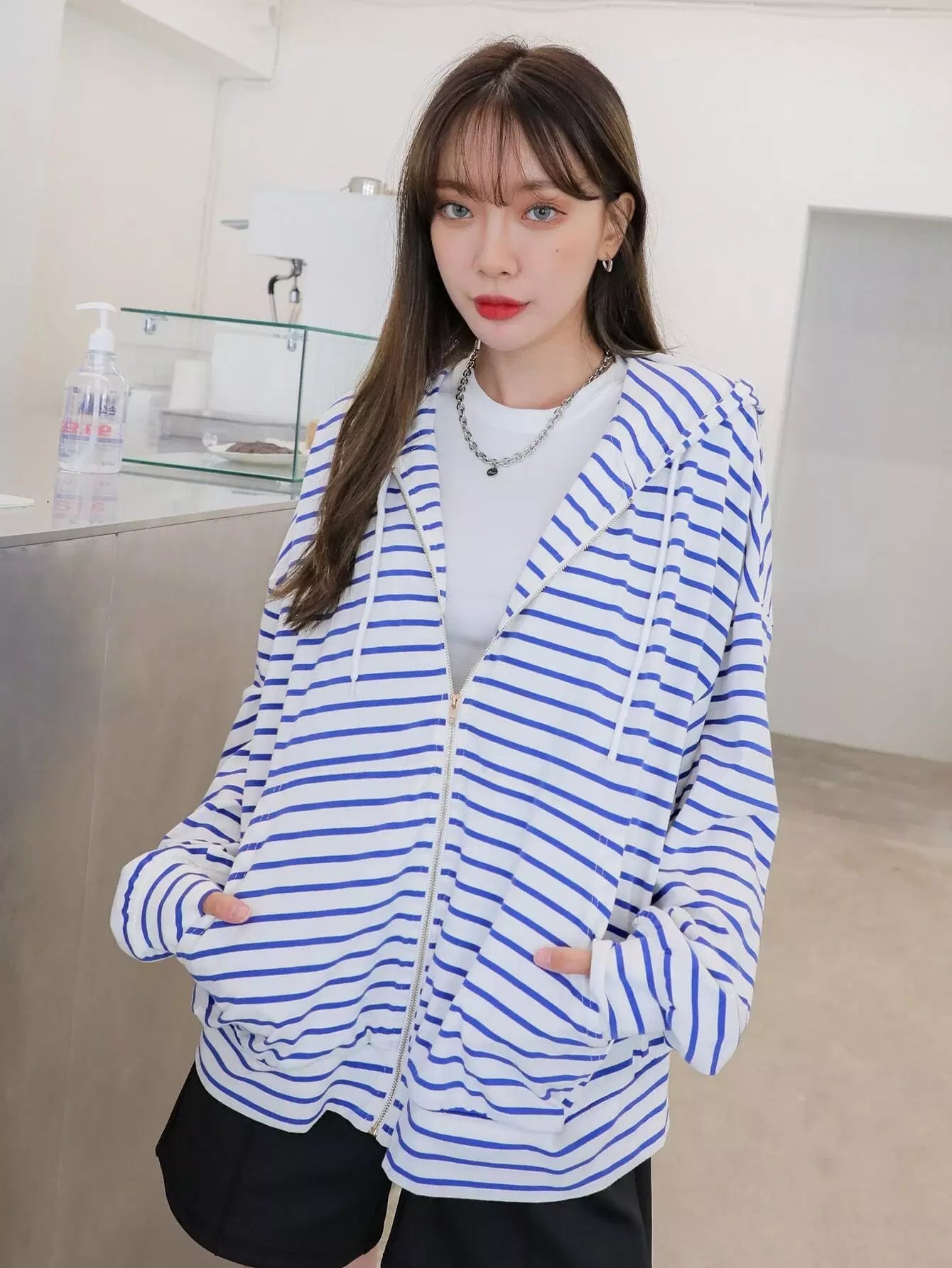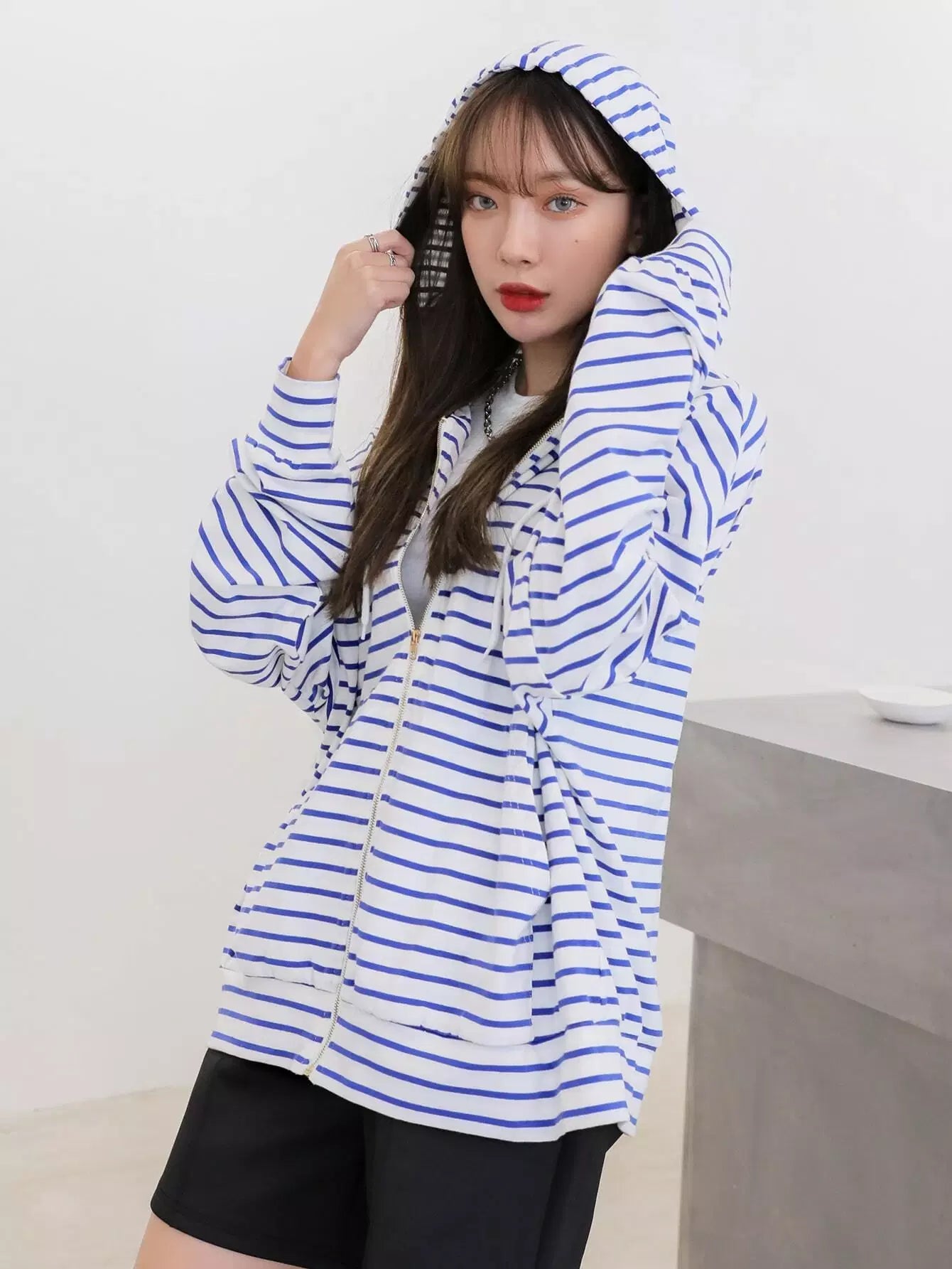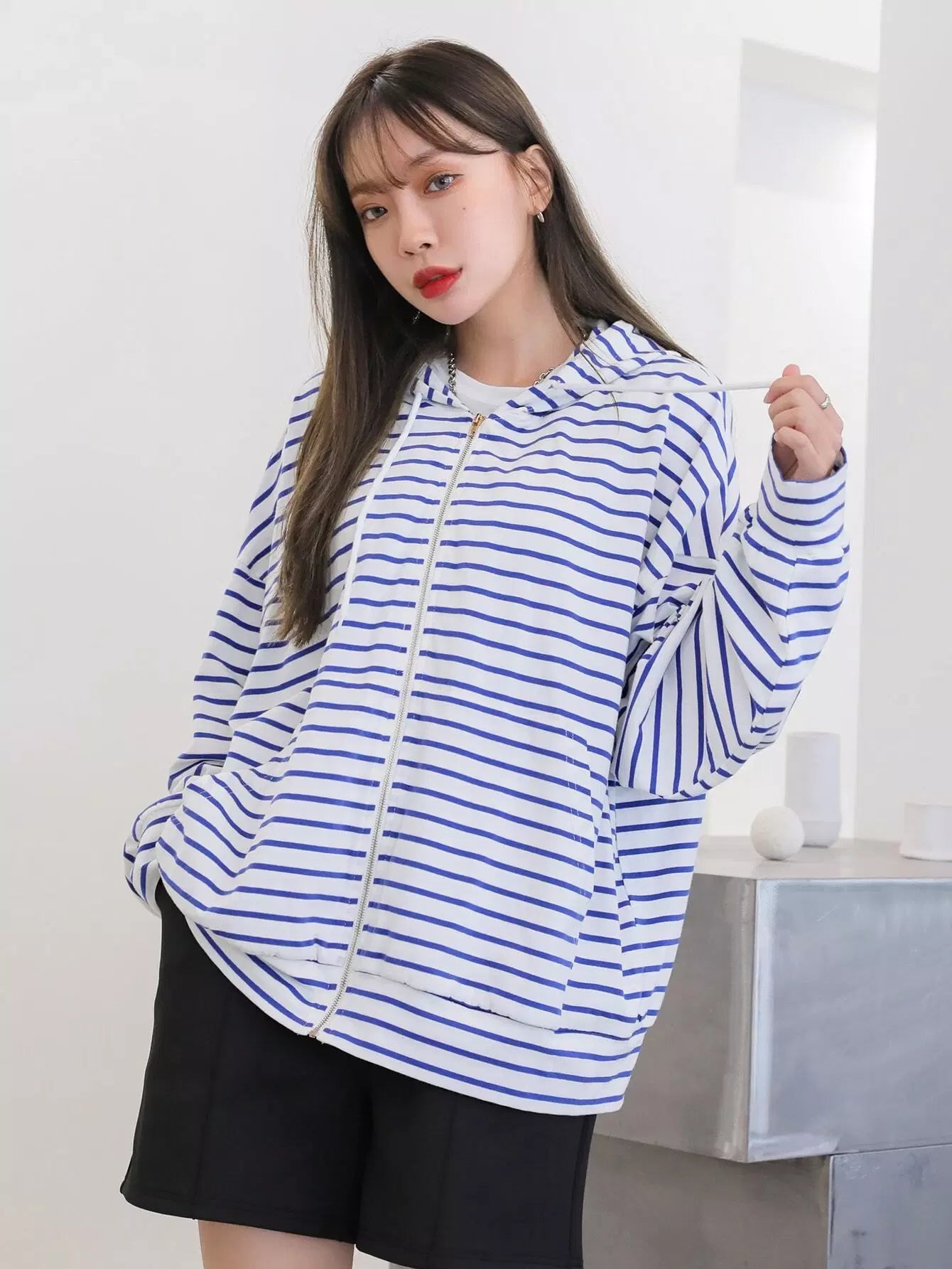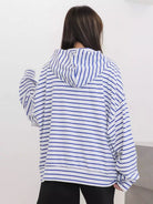 Striped Zip Up Drop Shoulder Drawstring Hoodie
