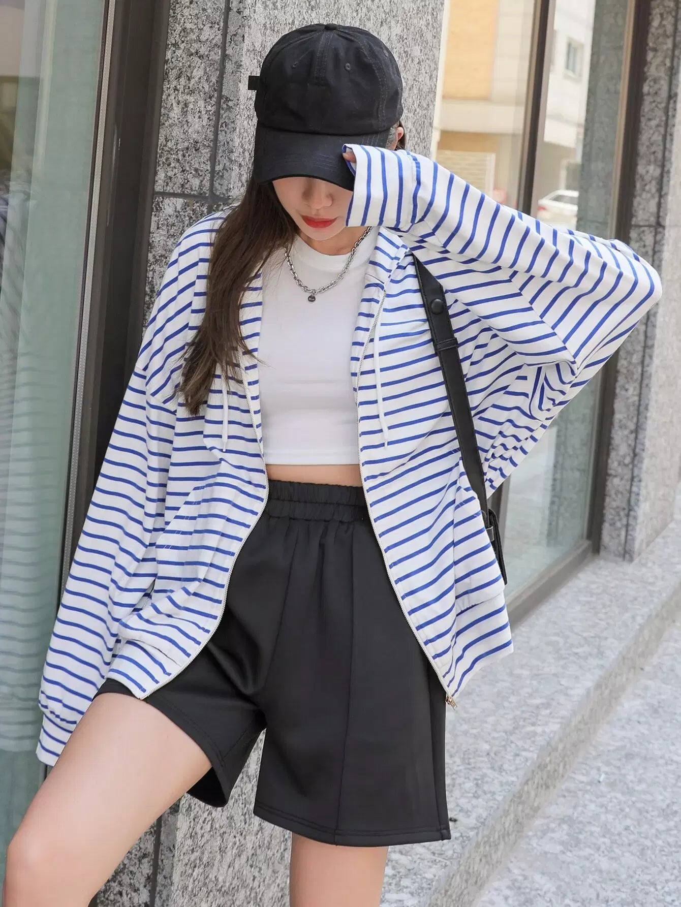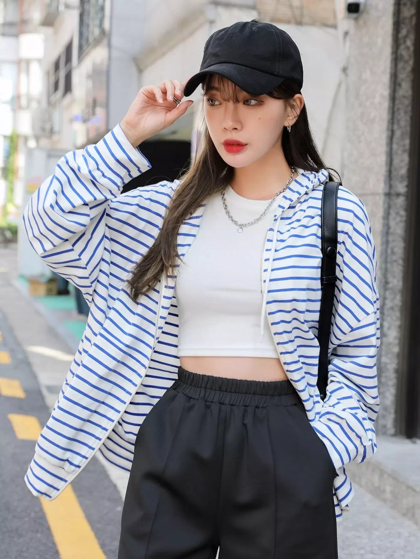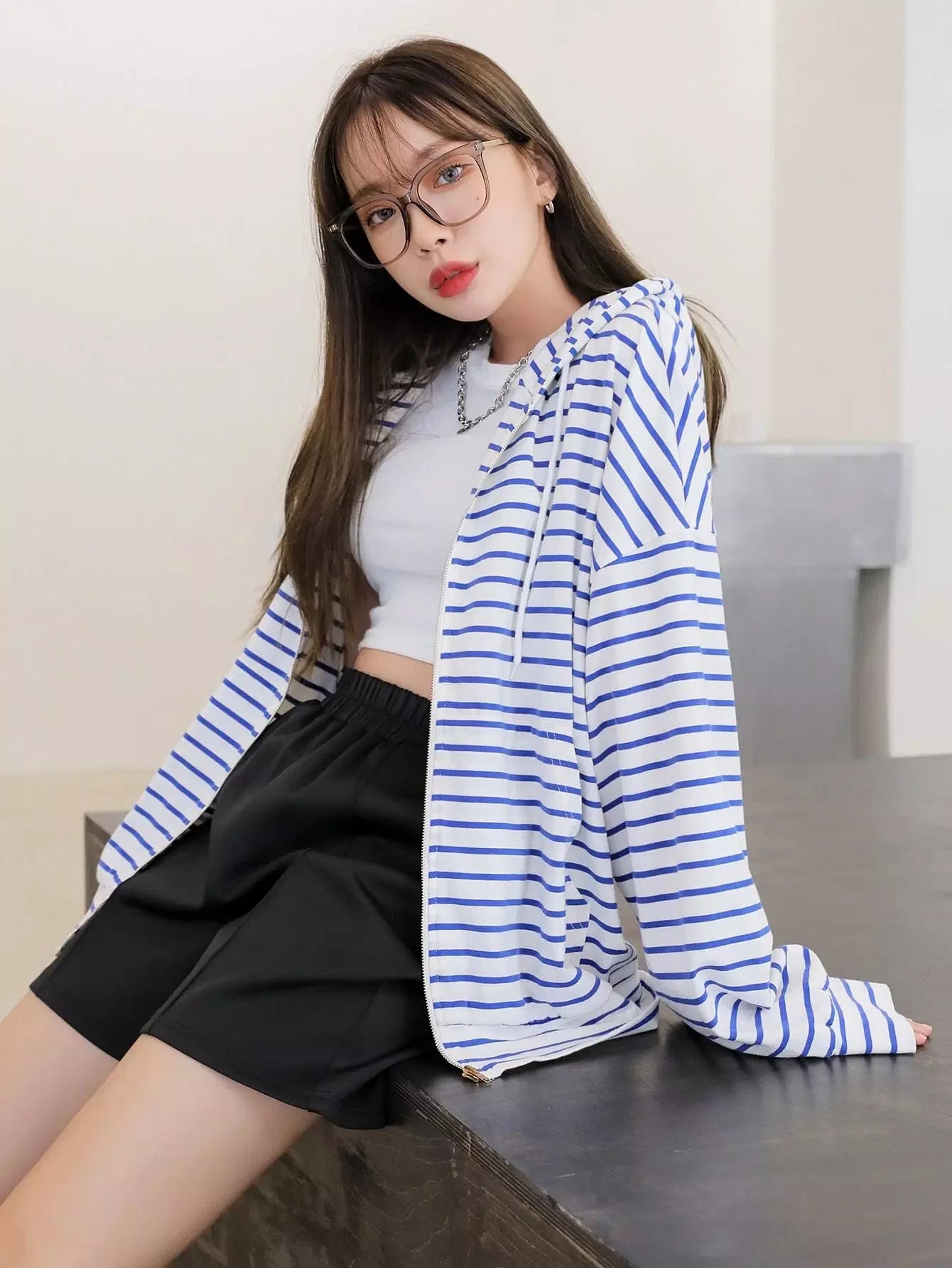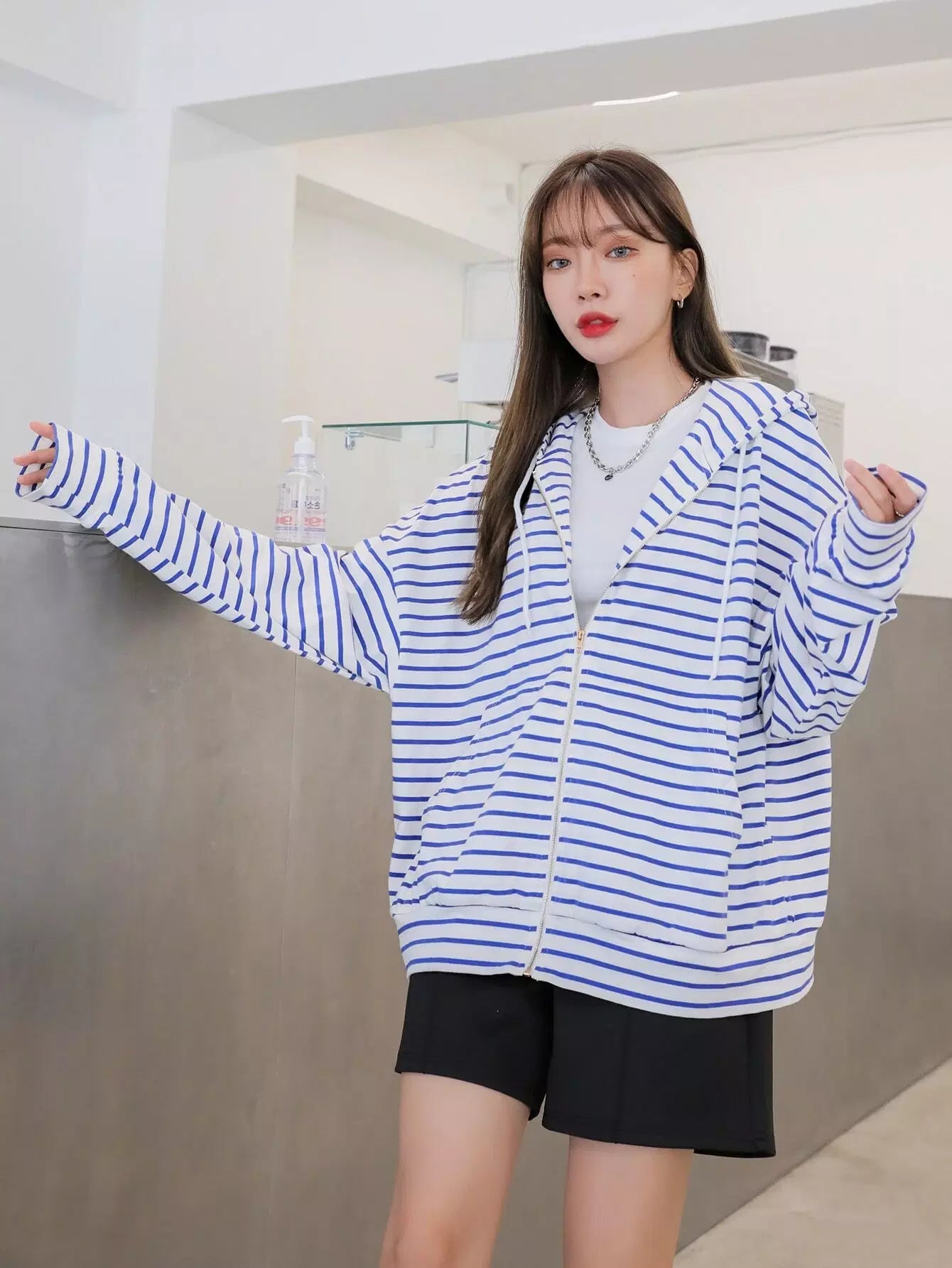 Striped Zip Up Drop Shoulder Drawstring Hoodie