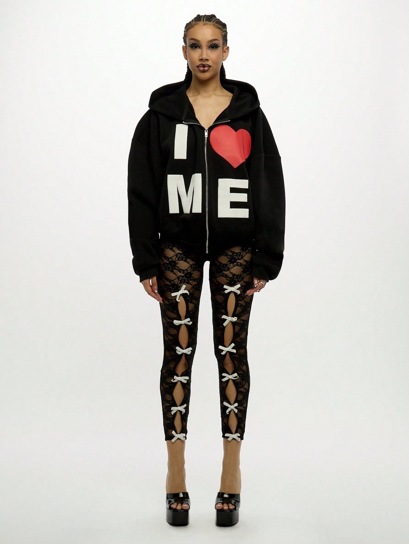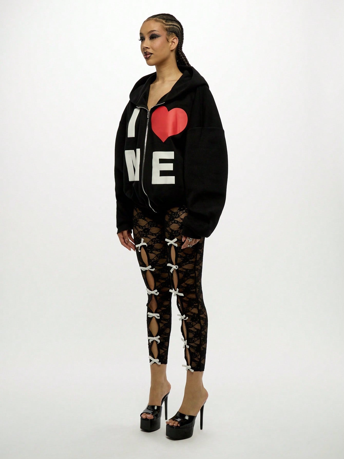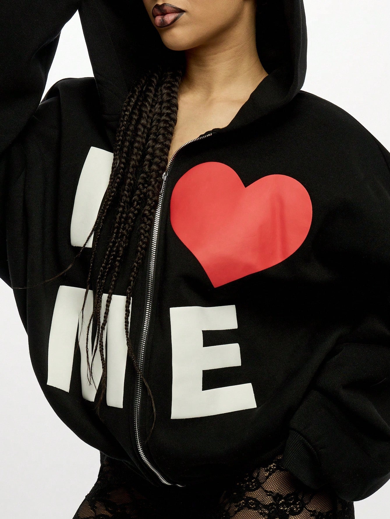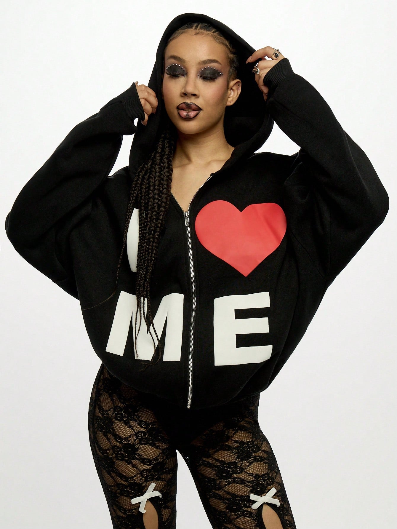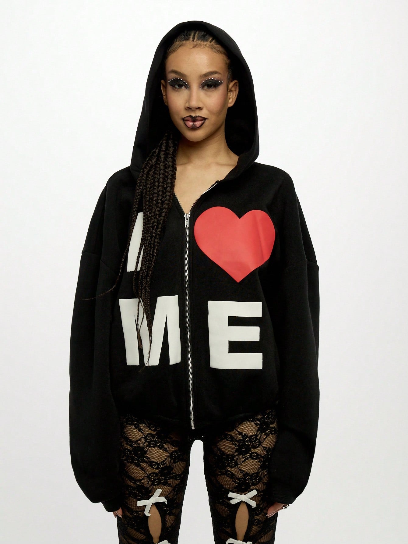 SUMWON WOMEN Oversized Full-Zip Statement Heart Hoodie Sweatshirt Winter Cozy Casual Streetwear Graphic