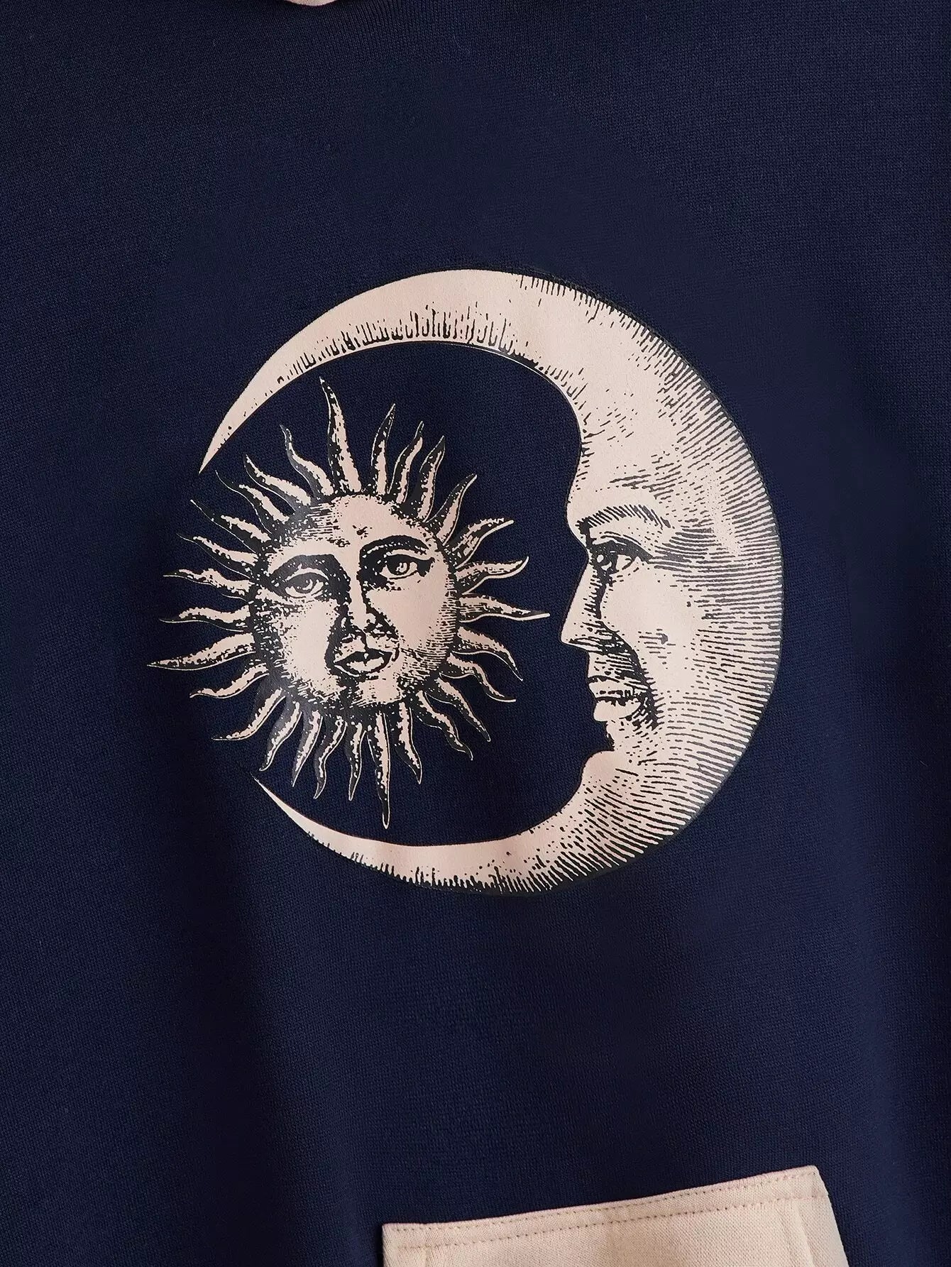 Sun & Moon Print Kangaroo Pocket Drop Shoulder Thermal Hoodie