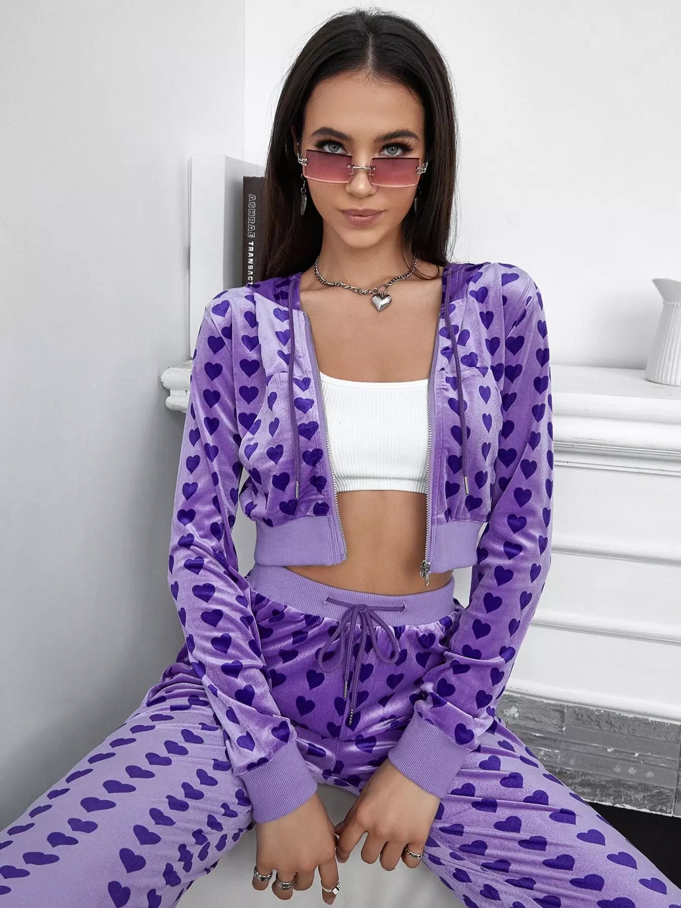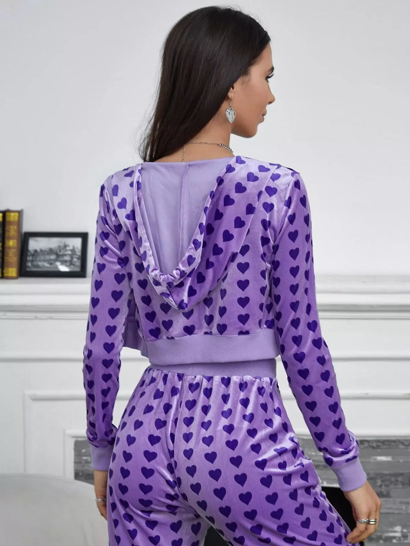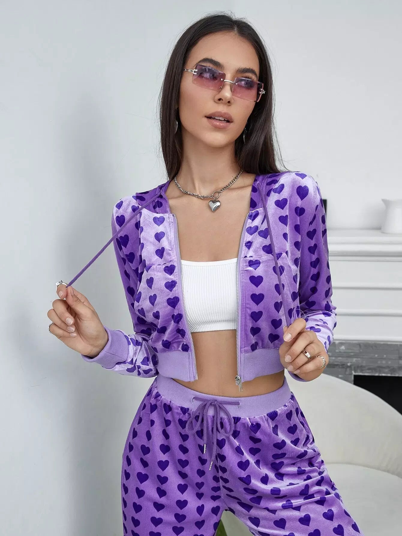 Zip Up Drawstring Heart Graphic Crop Velvet Hoodie