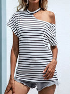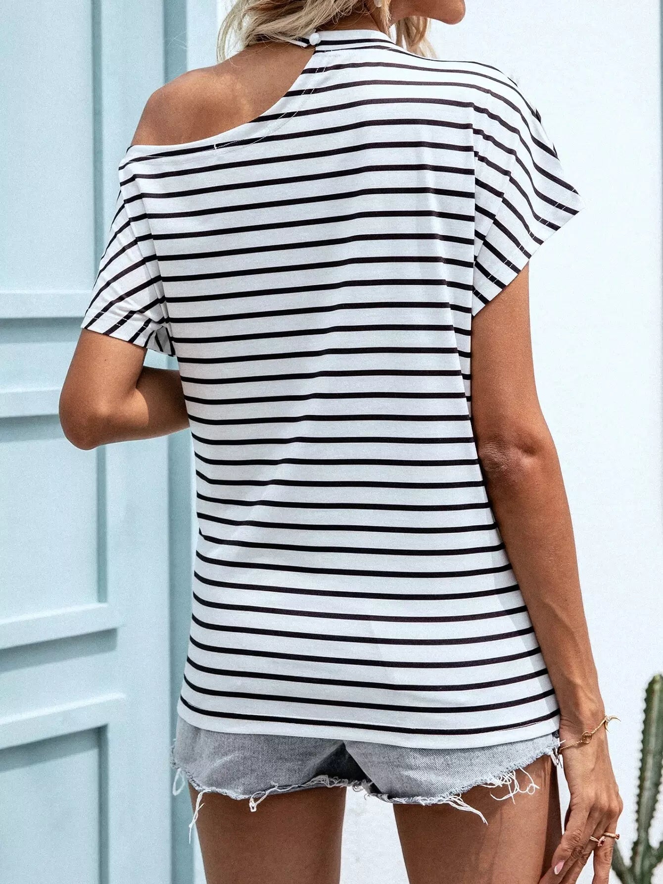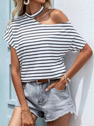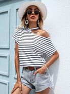 Asymmetrical Neck Batwing Sleeve Striped Tee