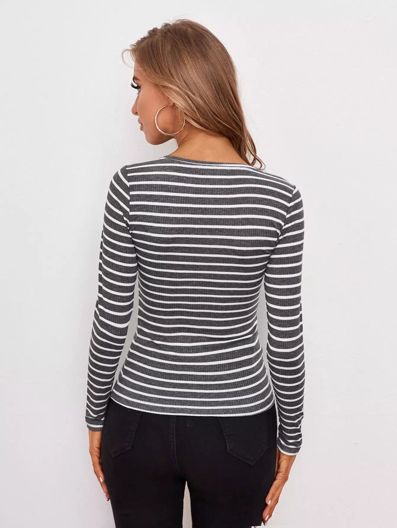 Women - Button Half Placket Striped Tee