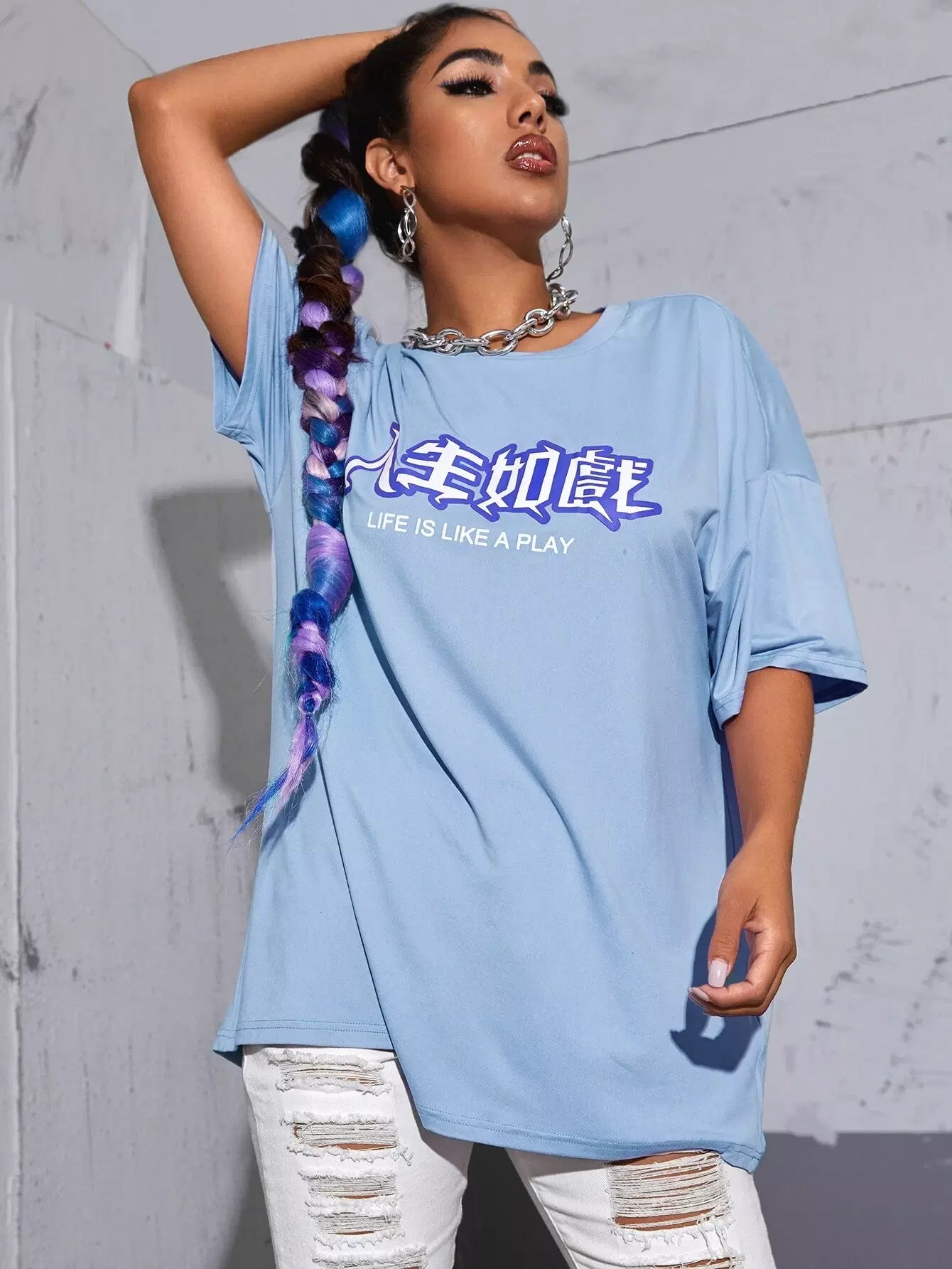 Chinese Slogan Graphic Drop Shoulder Oversized Tee