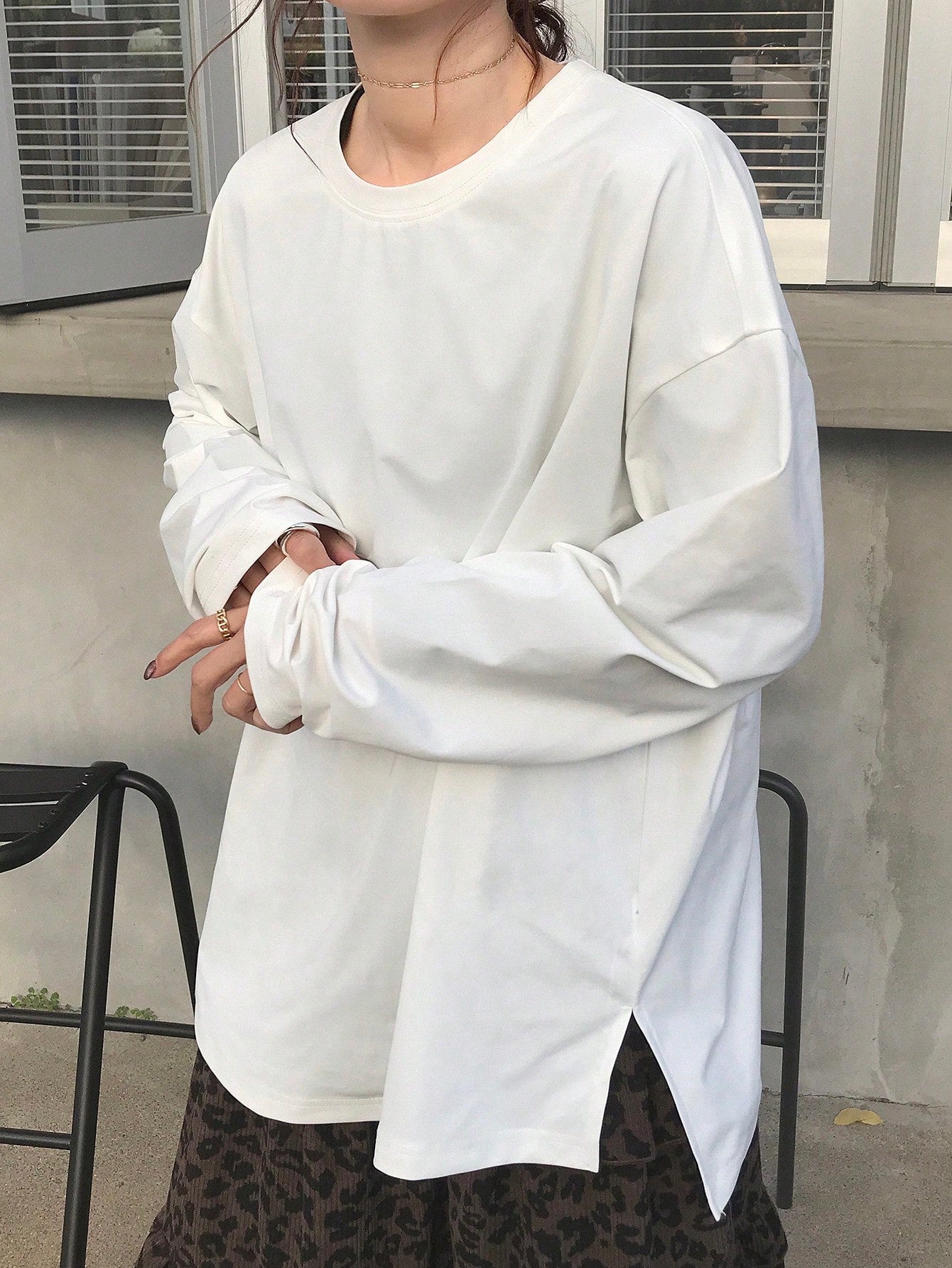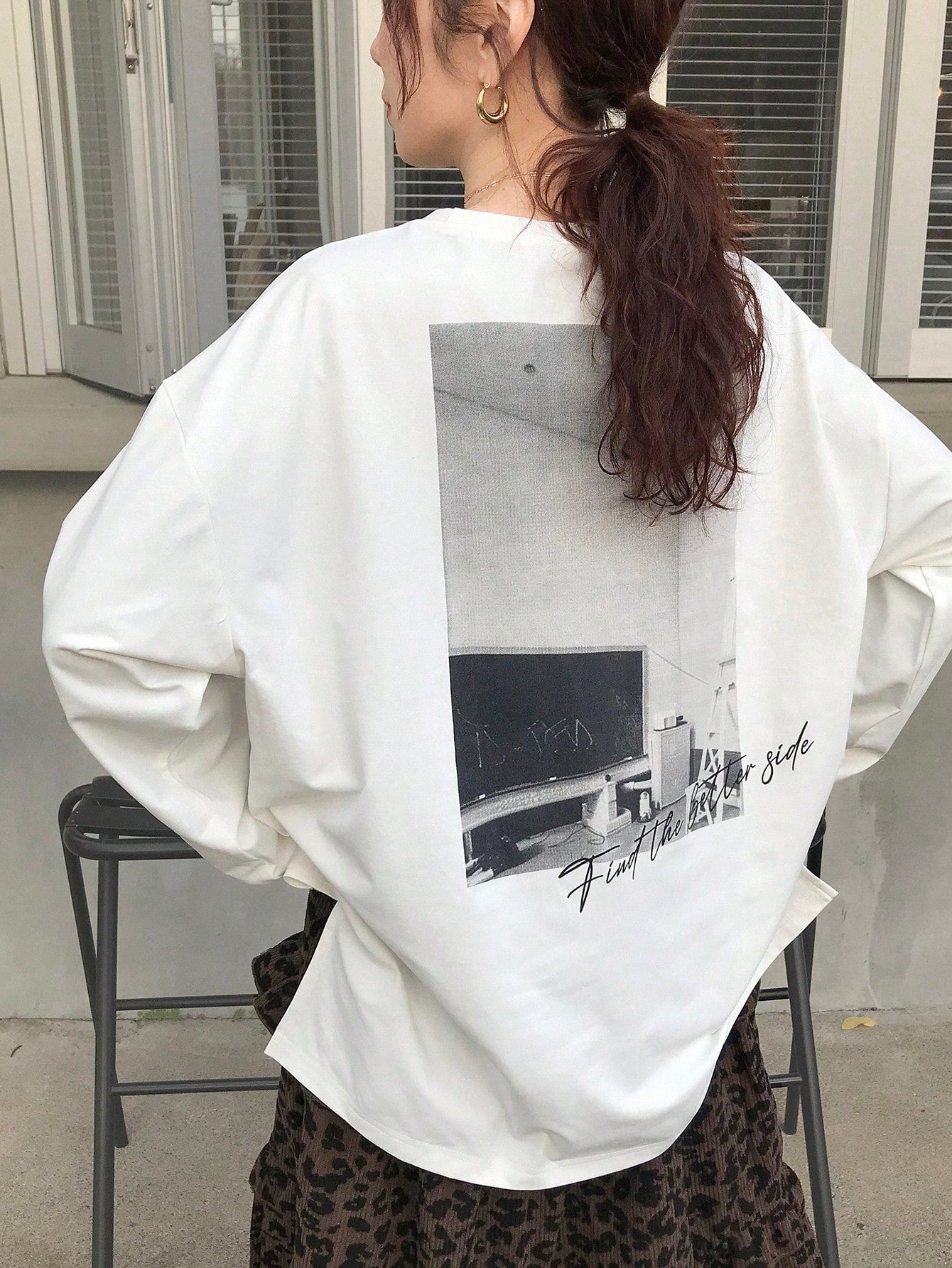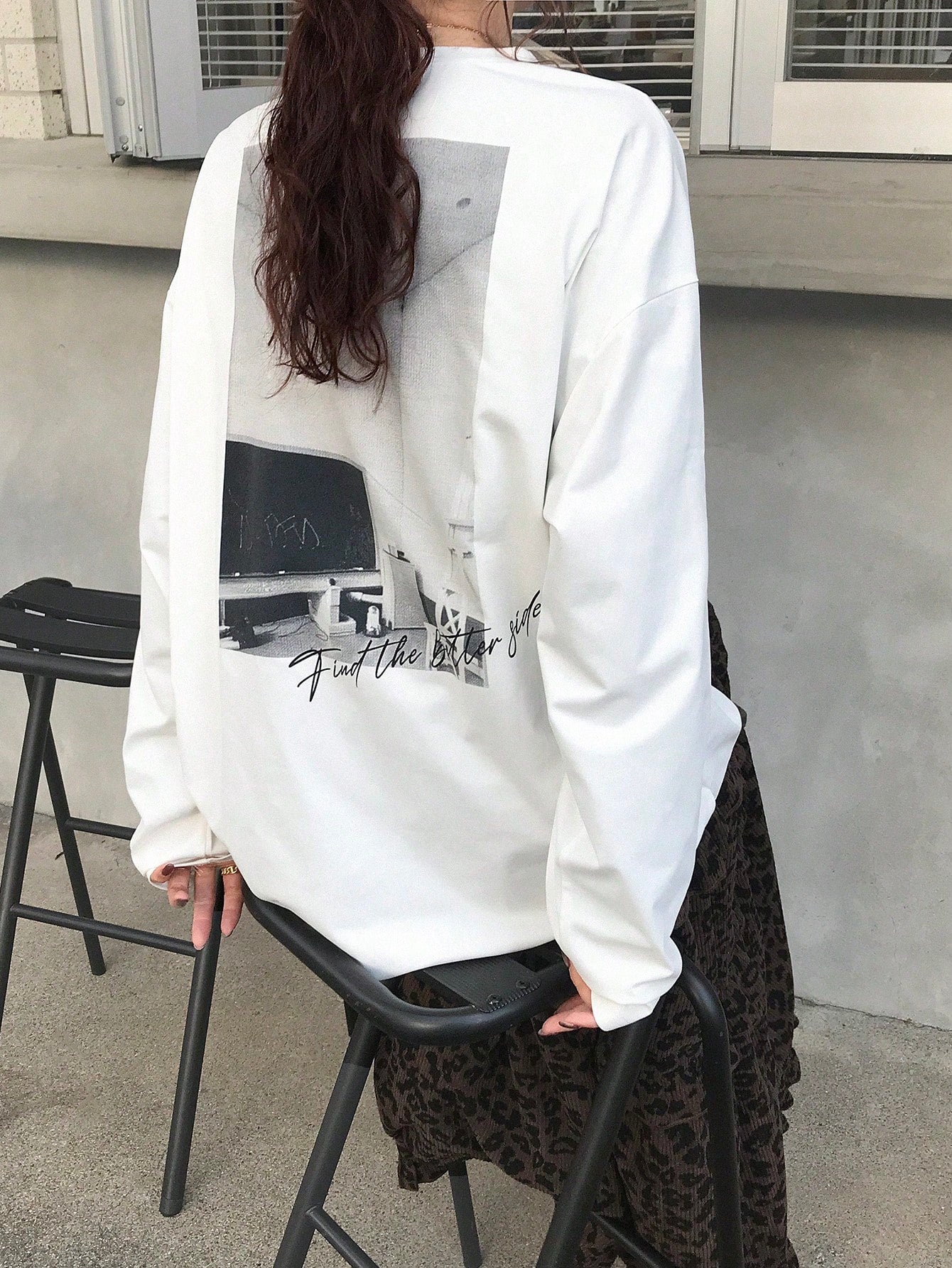 FRIFUL Women Loose Fit White Graphic Long Sleeve T-Shirt, Spring,Fall Clothes