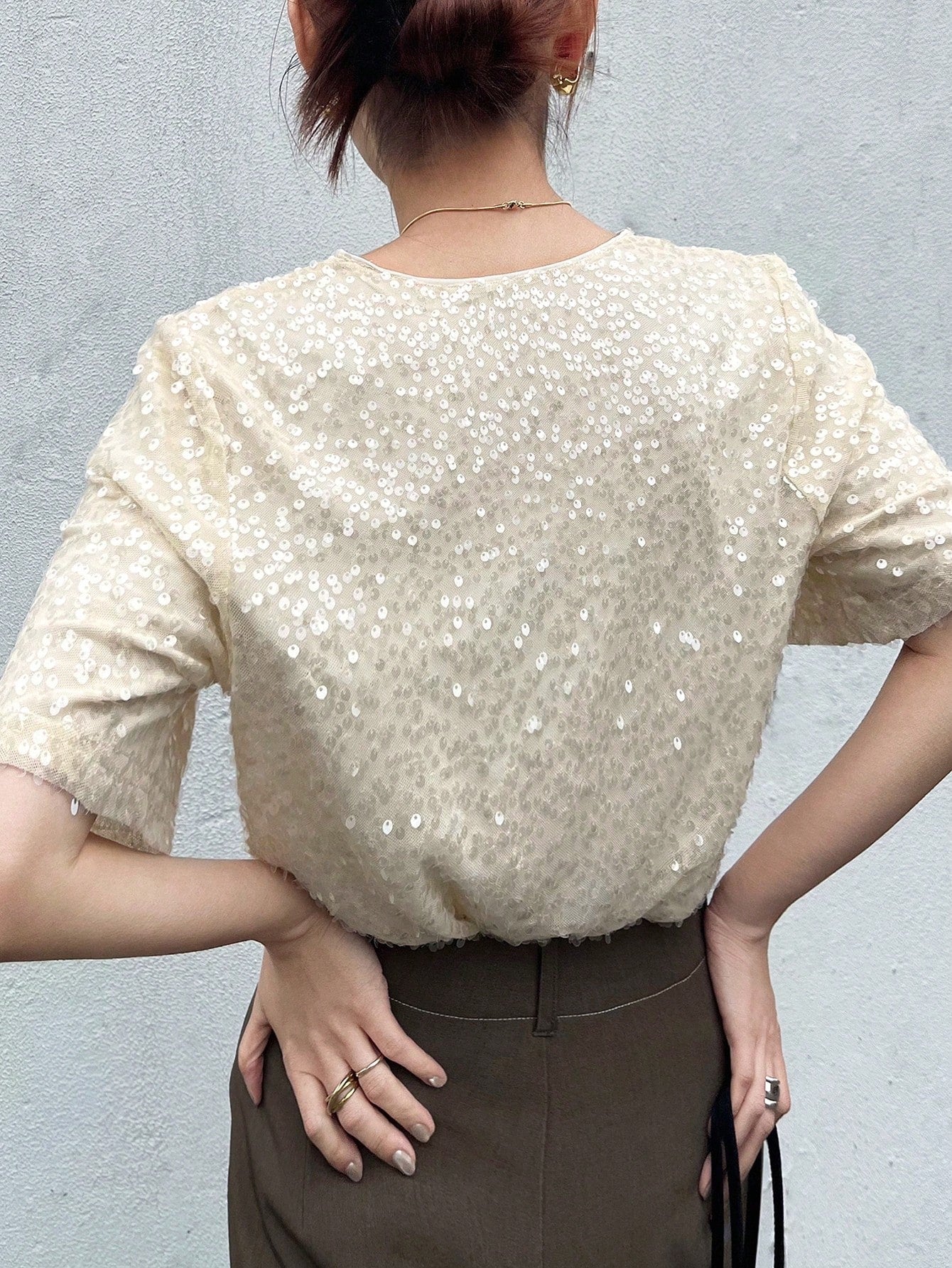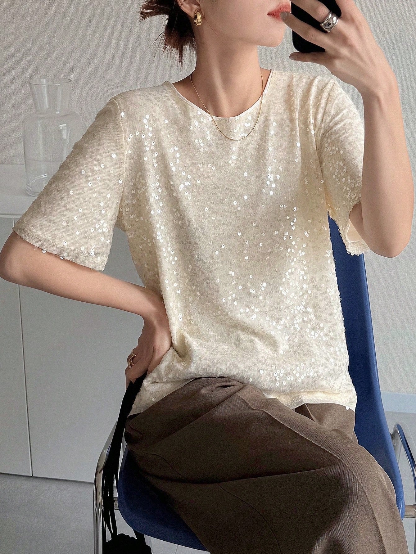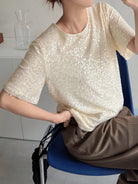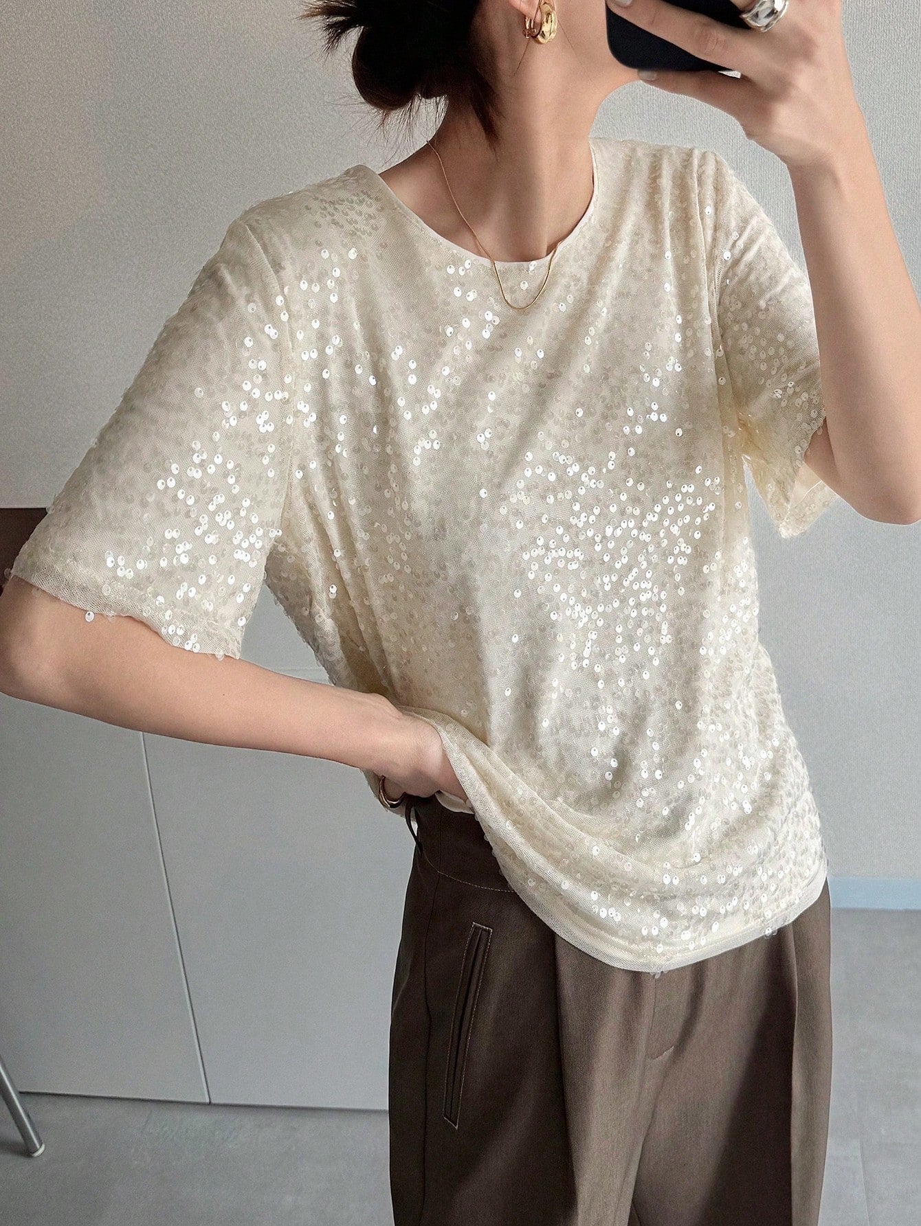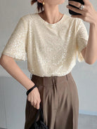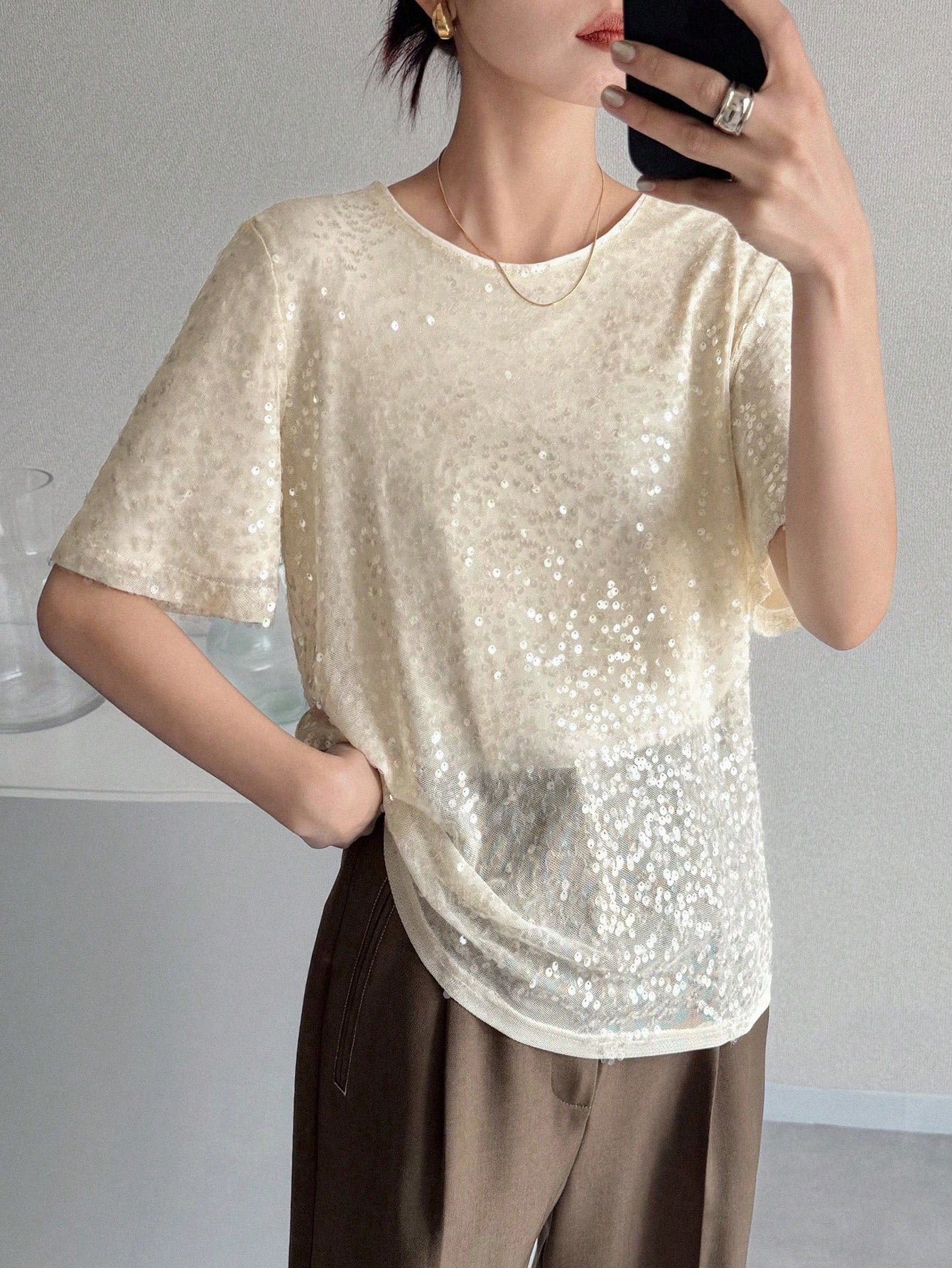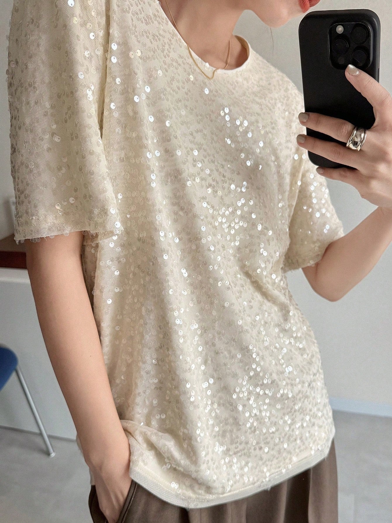 FRIFUL Women's Loose Sequined Mesh Round Neck Short Sleeve T-Shirt Top , Casual Beach Clothing For Summer