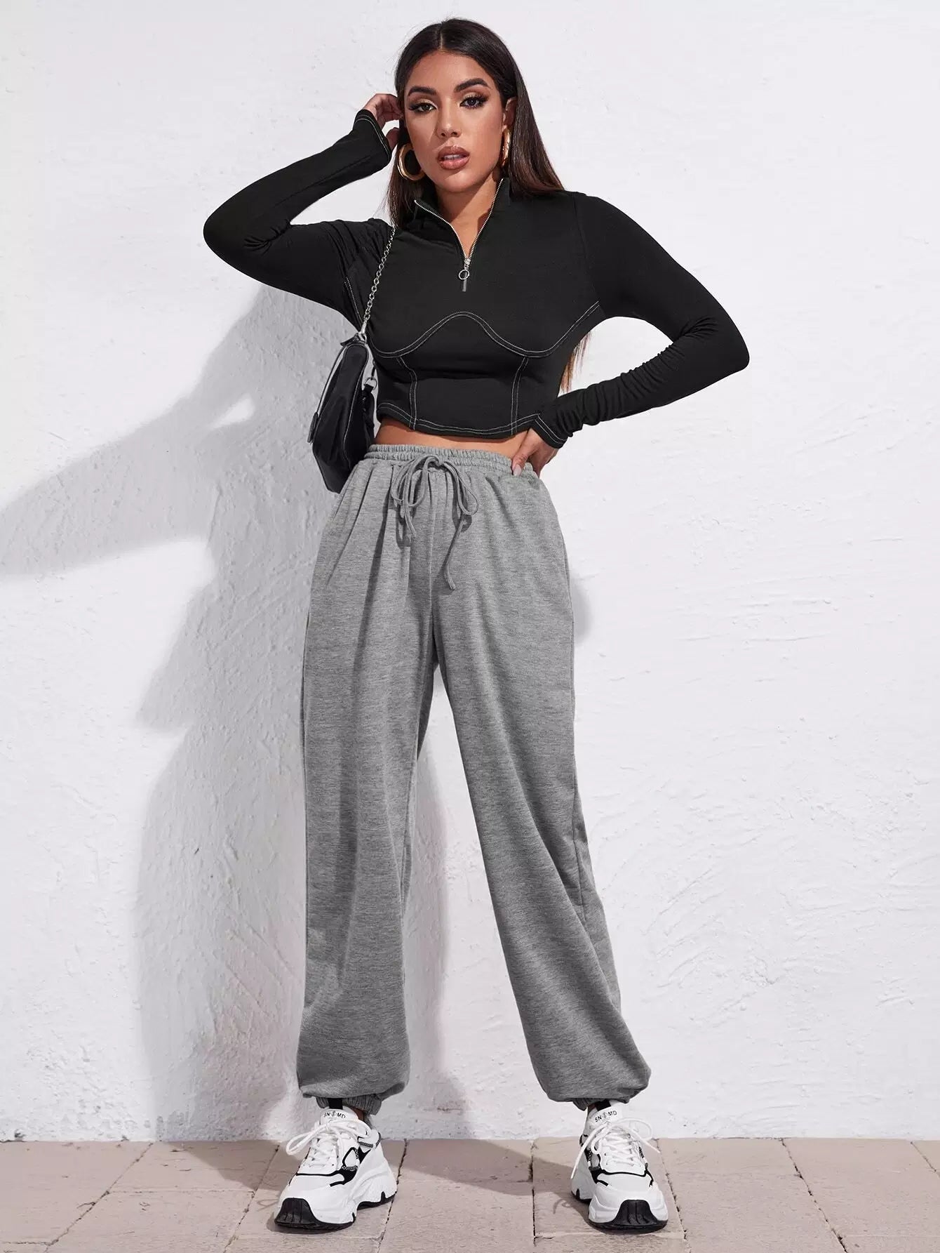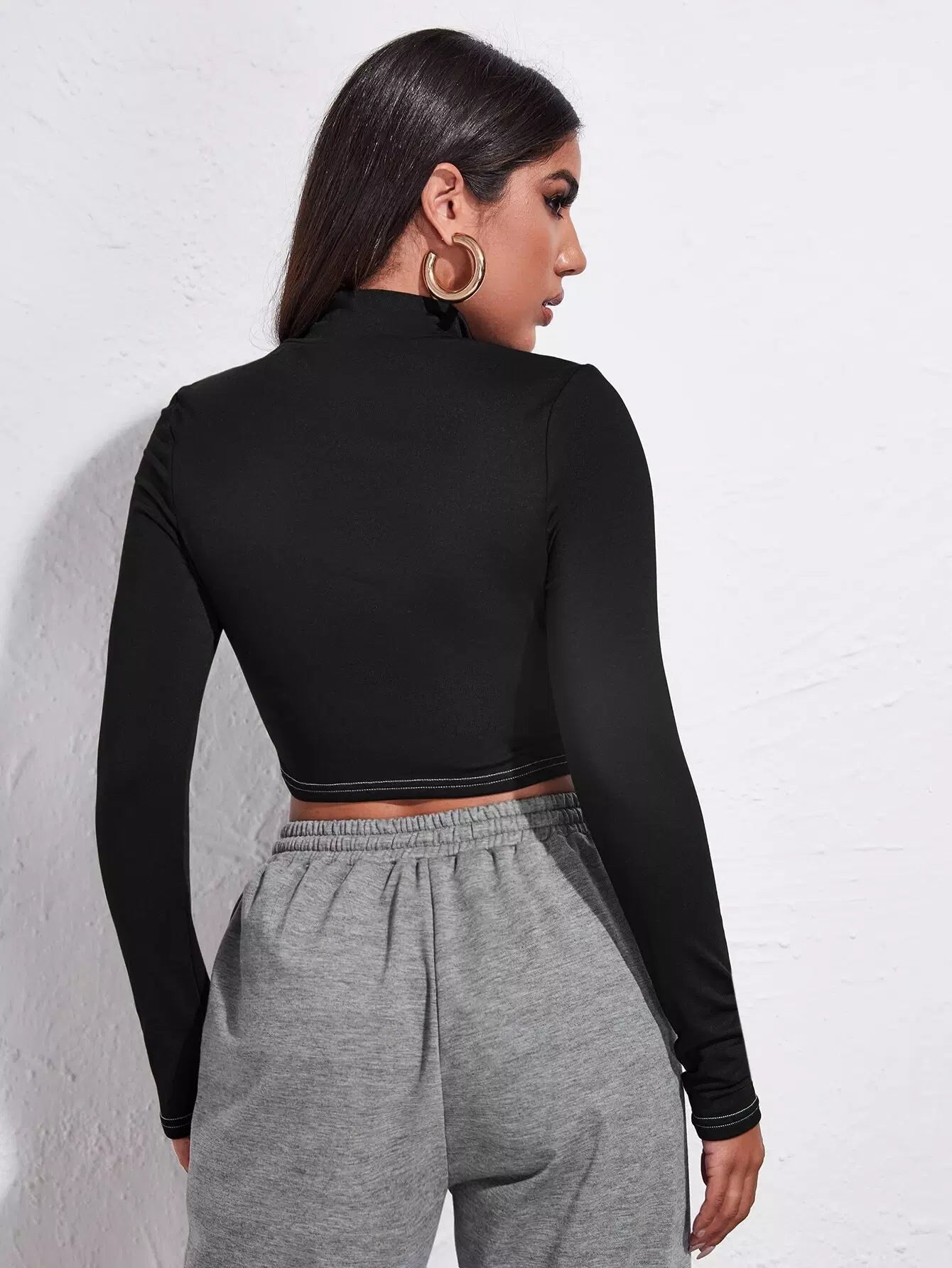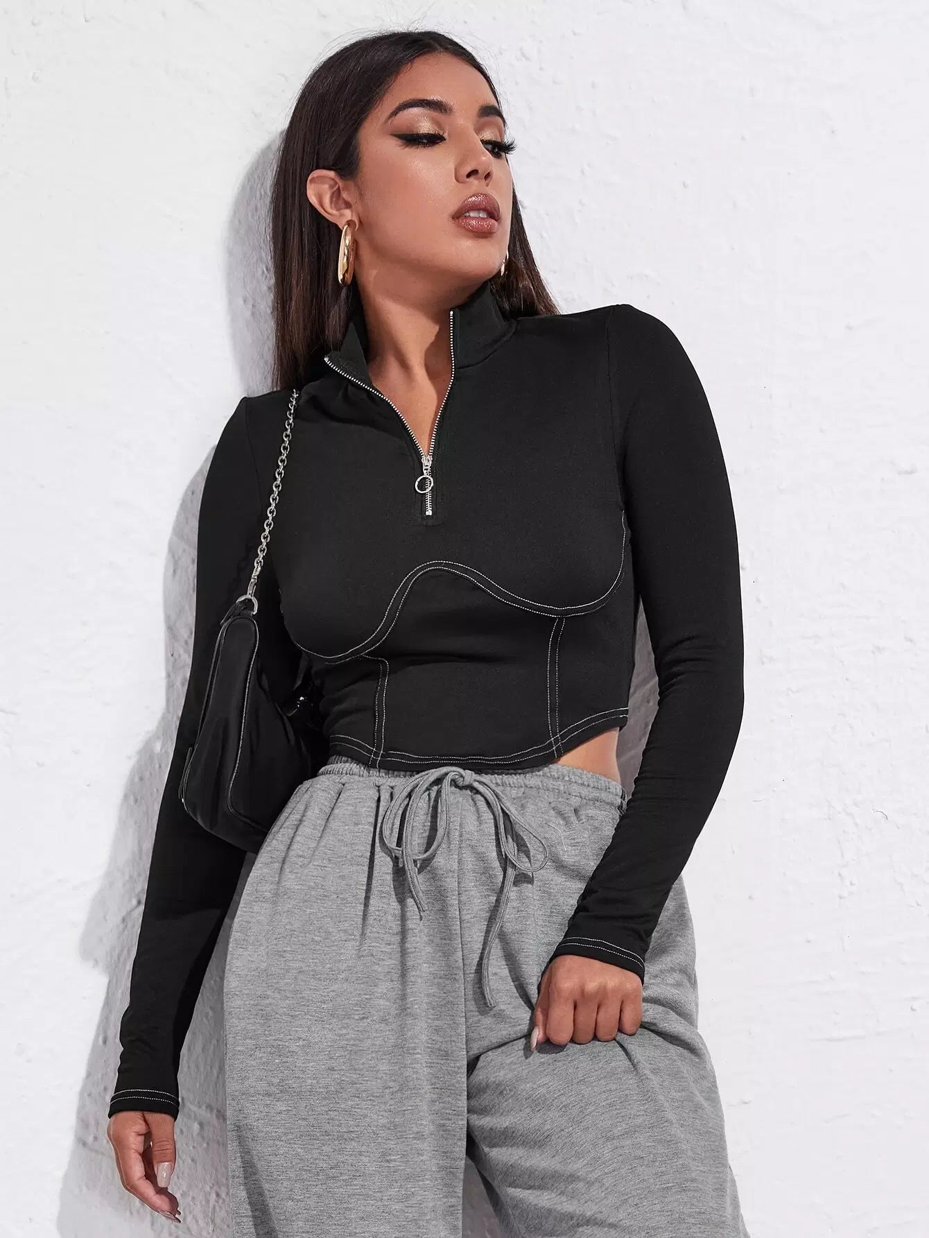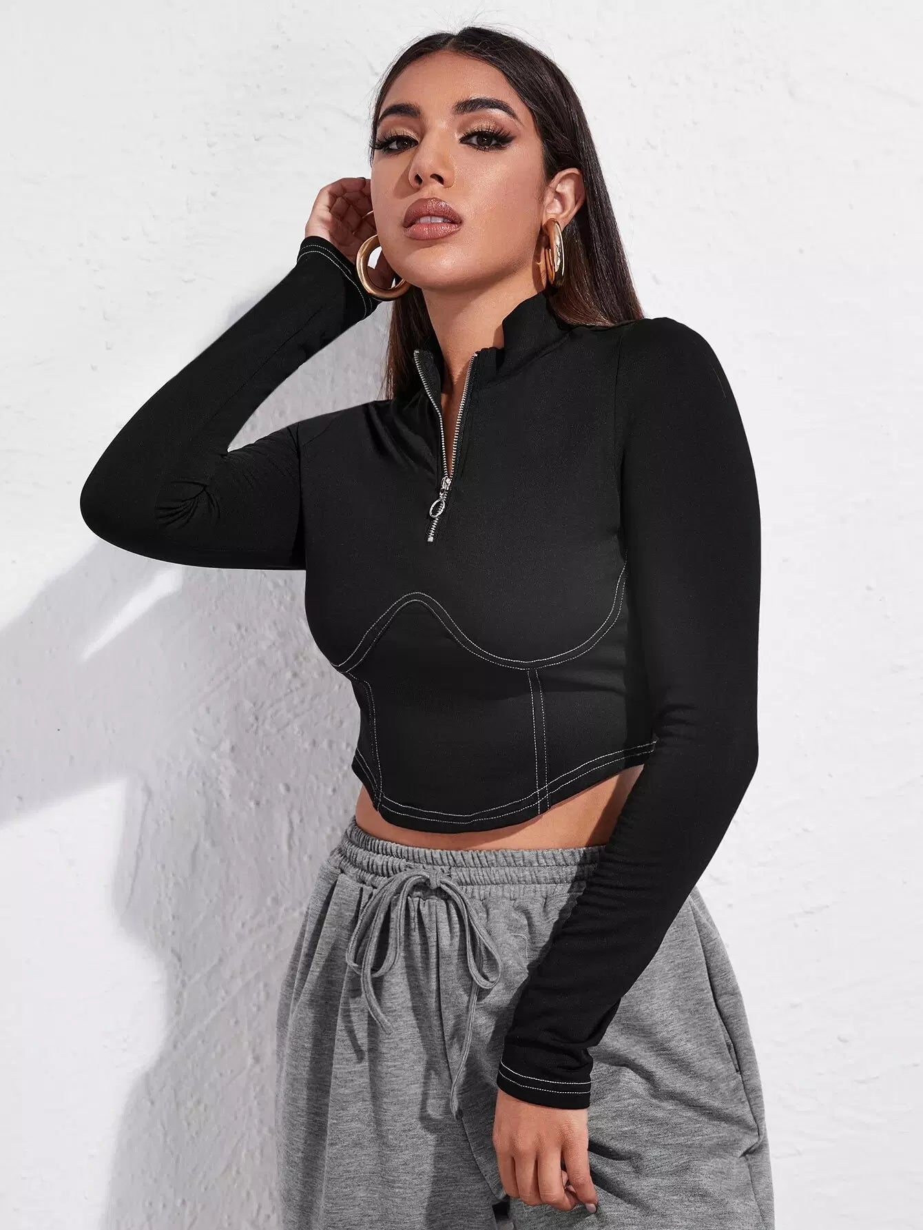 Half Zip Stitch Trim Crop Tee