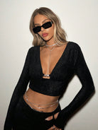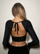 ICON Y2K Style V-Neck Tie Backless Sleeve Cut-Out Long Sleeve T-Shirt , Black Crop Top
