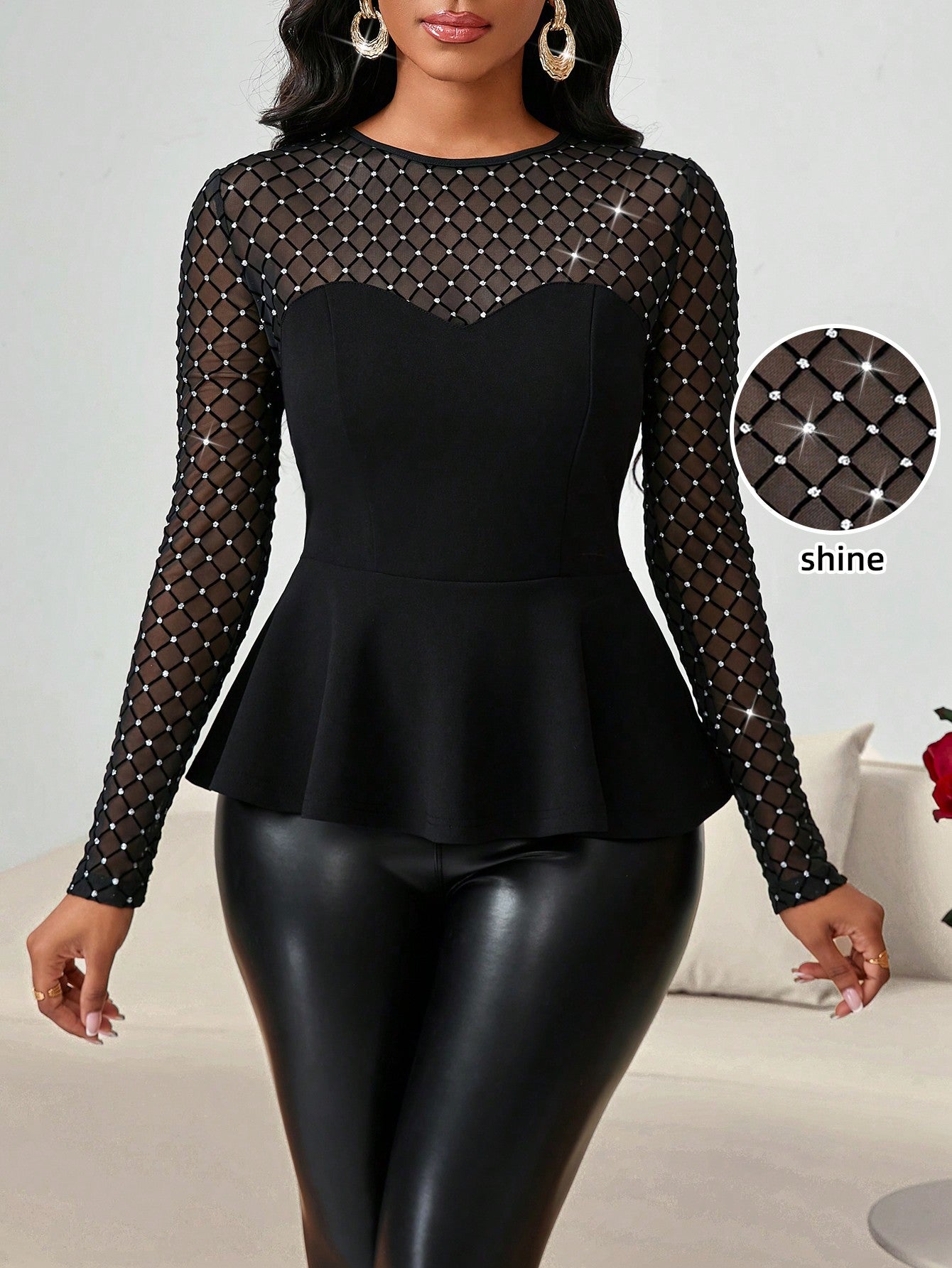 Lady Women's Elegant Rhinestone Mesh Splice T-Shirt Valentine's Day T-Shirt