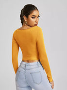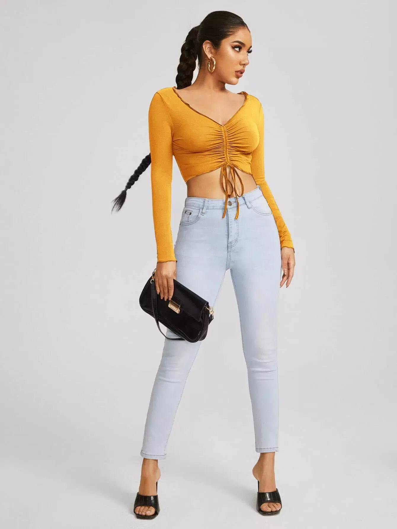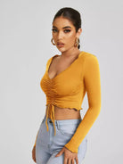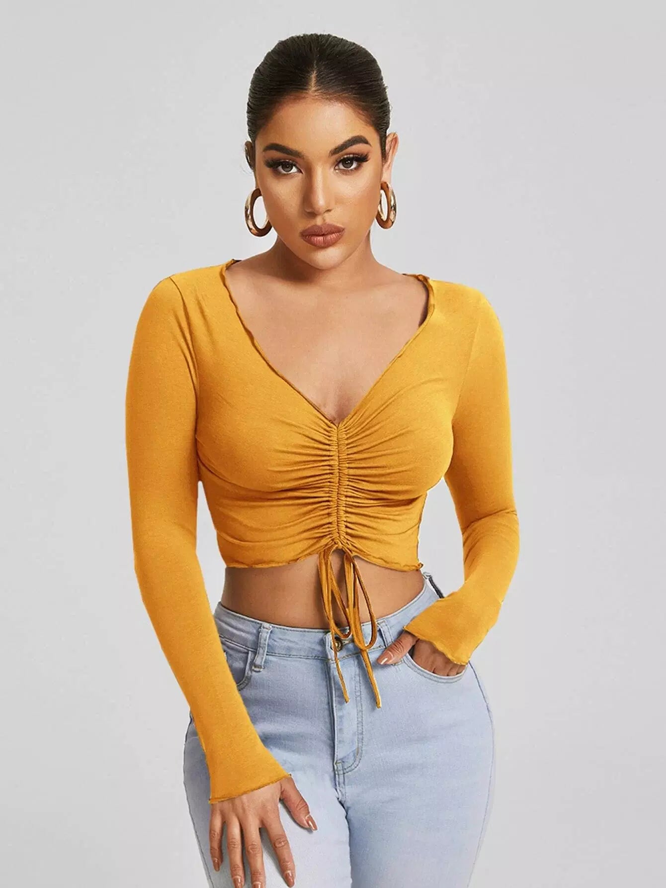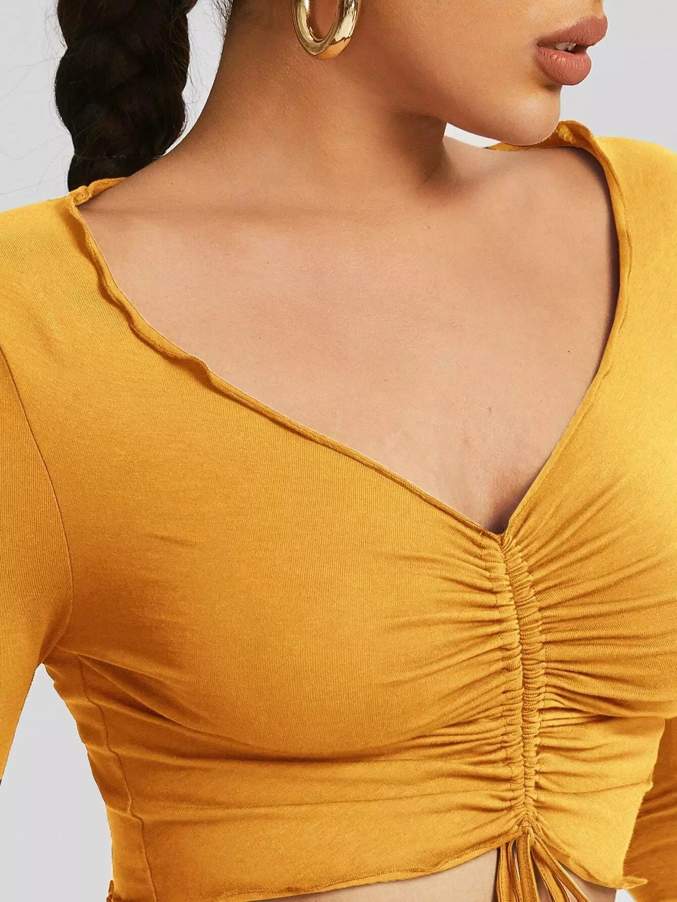 Lettuce Trim Drawstring Ruched Front Crop Tee