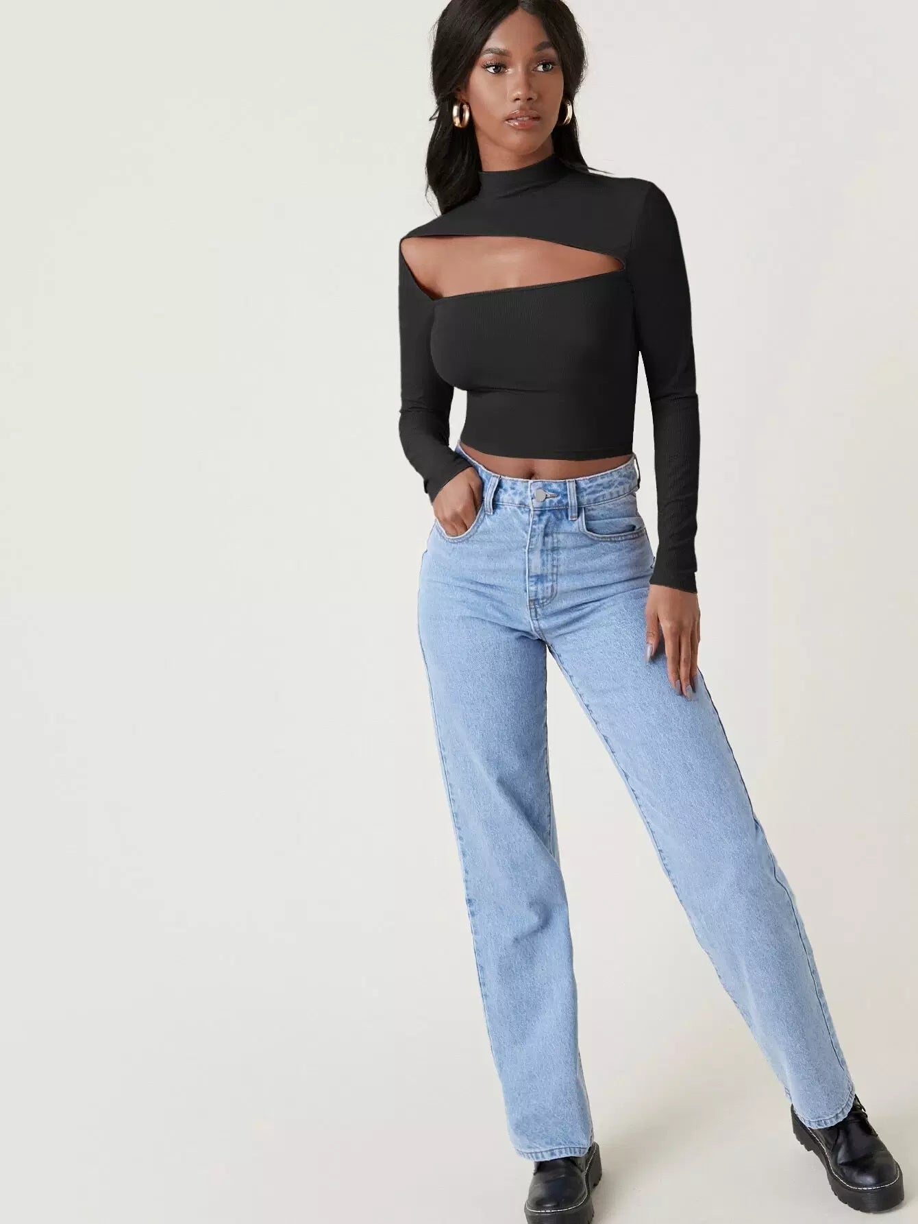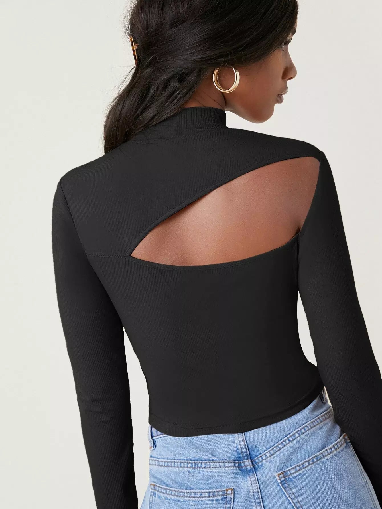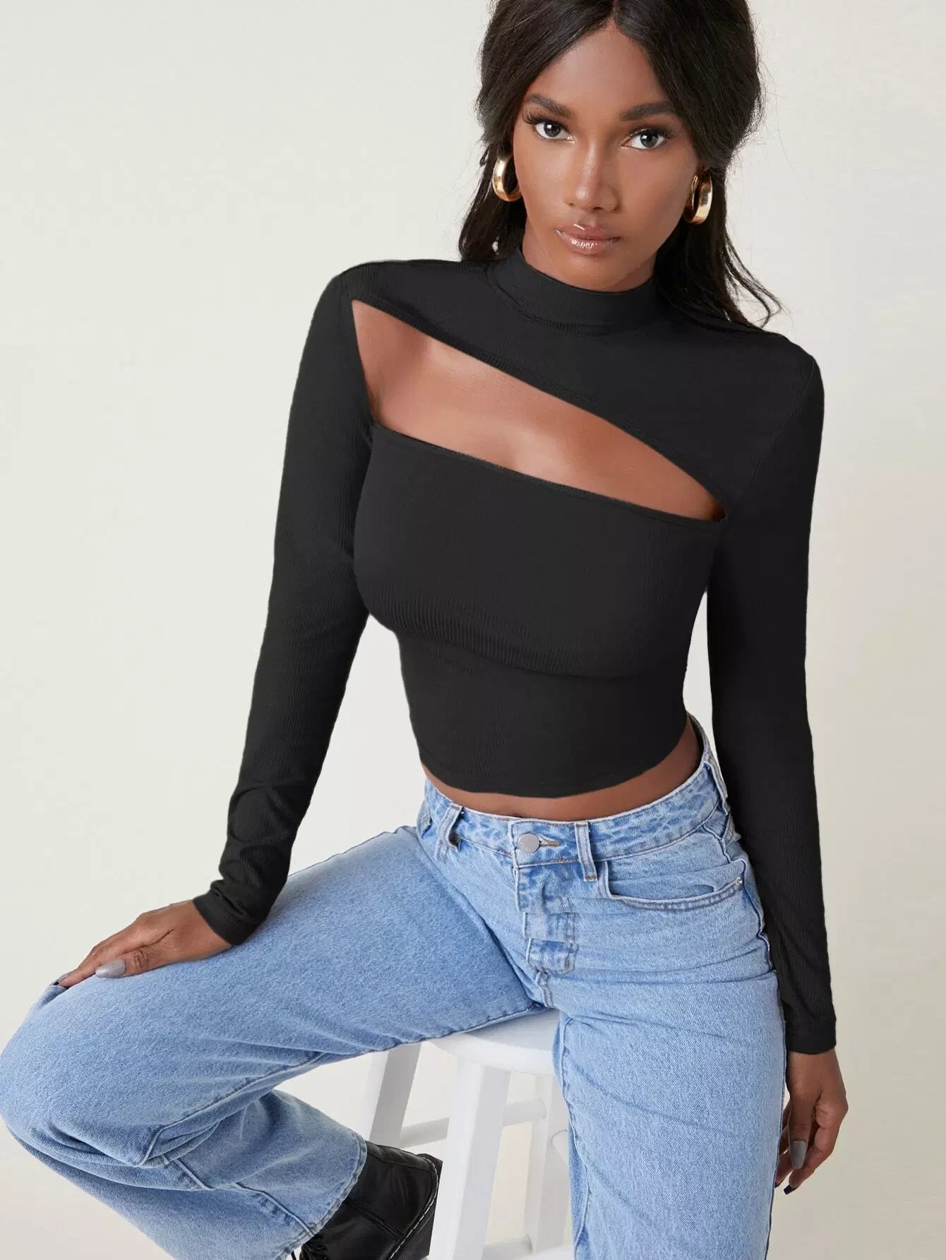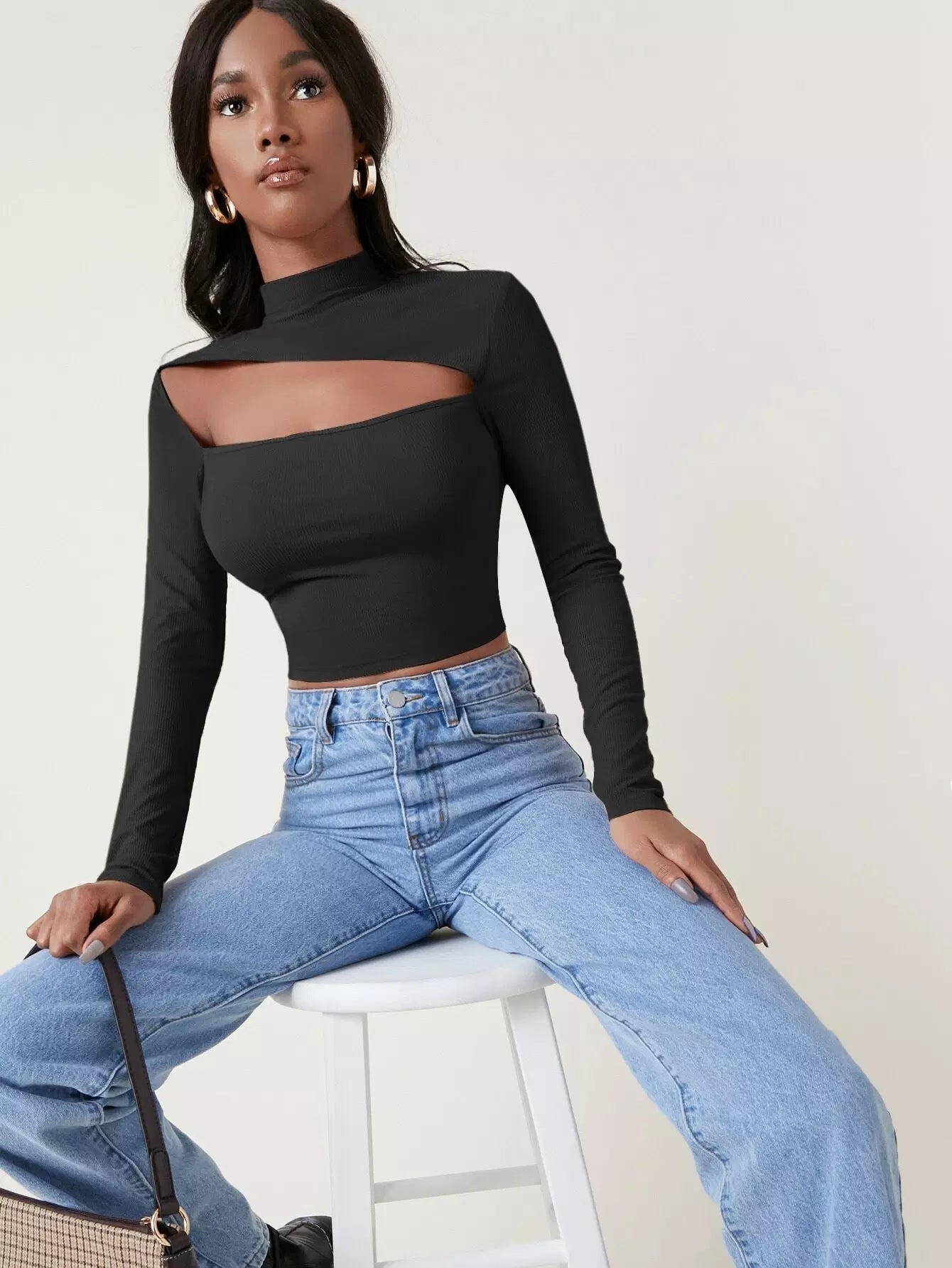 Women - Mock Neck Cutout Rib-knit Crop Tee