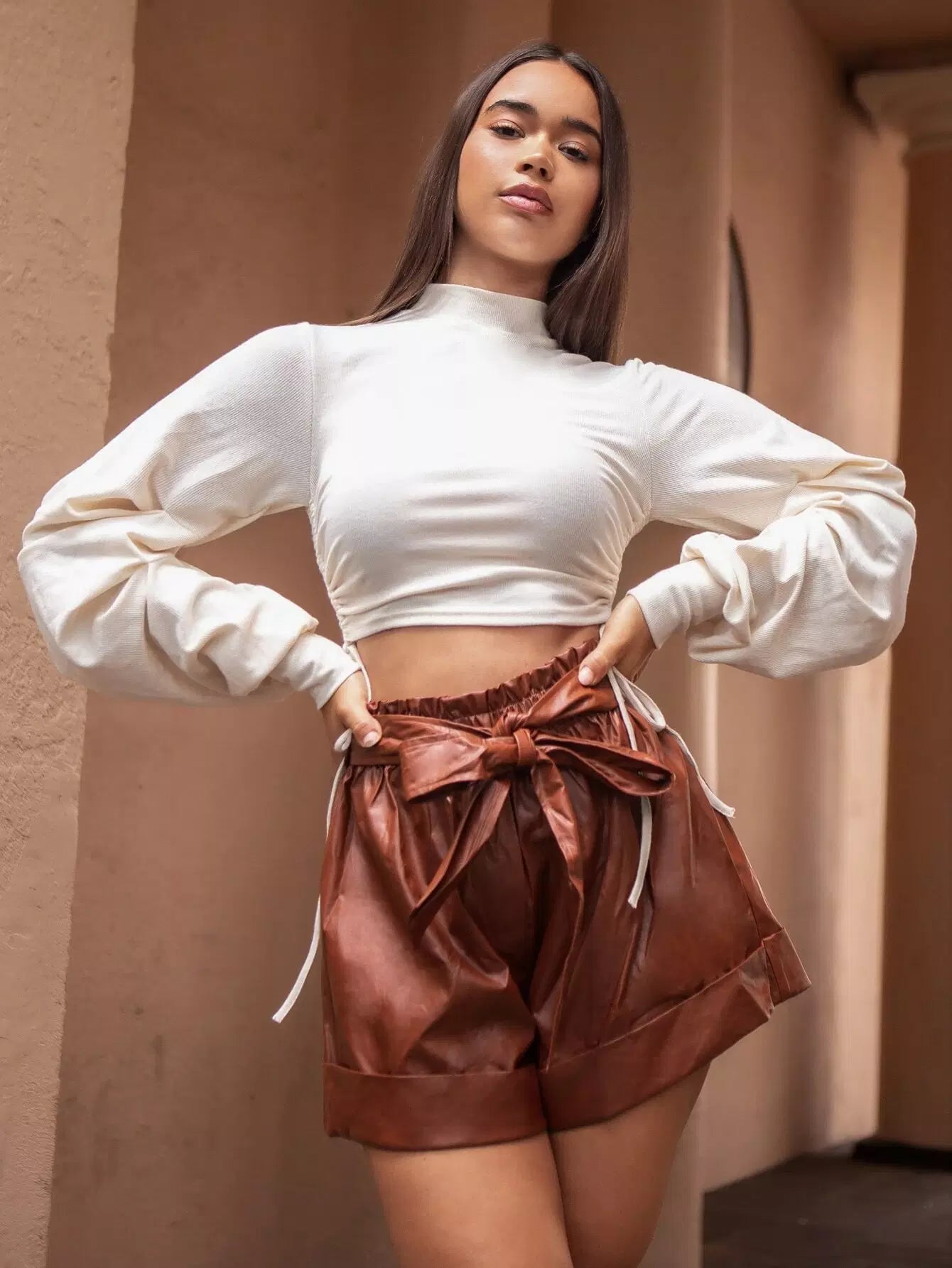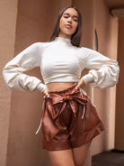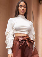 Mock-Neck Lantern Sleeve Drawstring Knot Side Top
