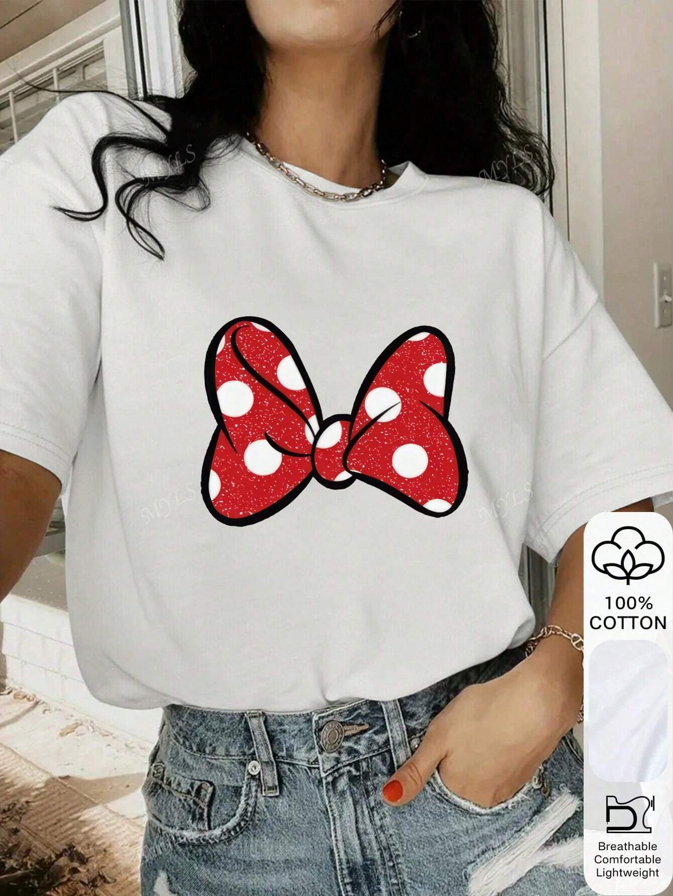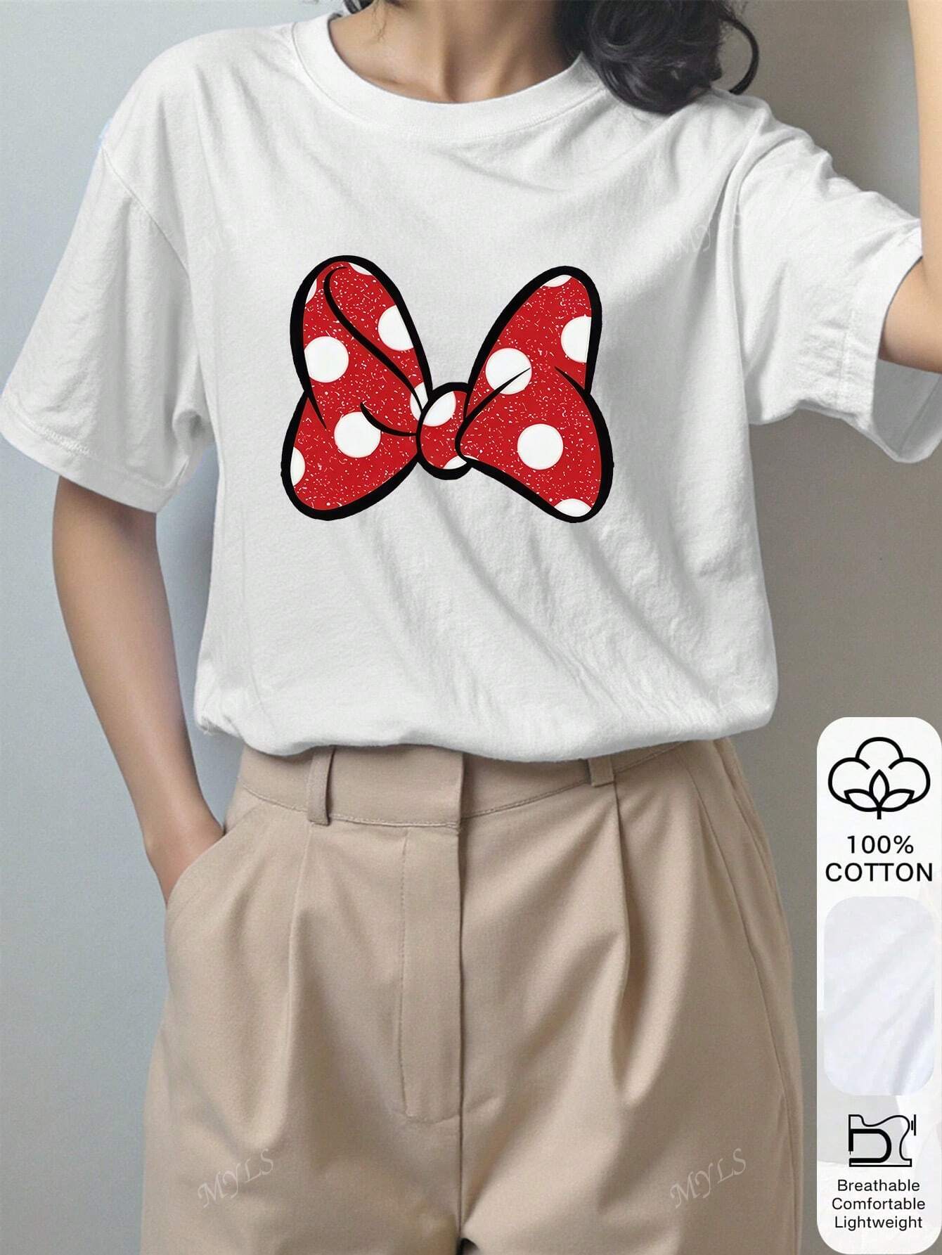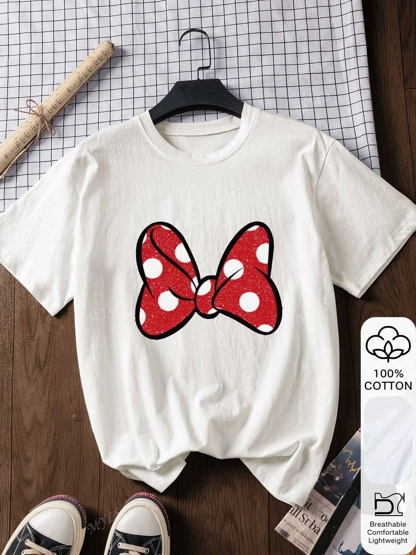 Red Polka Dot Bow Print Summer Women's 100% Cotton Short Sleeves