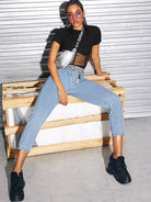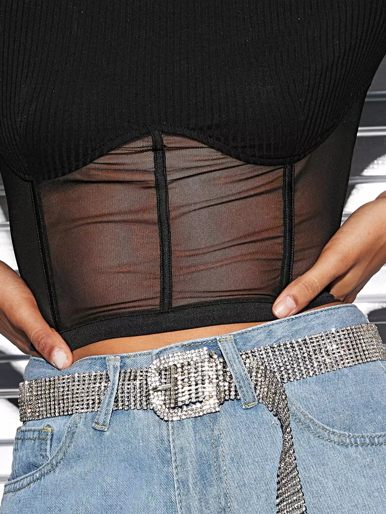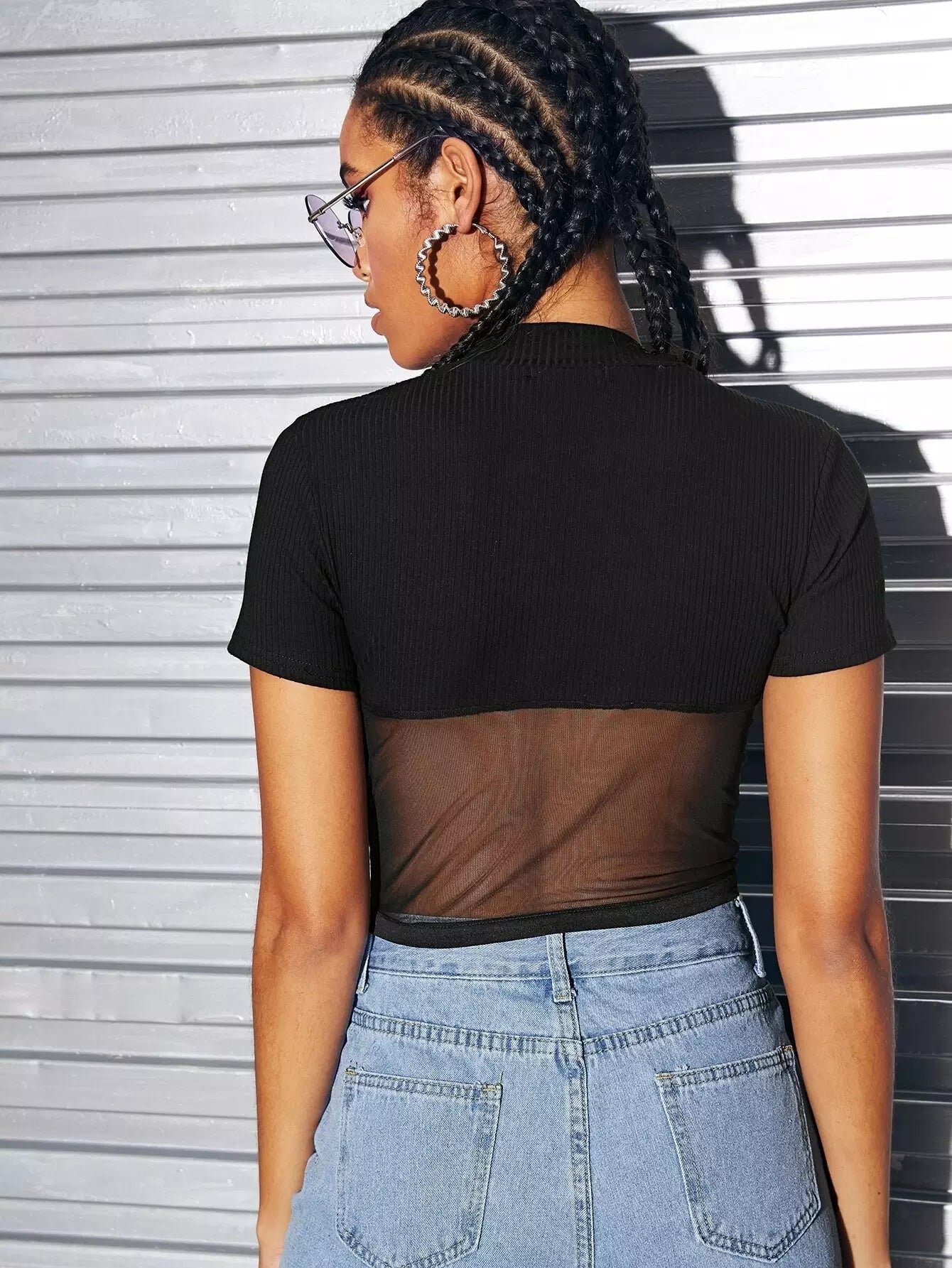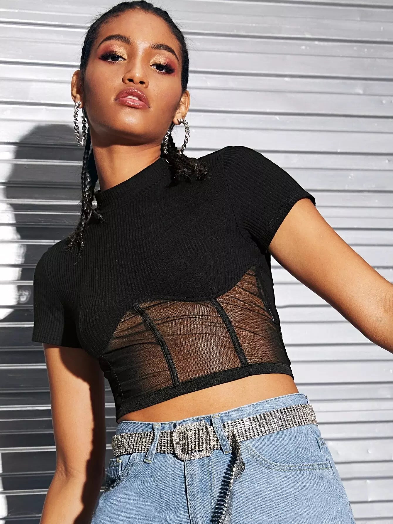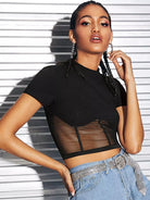 Ribbed Sheer Mesh Piping Crop Top