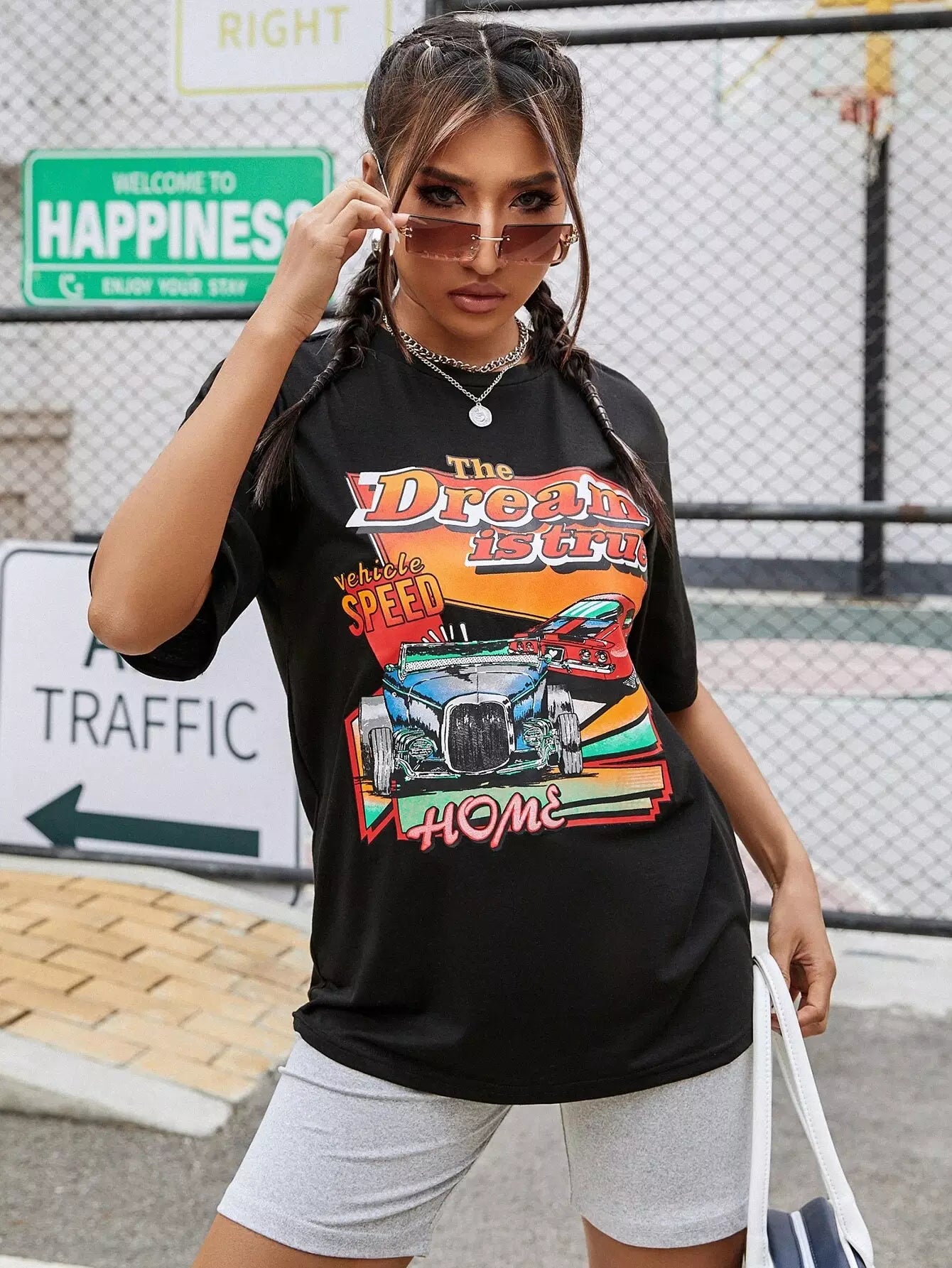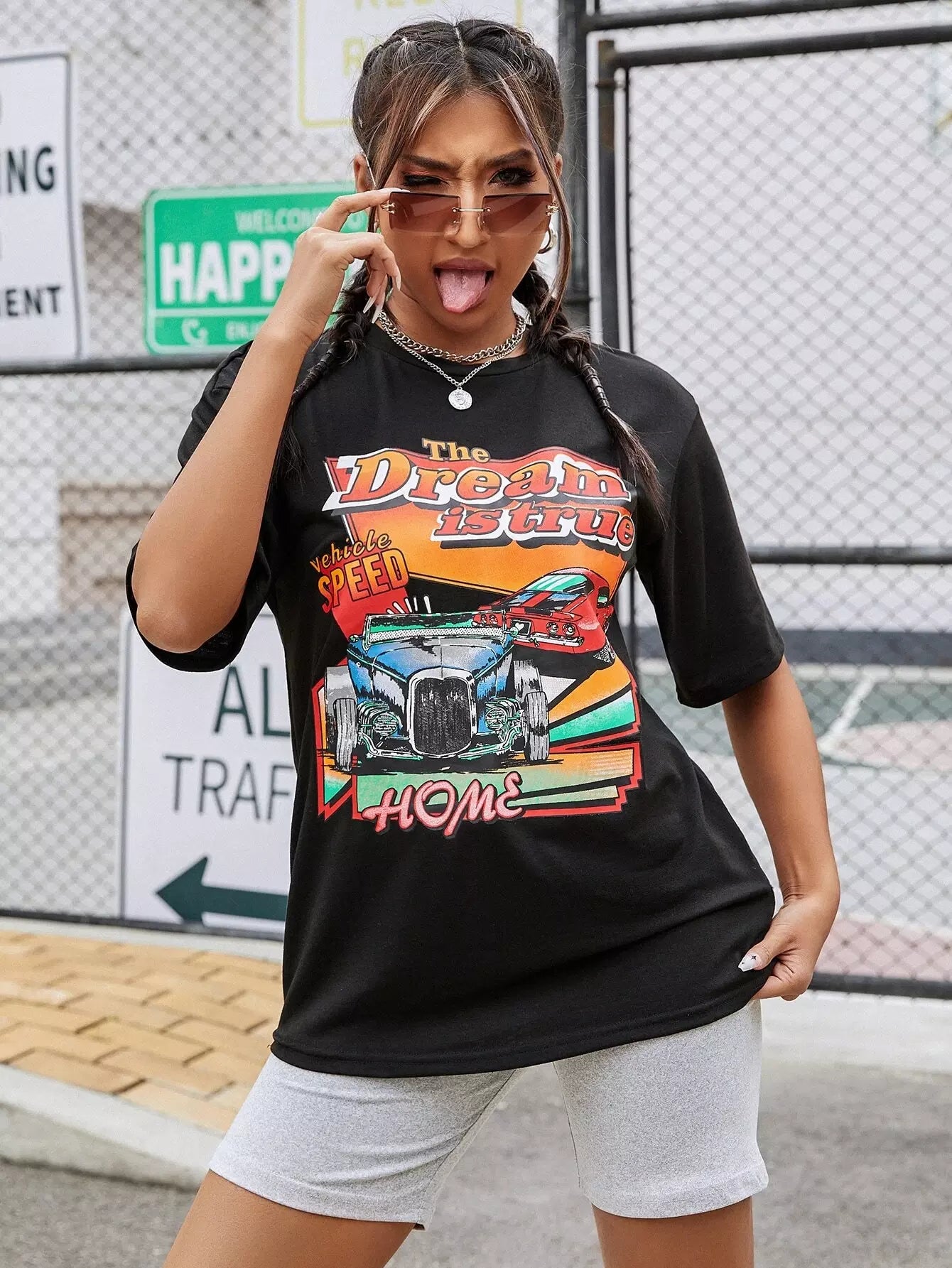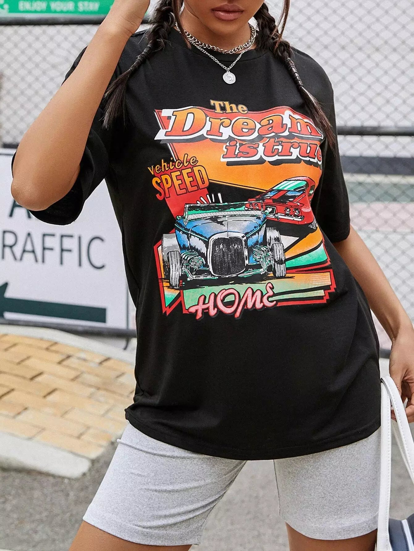 Slogan & Car Print Drop Shoulder Tee