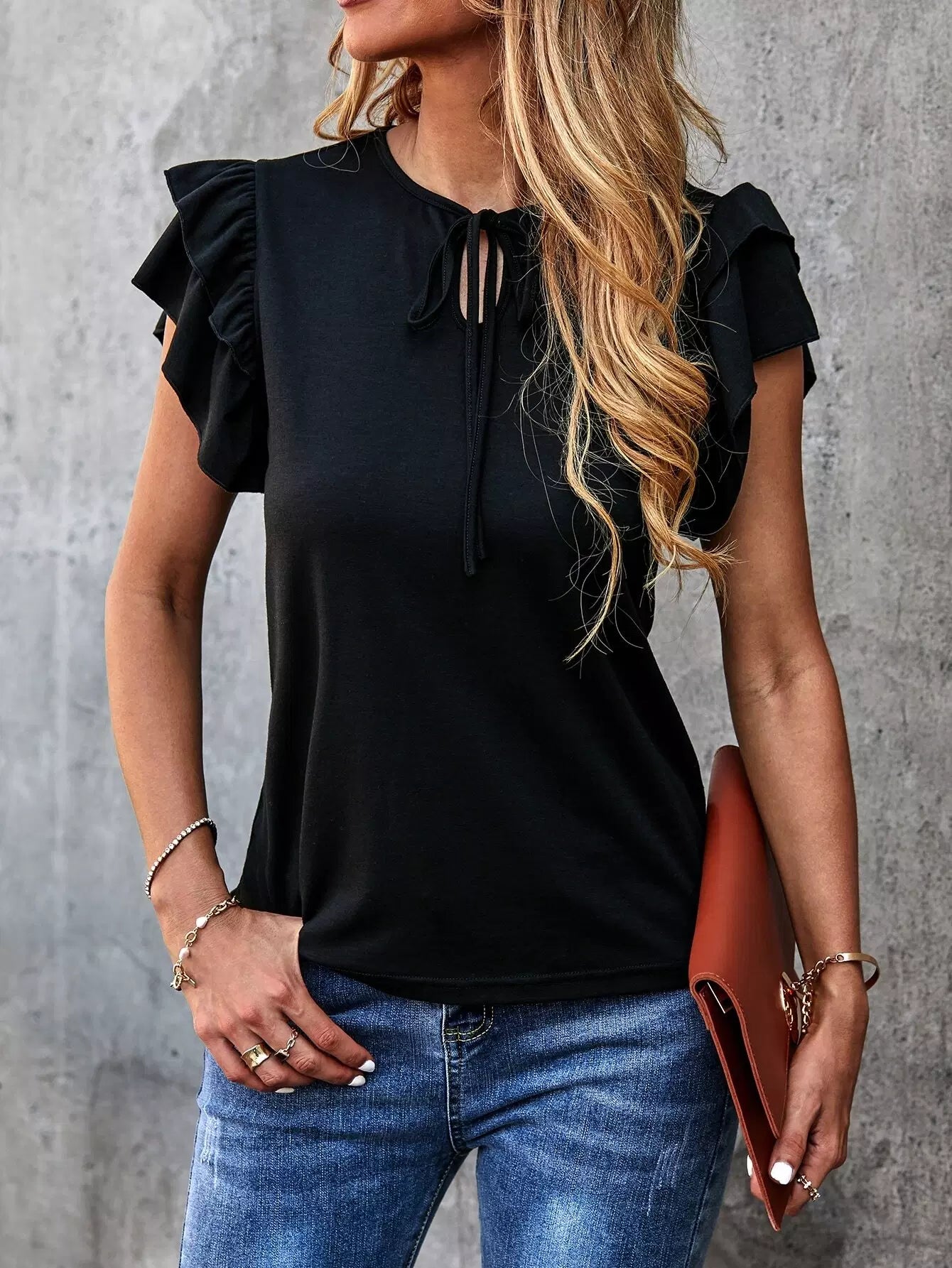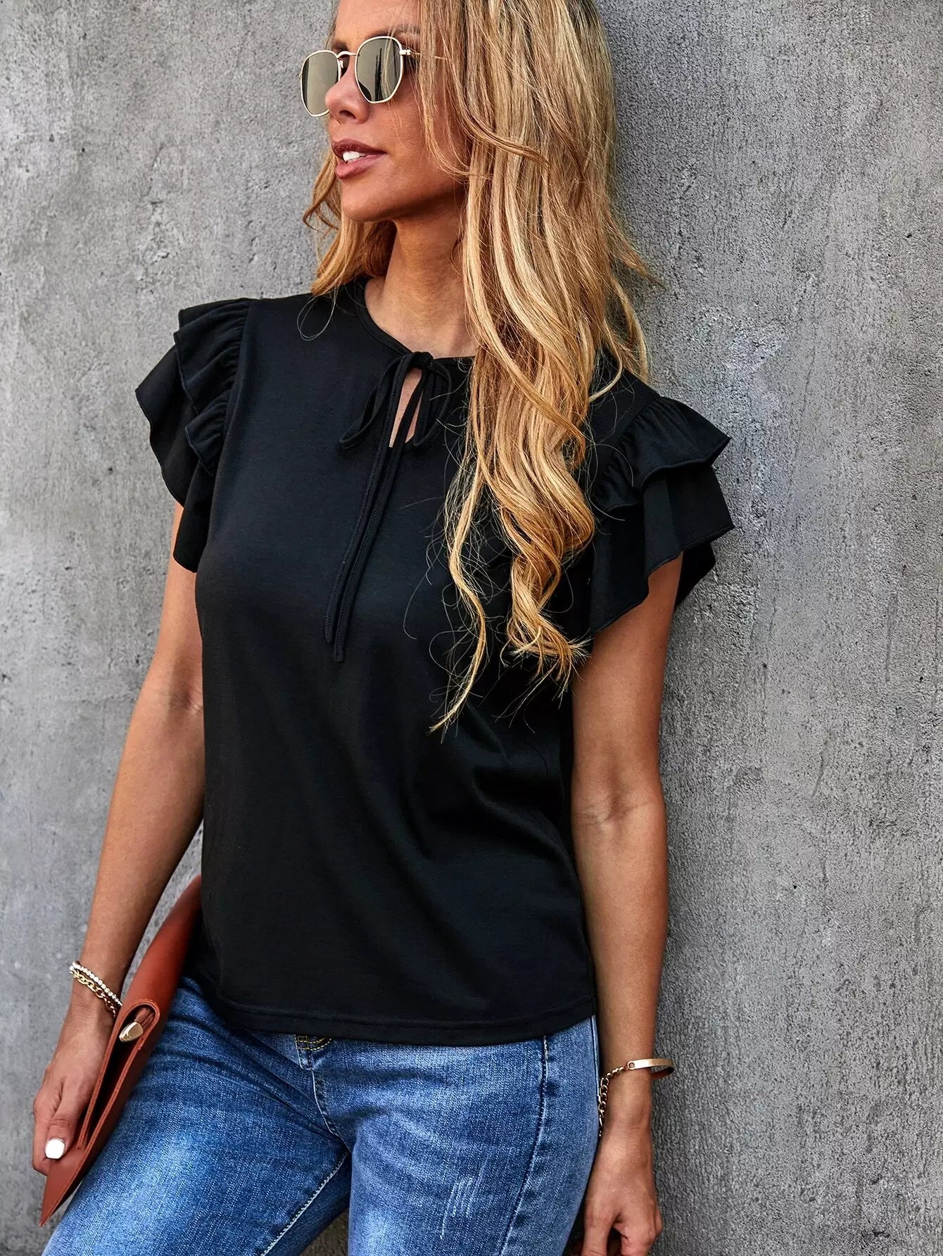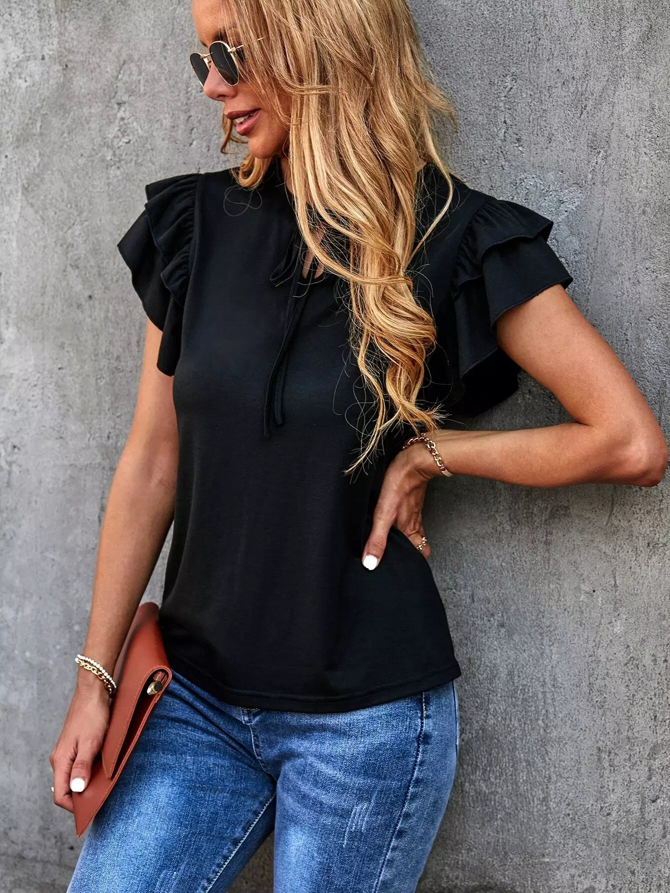 Solid Layered Ruffle Tie Neck Tee