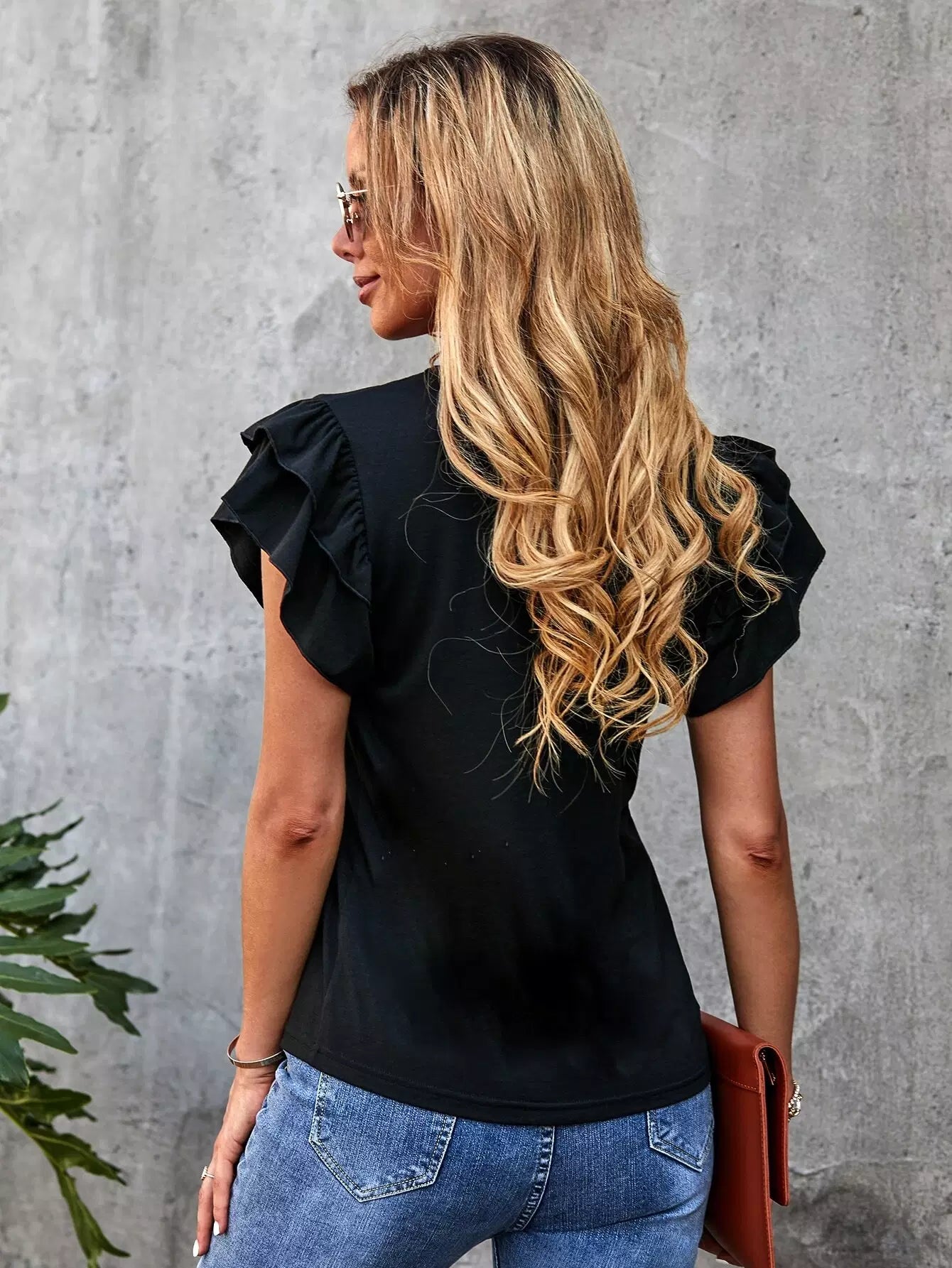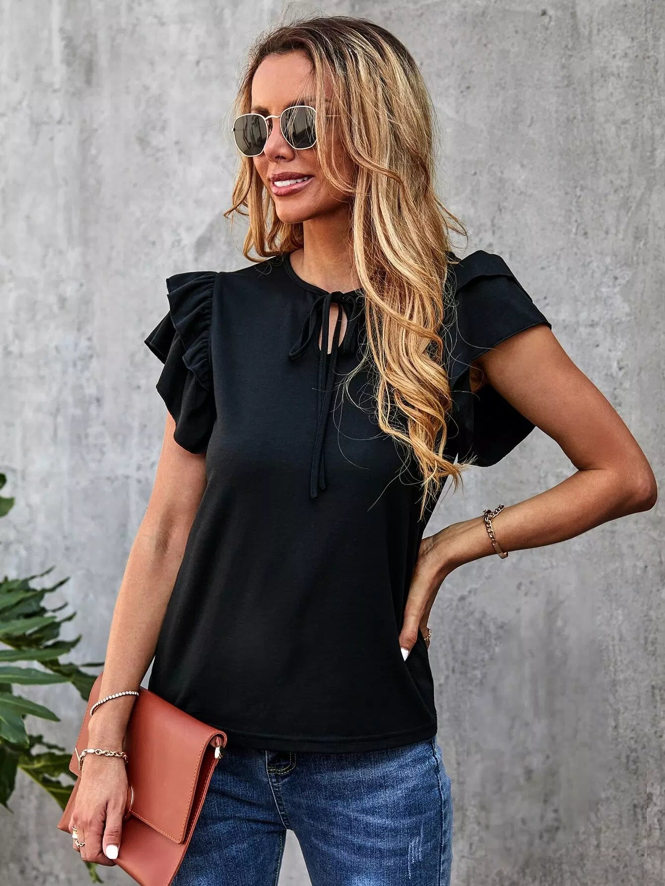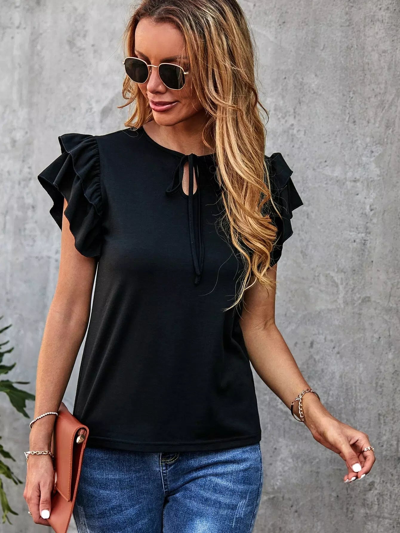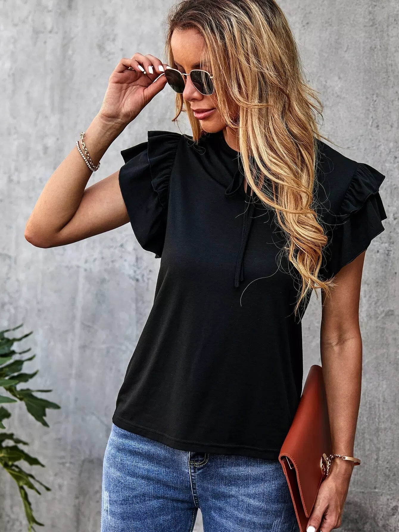 Solid Layered Ruffle Tie Neck Tee
