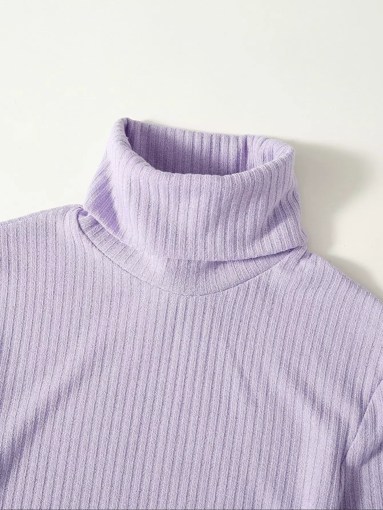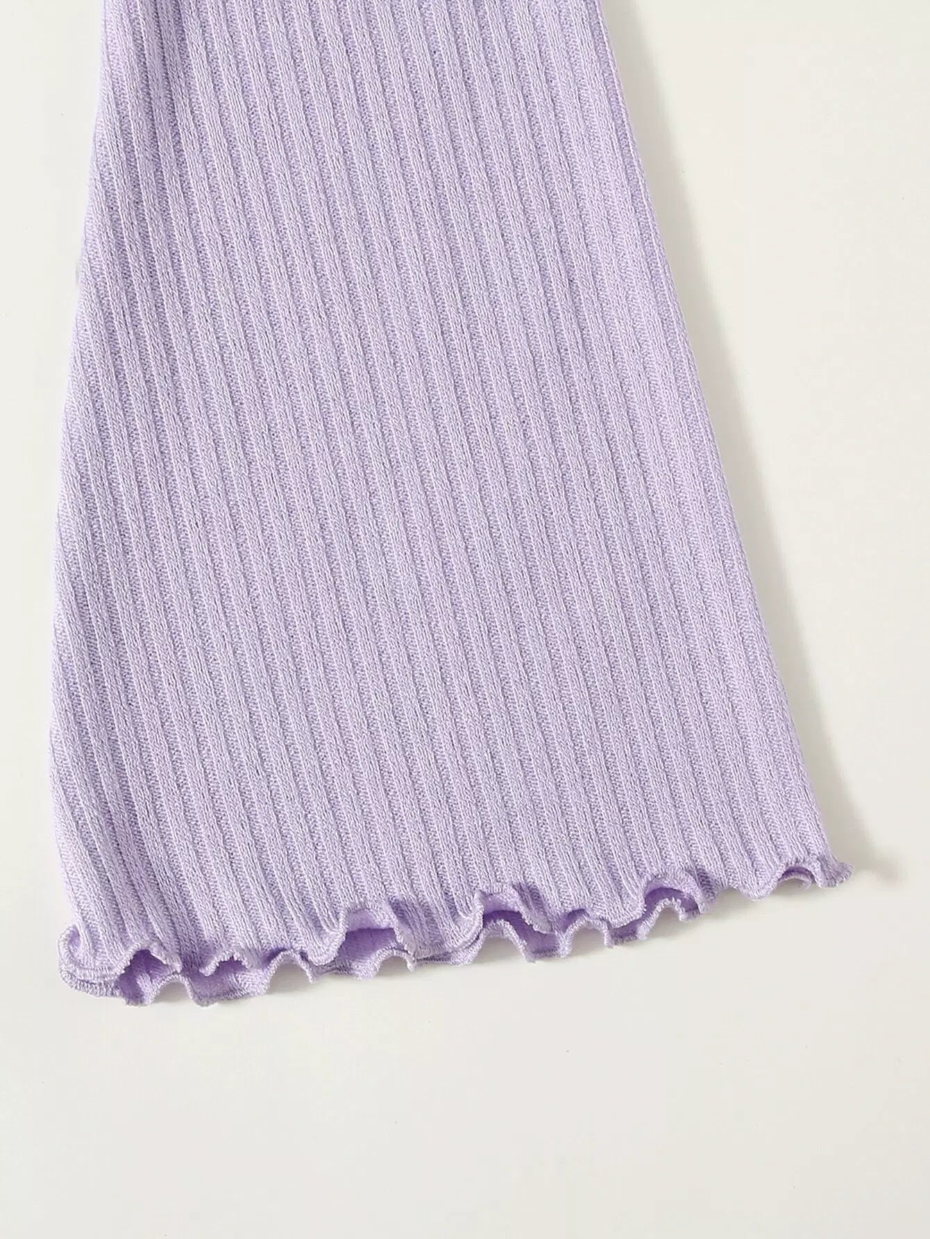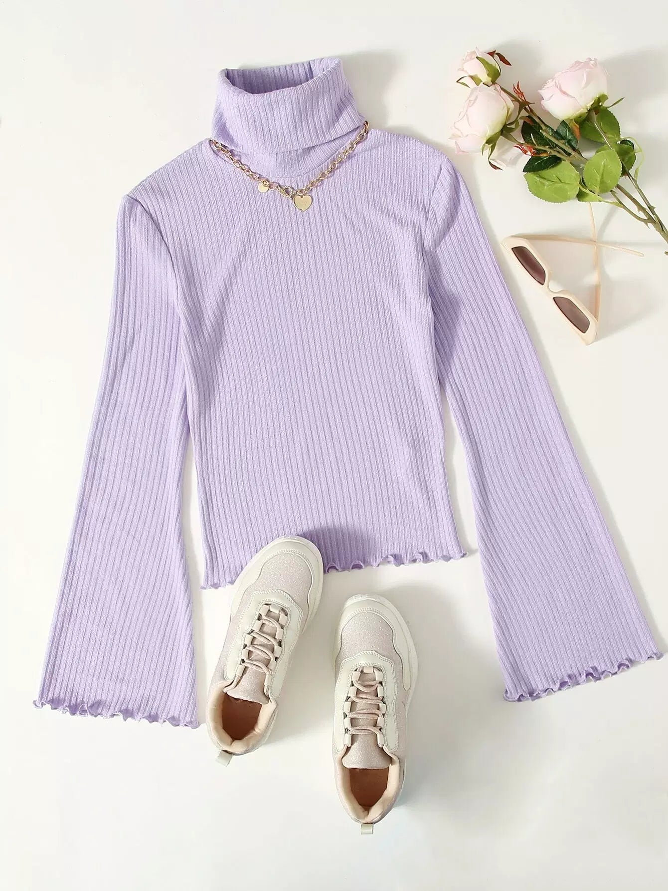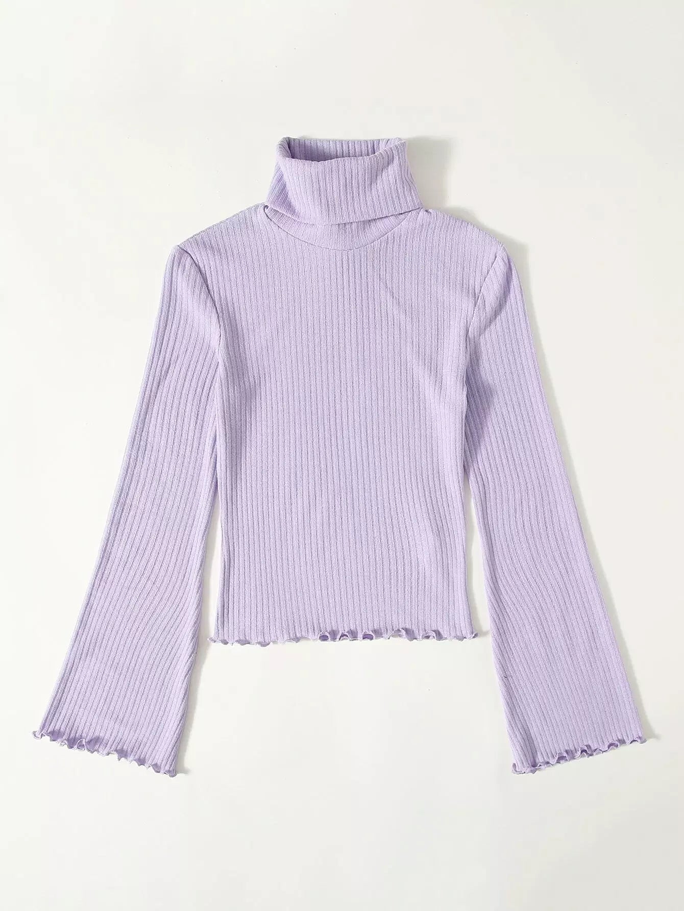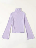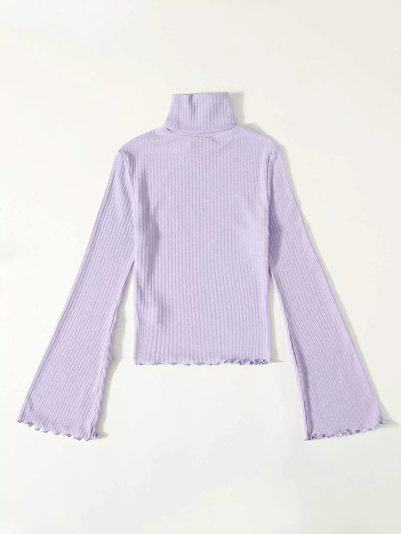Turtle Neck Bell Sleeve Lettuce Trim Rib-knit Top