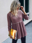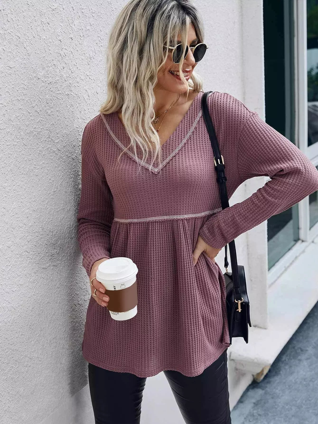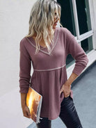 Waffle Knit V-neck Ruffle Hem Tee