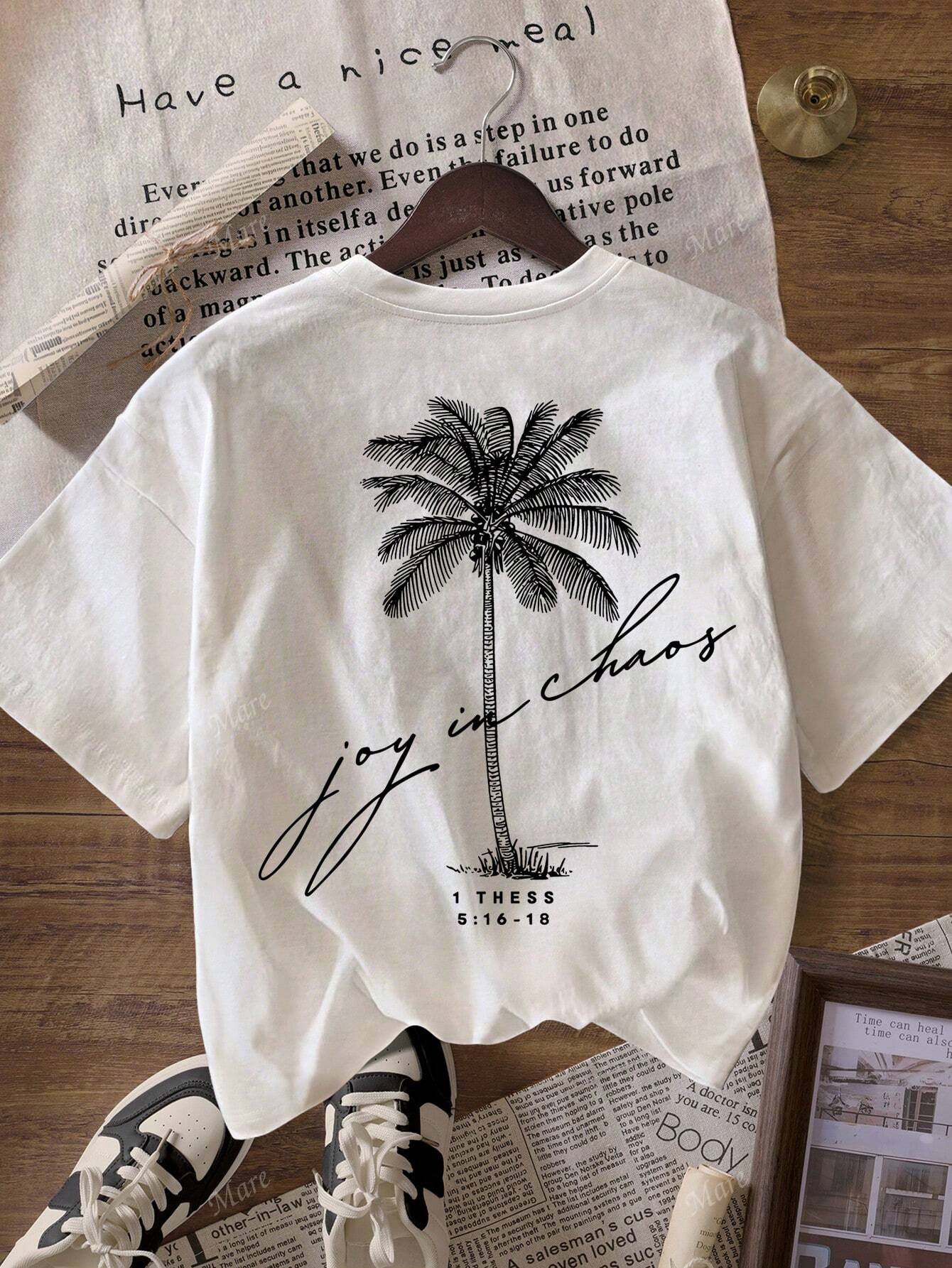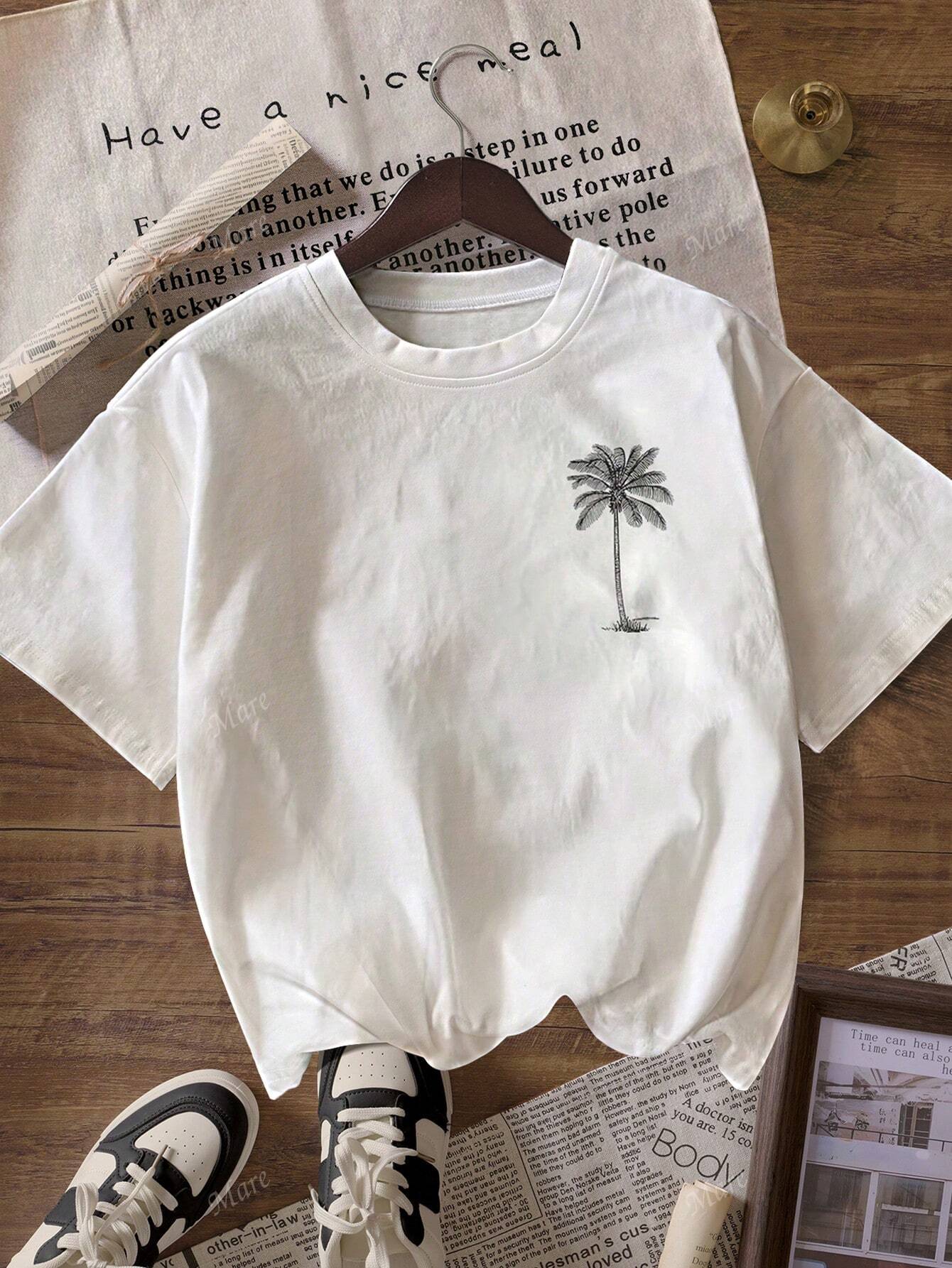 Women Casual Palm Tree Pattern Round Neck Short Sleeve Summer Beach T-Shirt