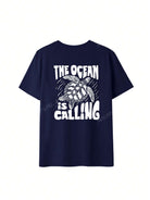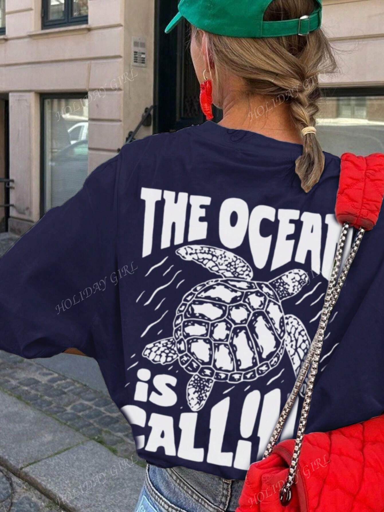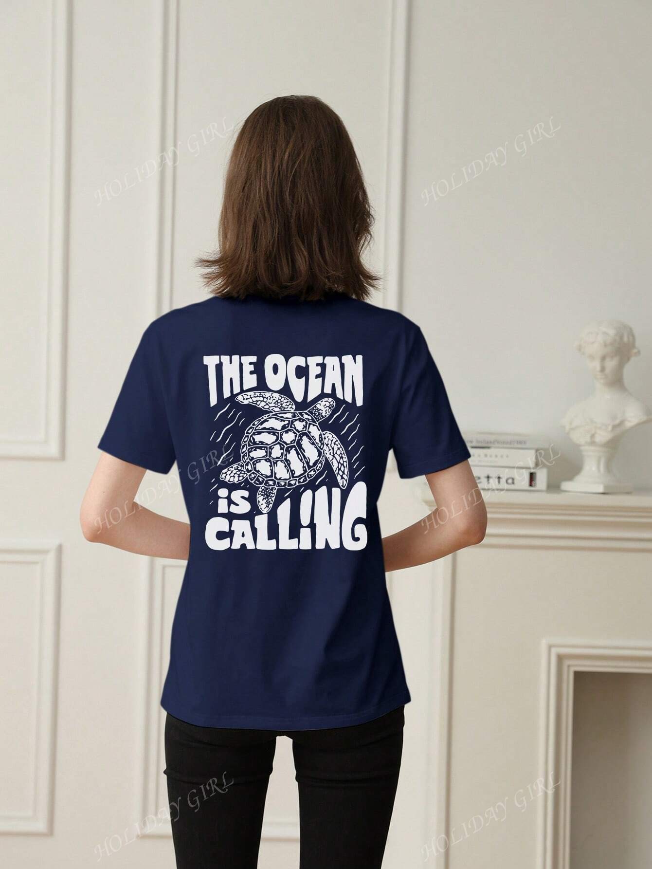 Women's Summer Vacation Marine Life And Letter Printed Pattern Round Neck T-Shirt.Graphic Tees Women