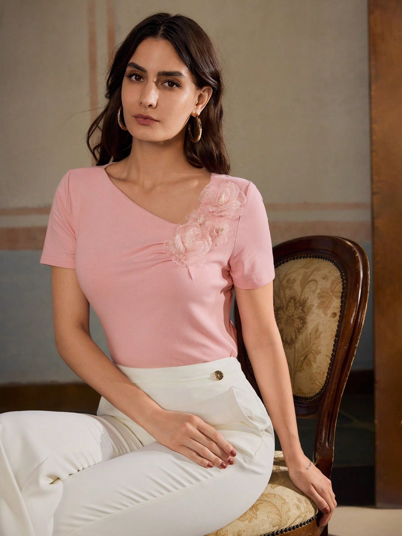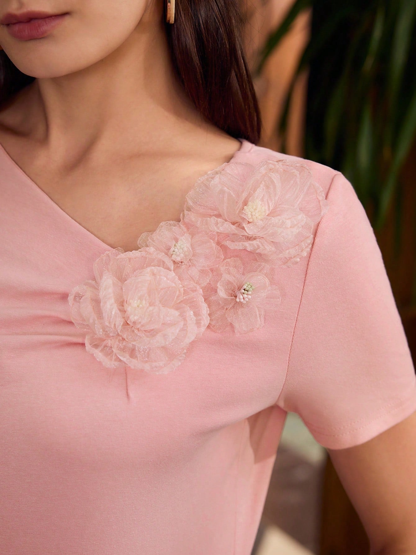 ZEYLAH Women 3D Flower T-Shirt, Minimalist & Fashionable, Suitable For Summer