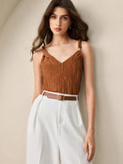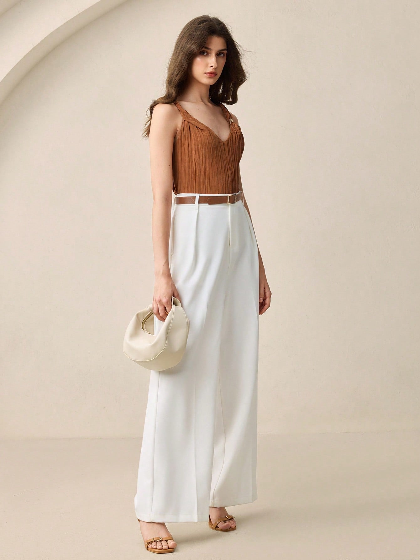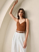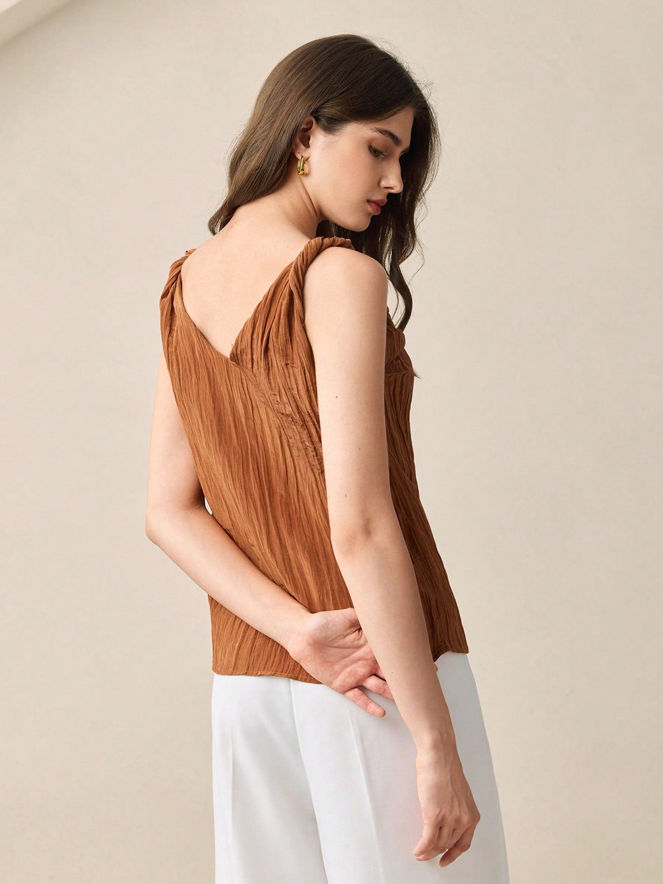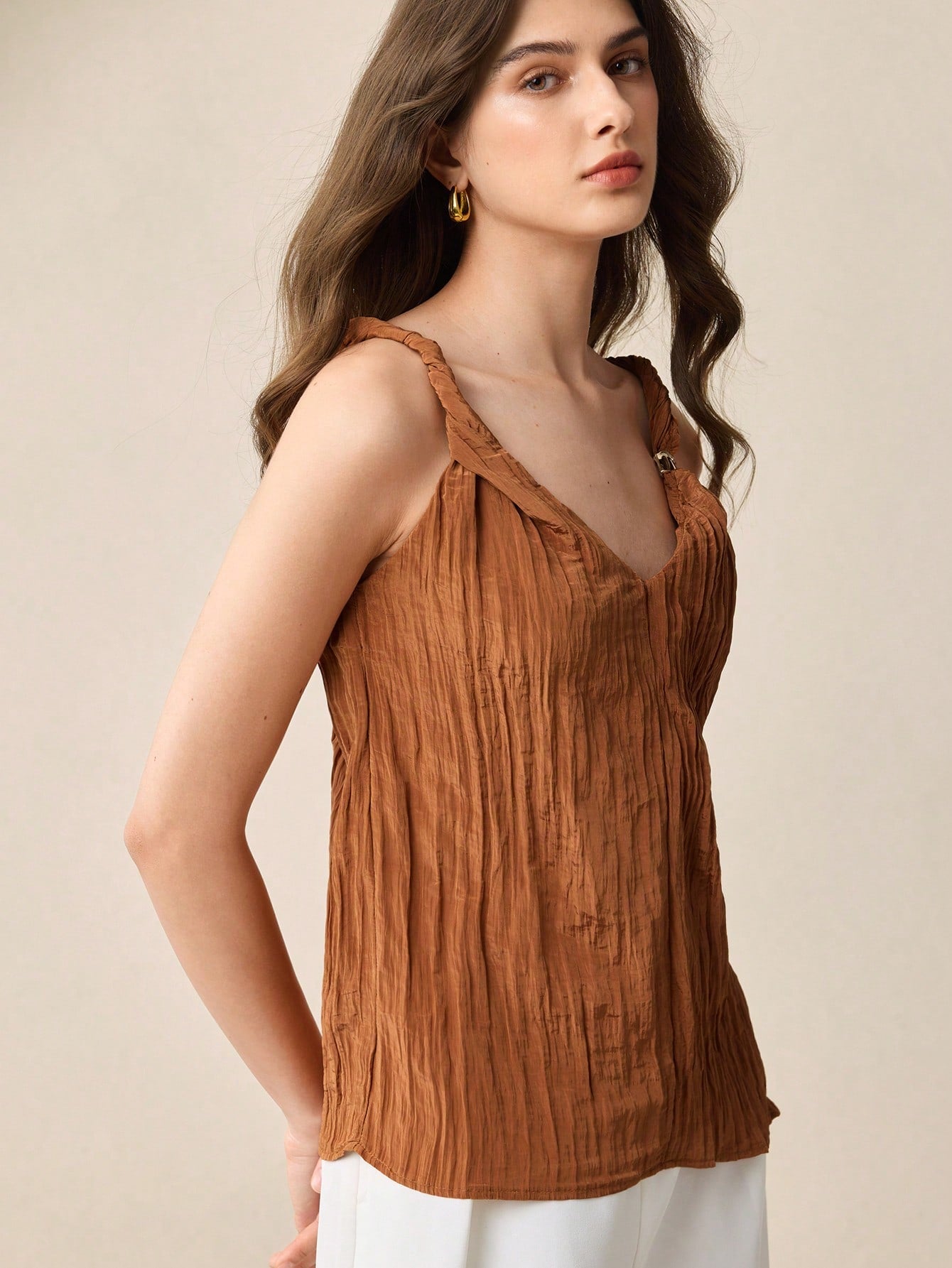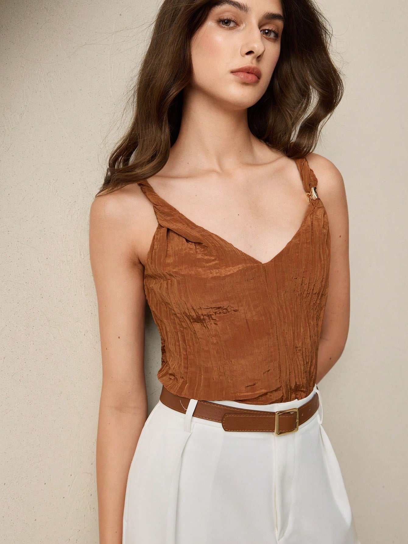 BizChic 2025 Summer New Caramel Crinkle Texture Fabric Twist Knot Shoulder Metal Decor Camisole Top,