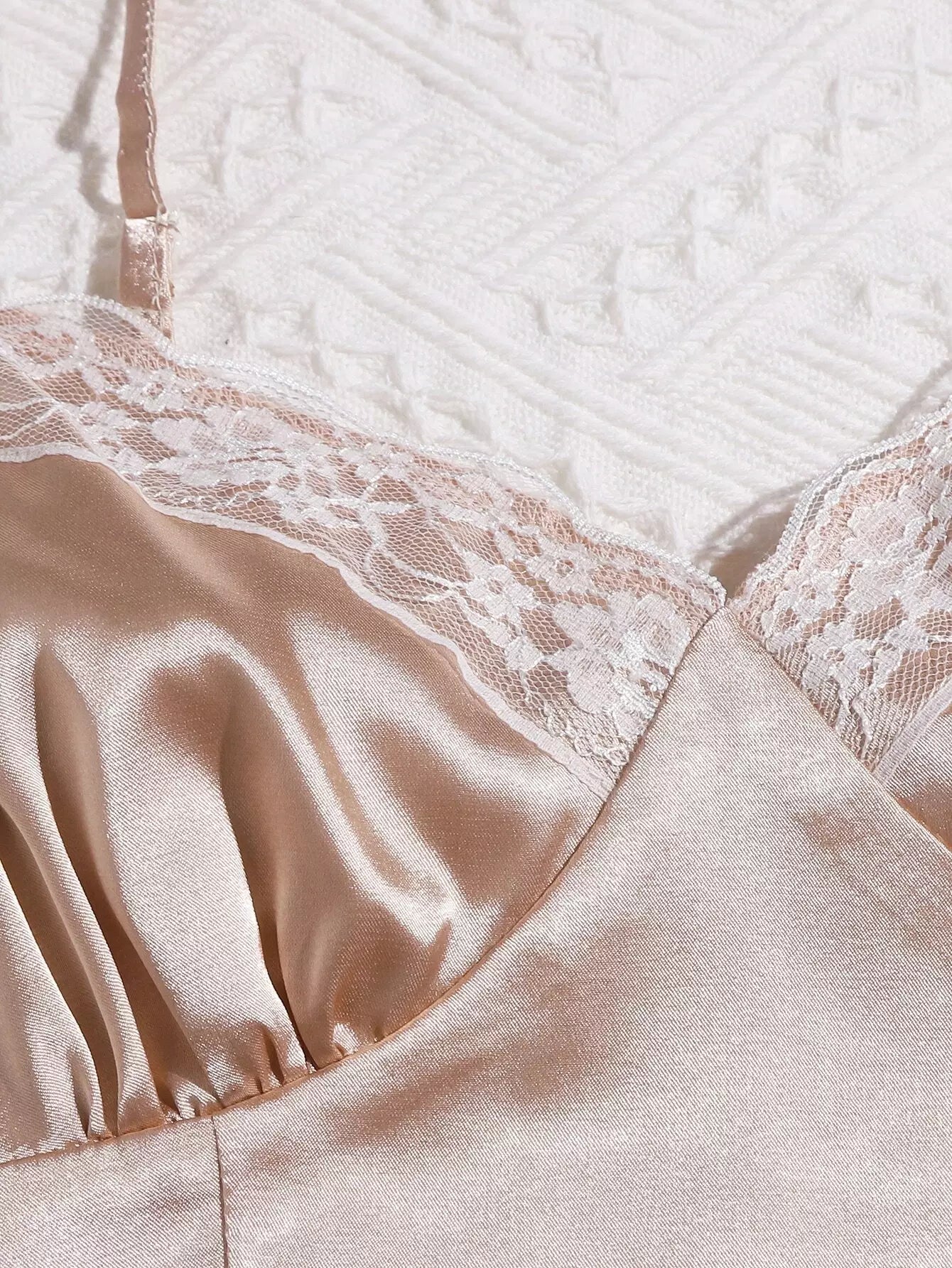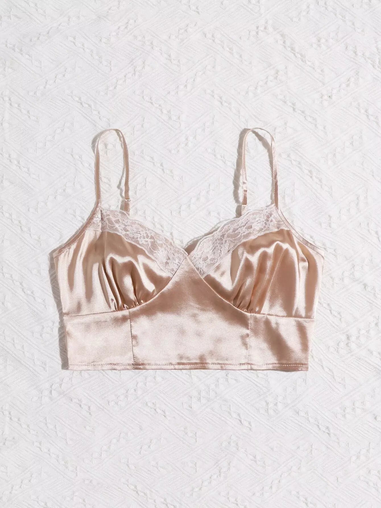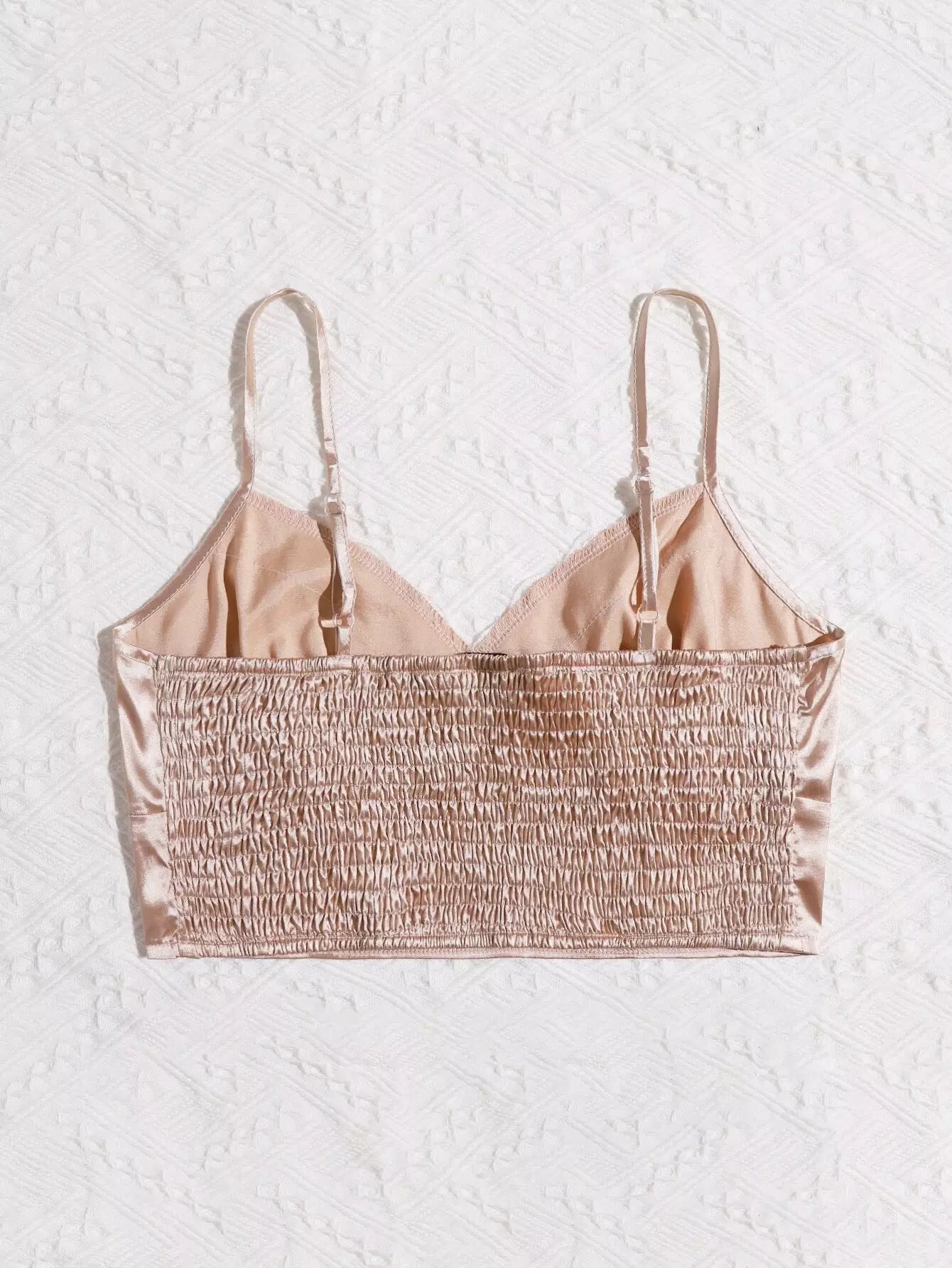 Shirred Back Contrast Lace Satin Crop Cami Top