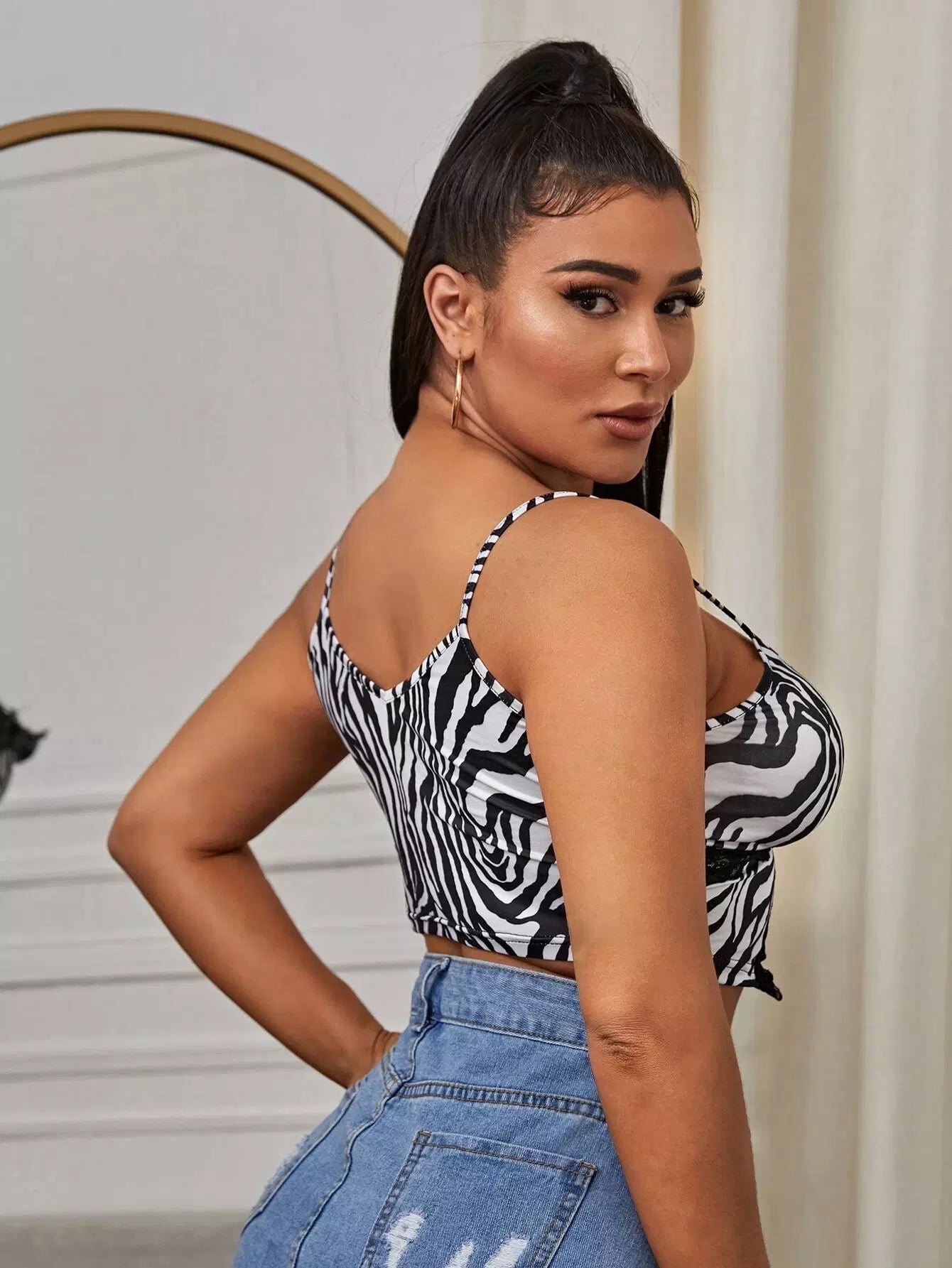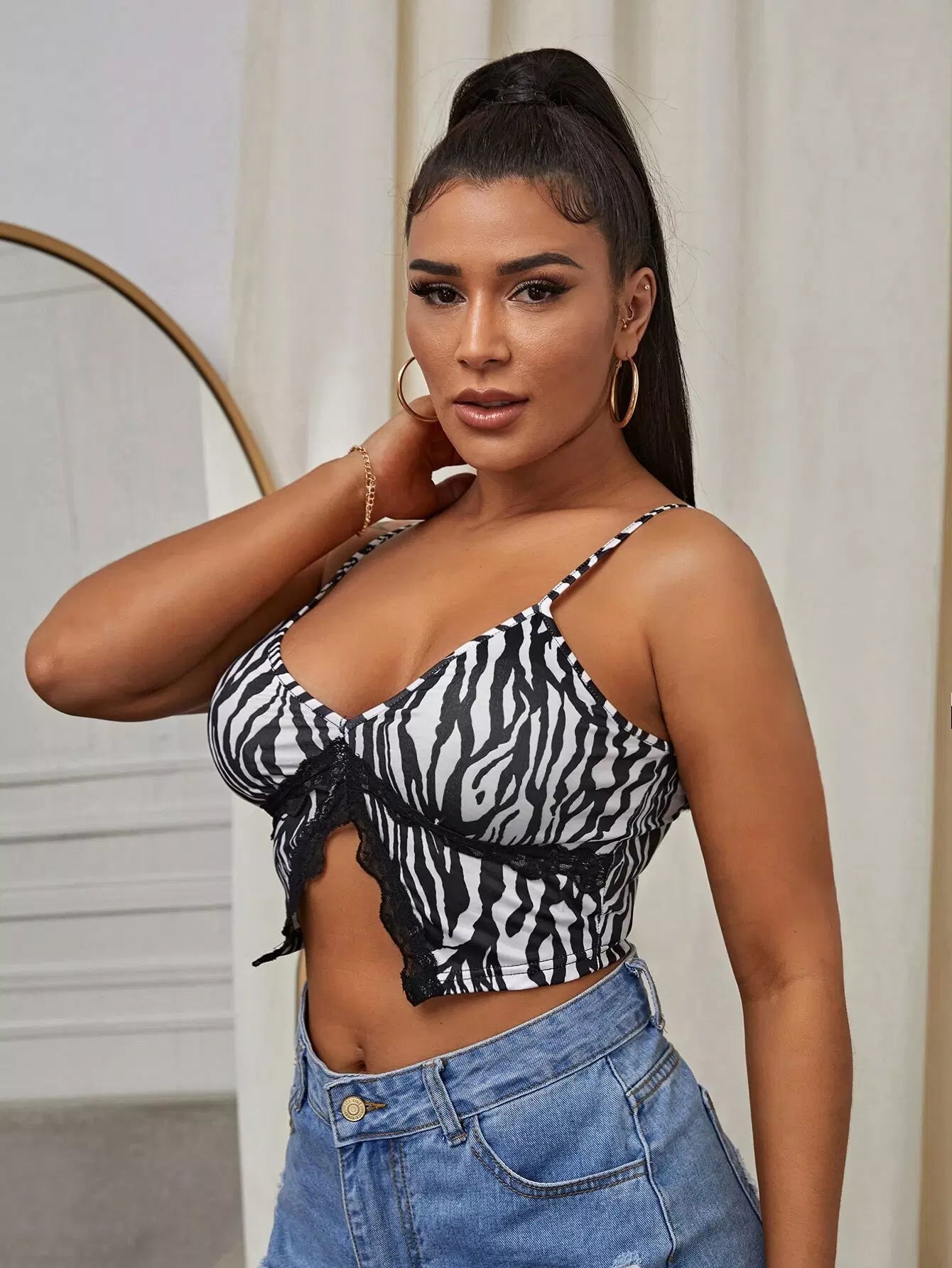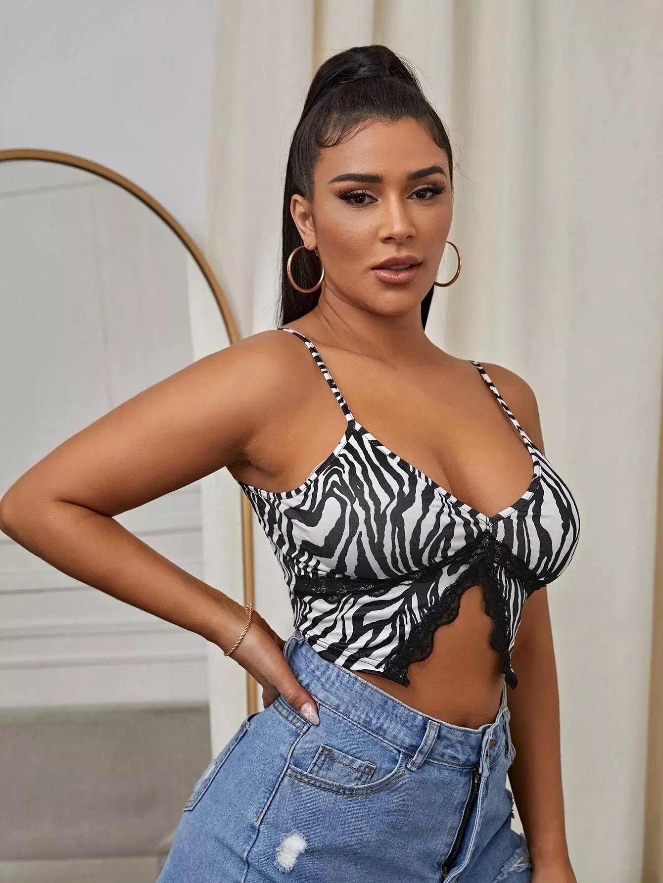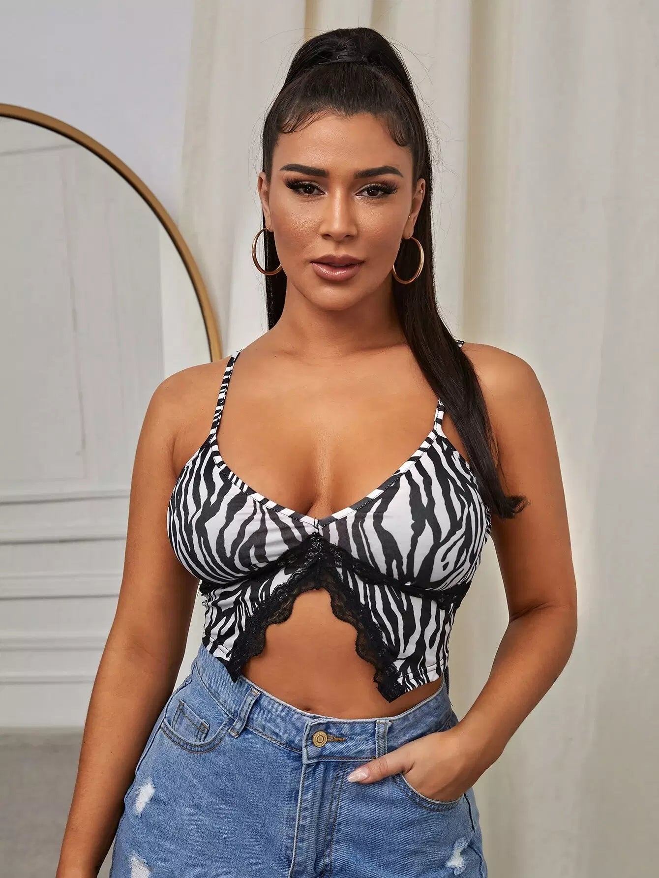 Zebra Striped Lace Trim Asymmetrical Hem Cami Top