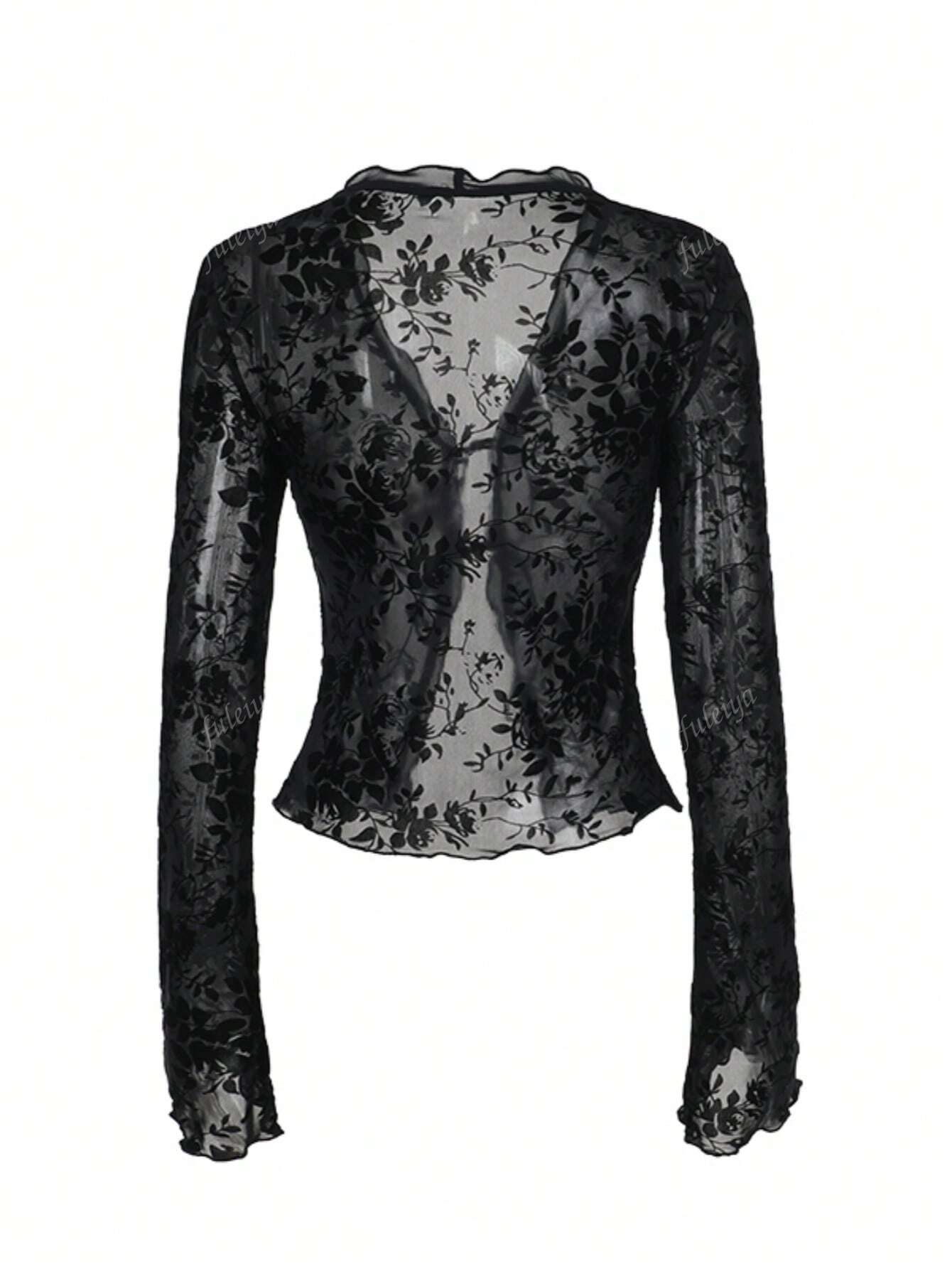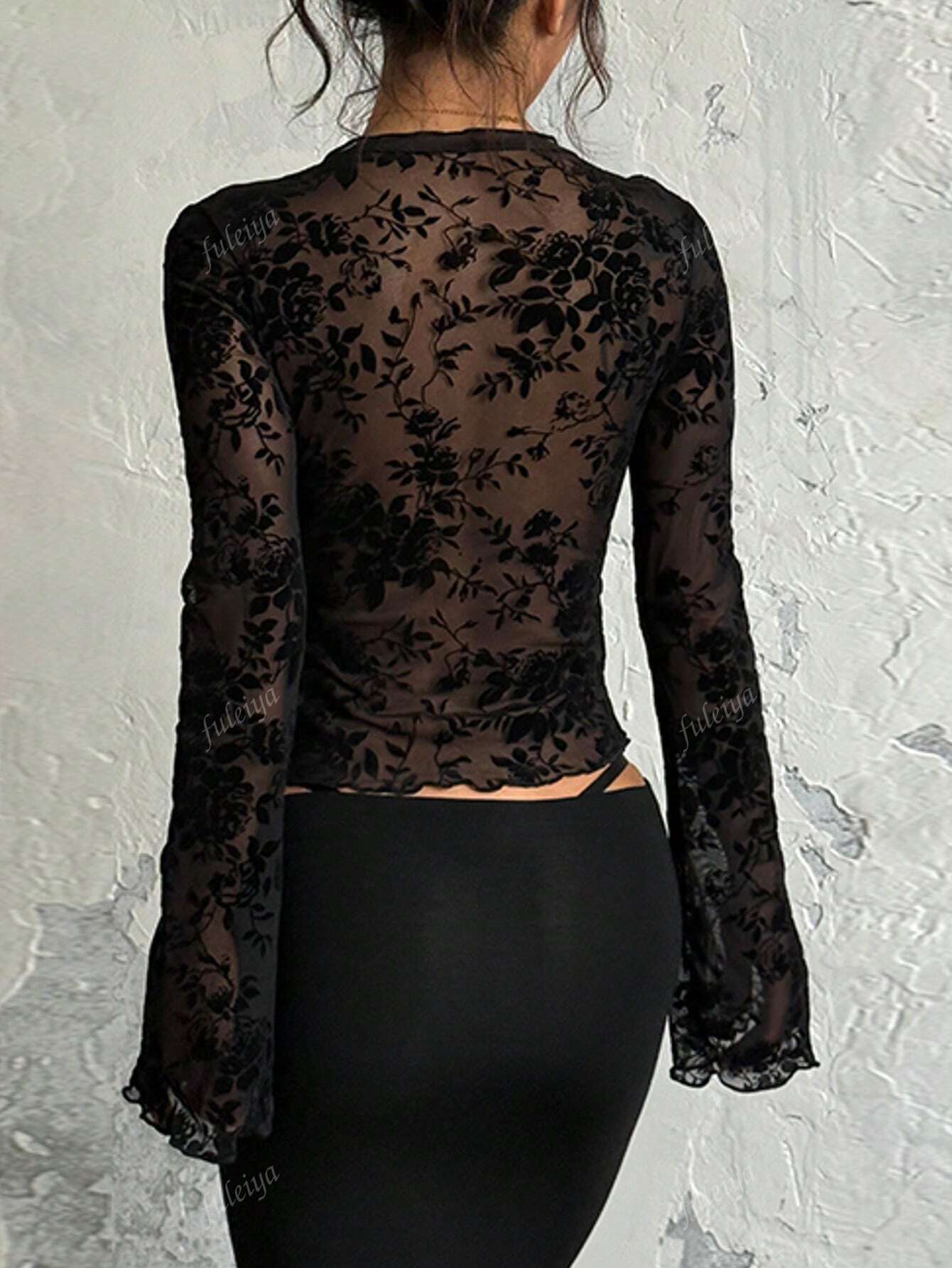 1pc Women's Autumn Floral Mesh Tie Front Ruffle Flare Sleeve Blouse