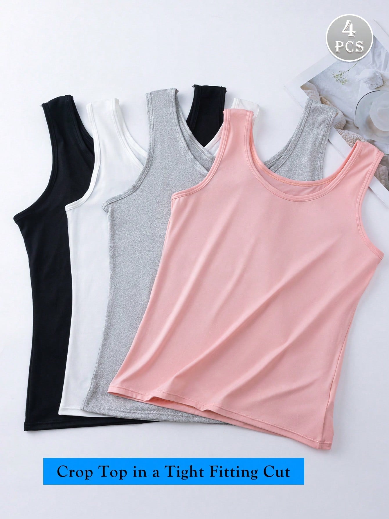 4pcs Women's Comfortable Casual U-Neck Wide Strap Camisole Sleeveless Crop Top