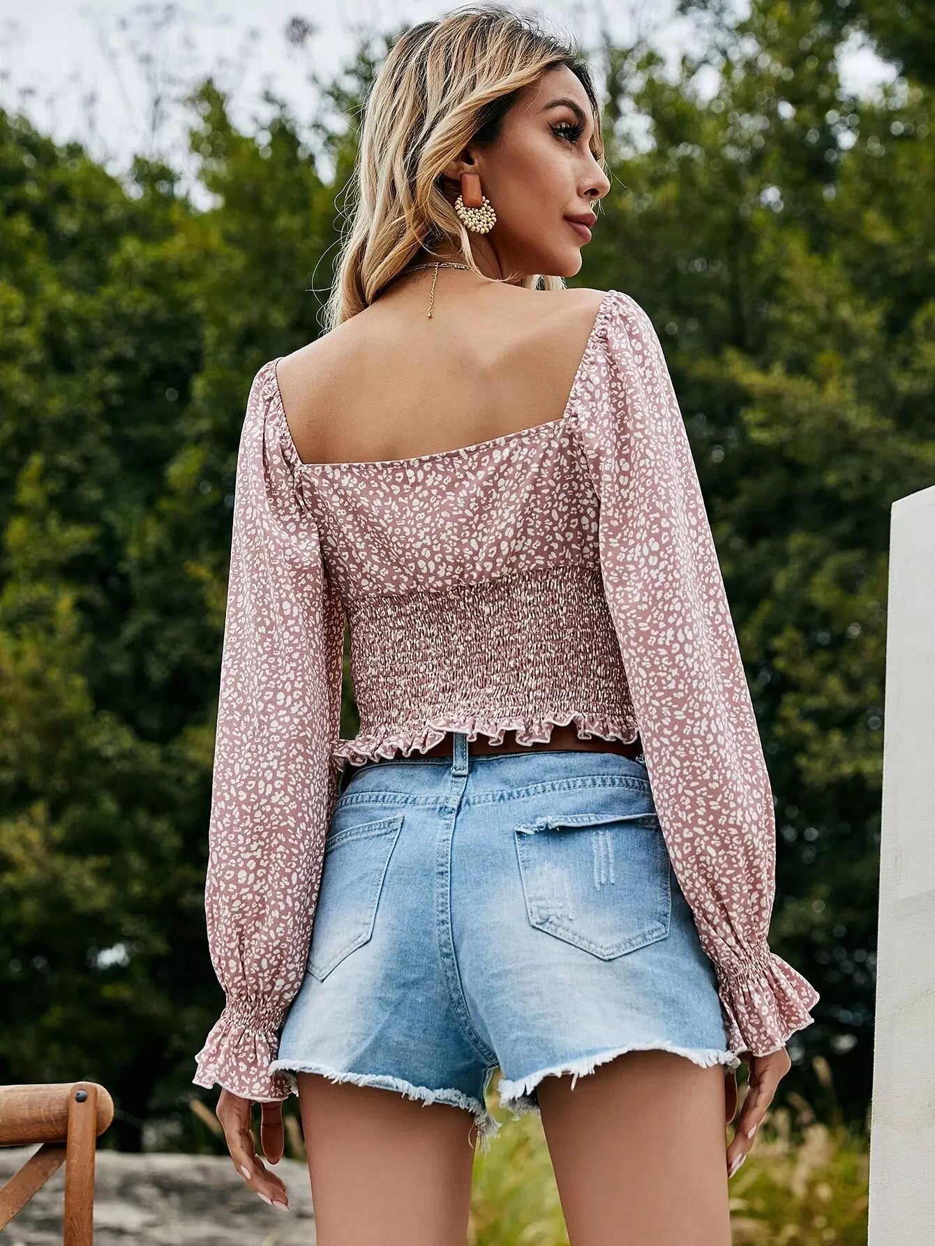 All Over Print Shirred Flounce Sleeve Crop Top