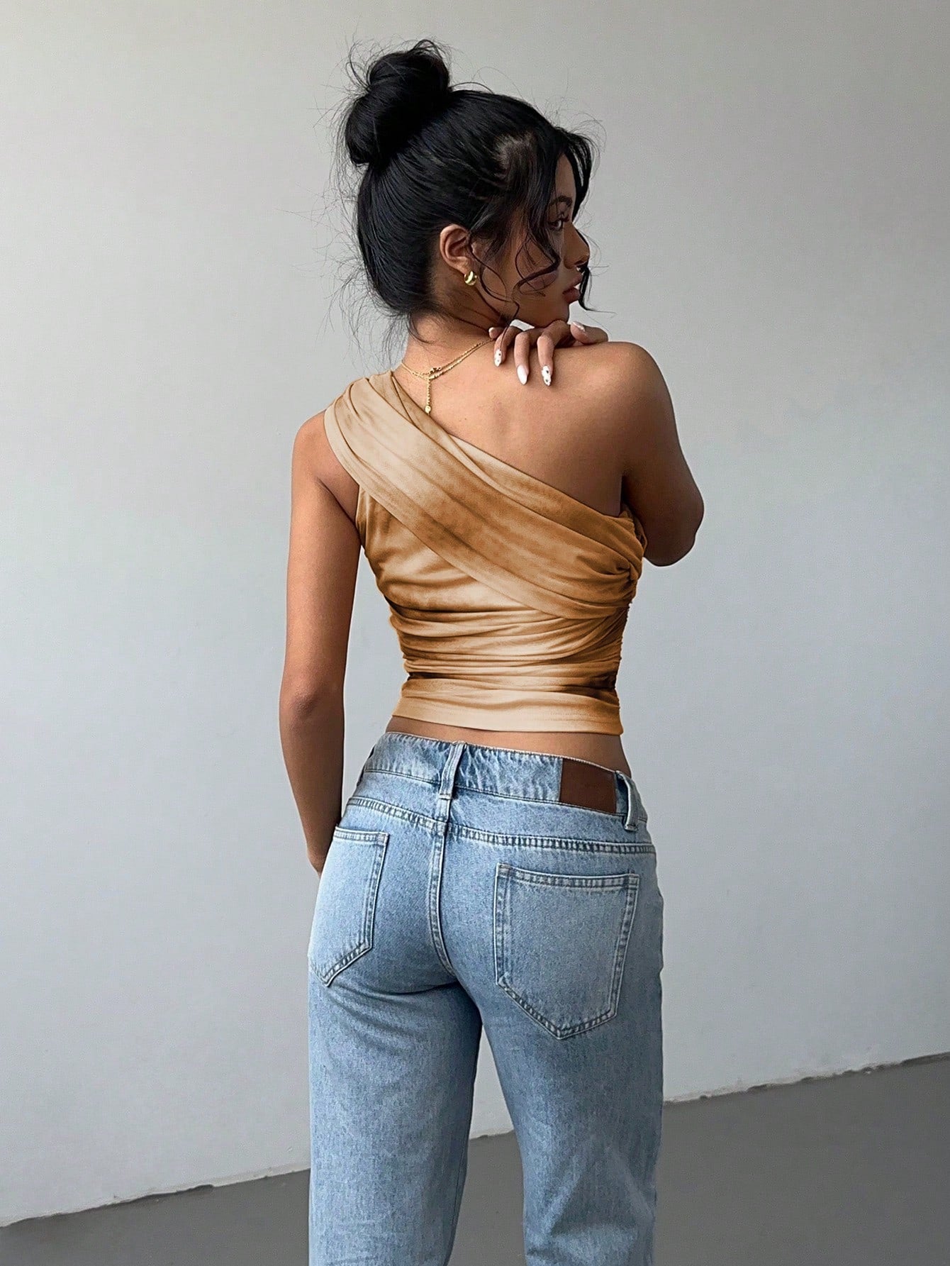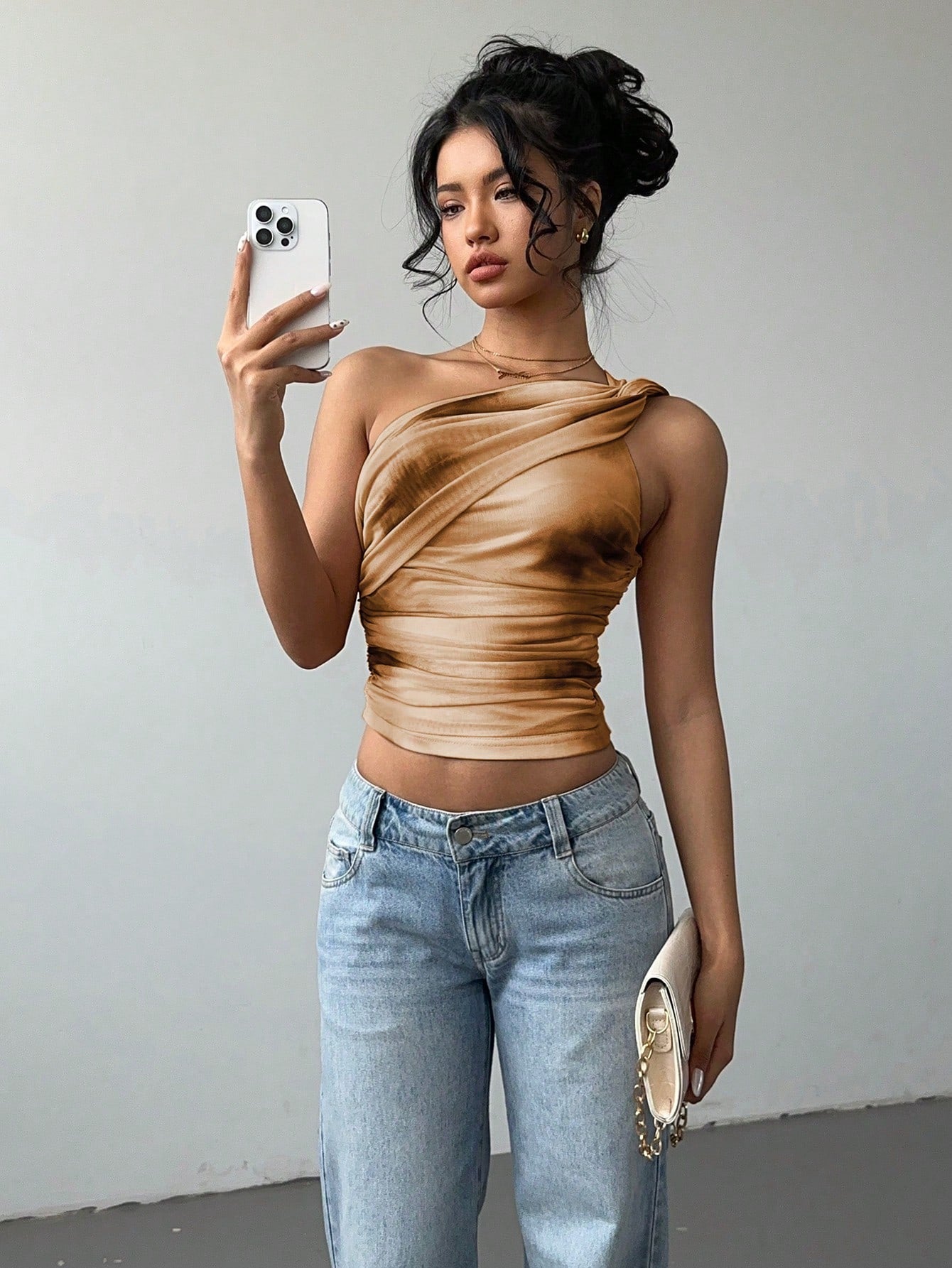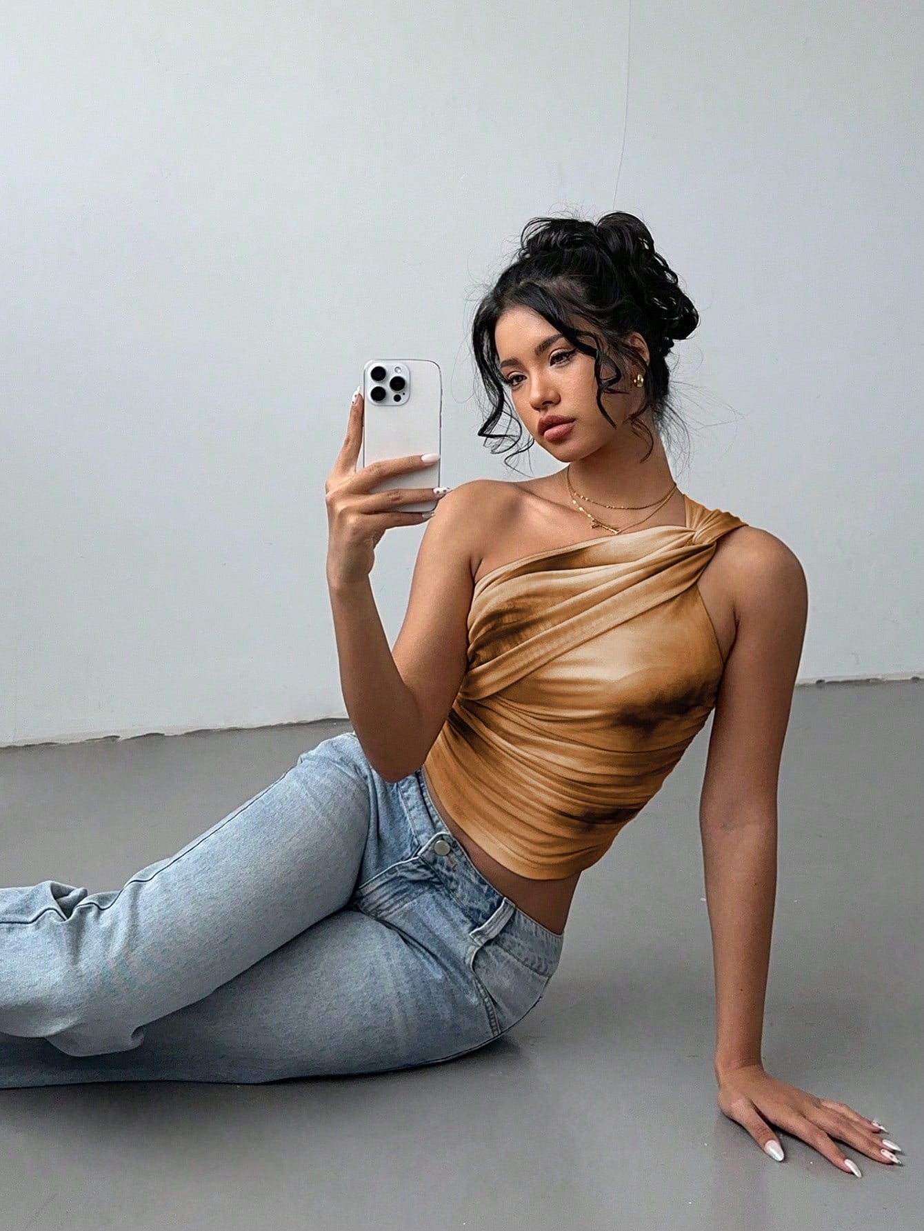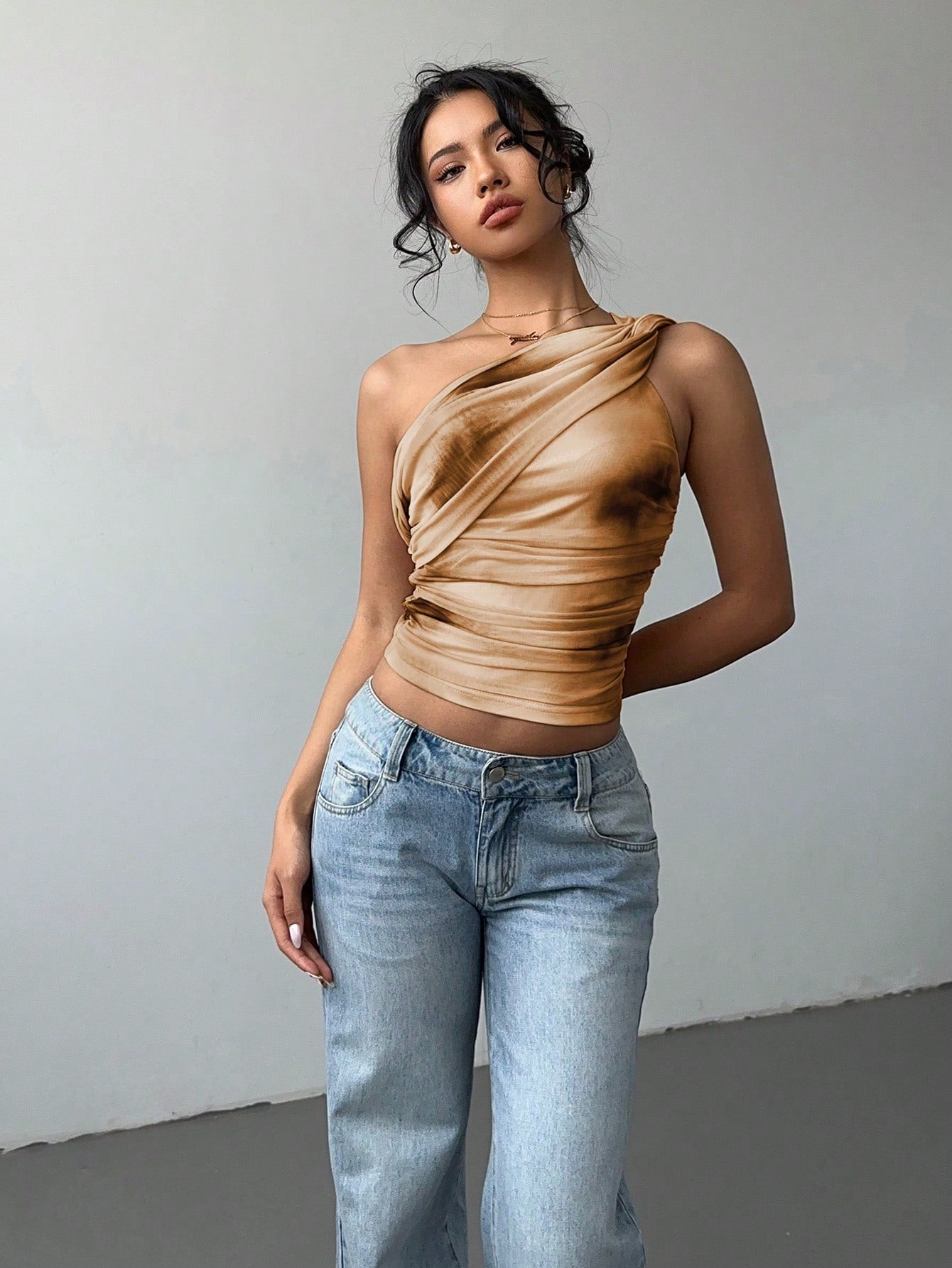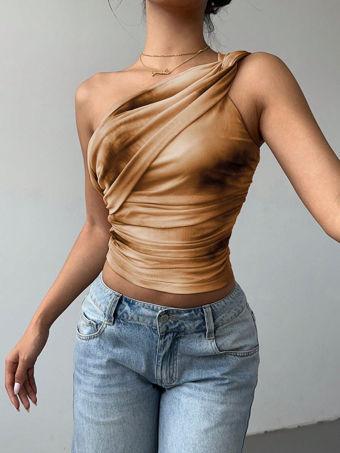 Aloruh Women's Stylish Sexy Gradient Print Mesh Ruched Tie-Front Crop Top Y2K Clothing Cold-Shoulder