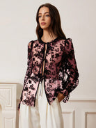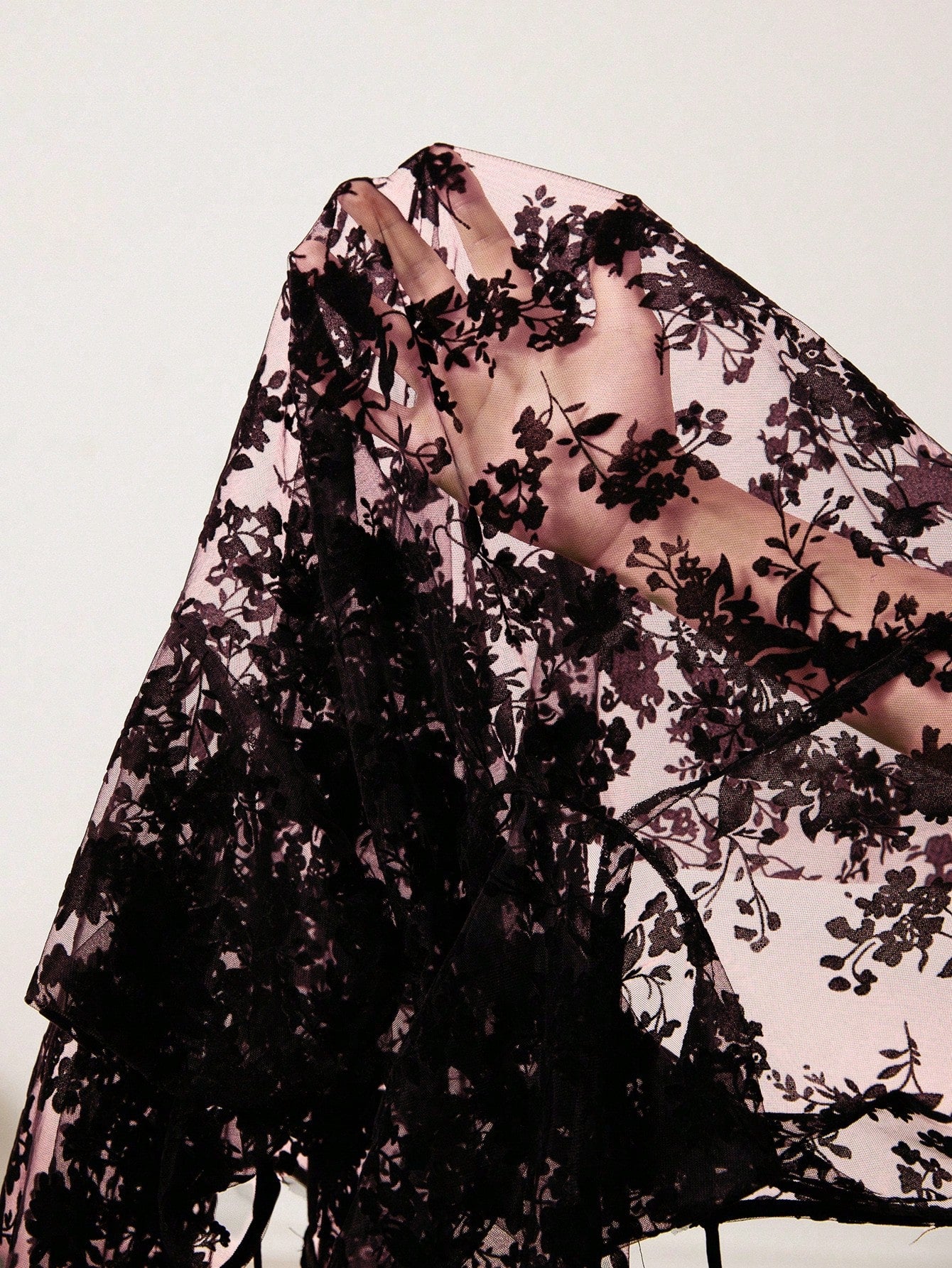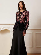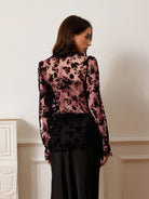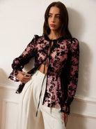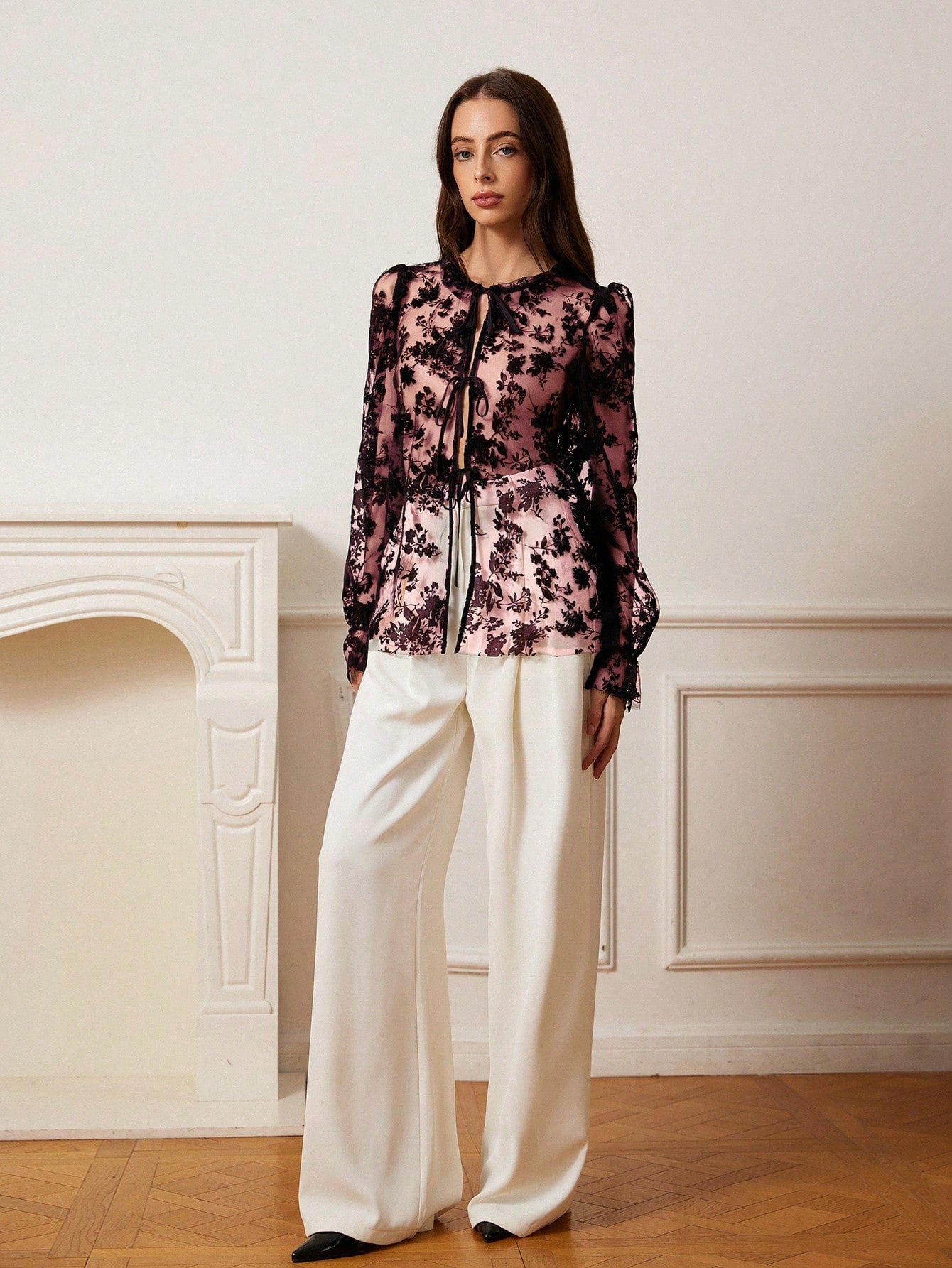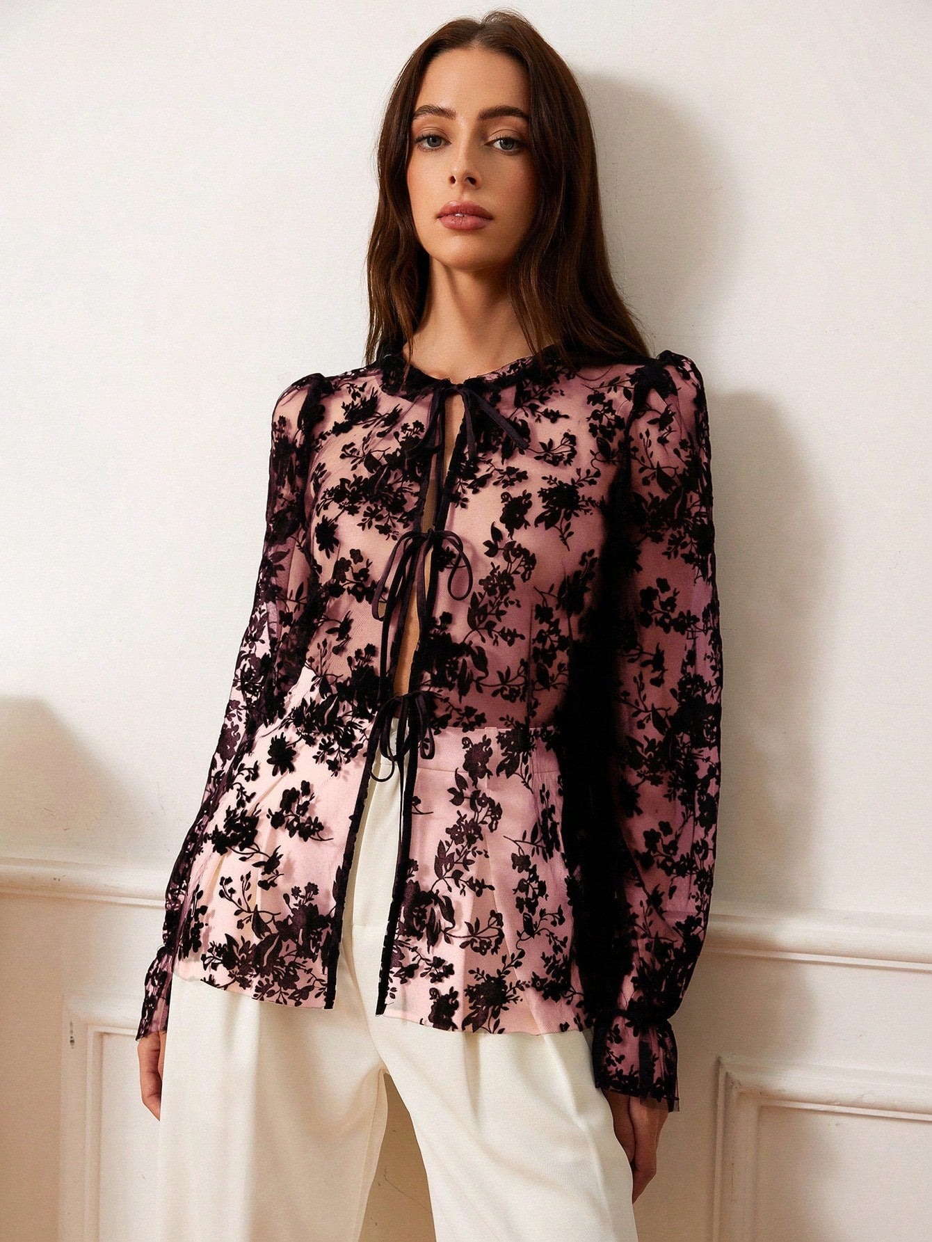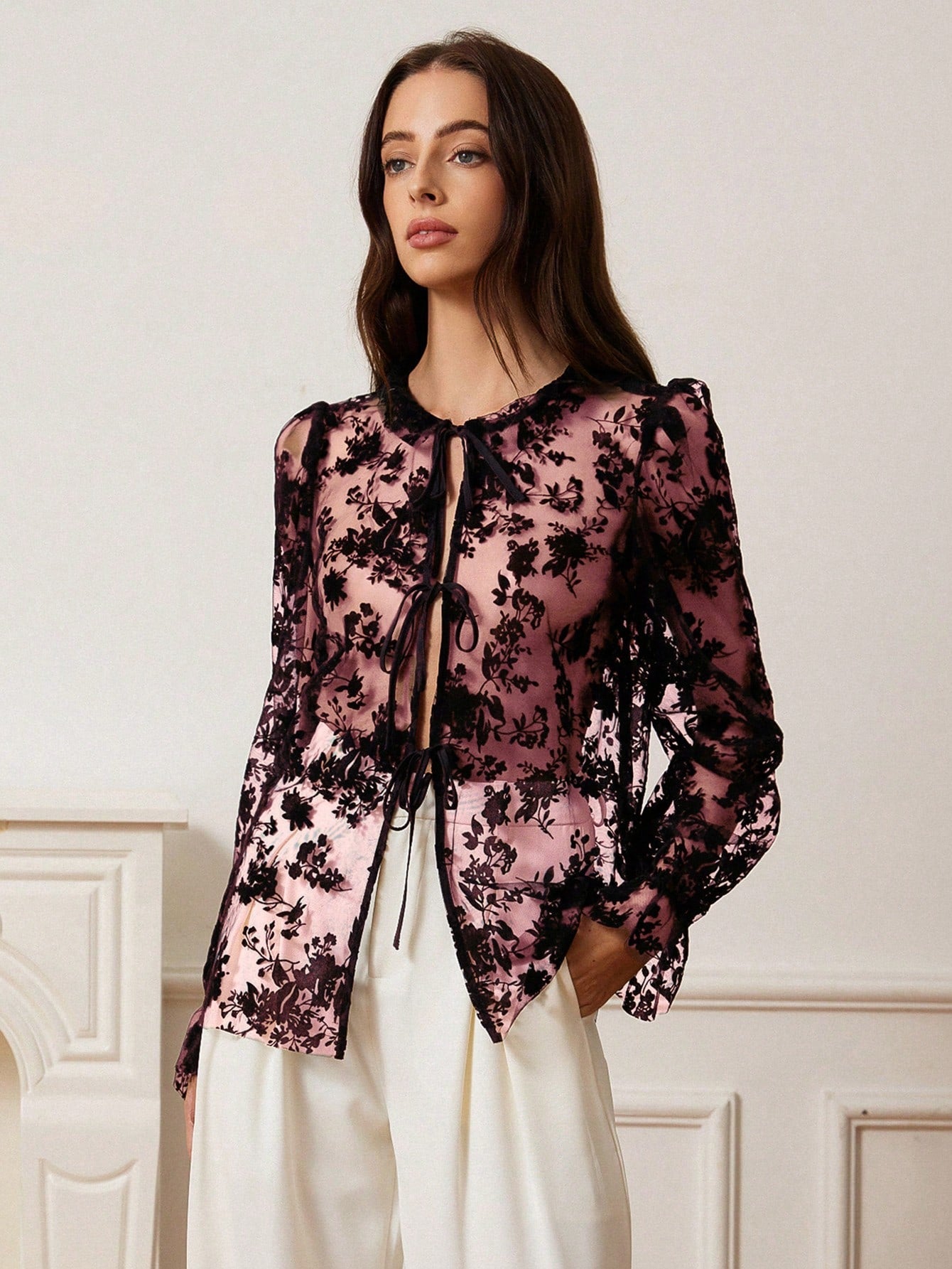 Aveloria Rosie Fashionable Sexy Flocked & Mesh Lace Up Blouse Boho Vacation Fashionable Style For Spring