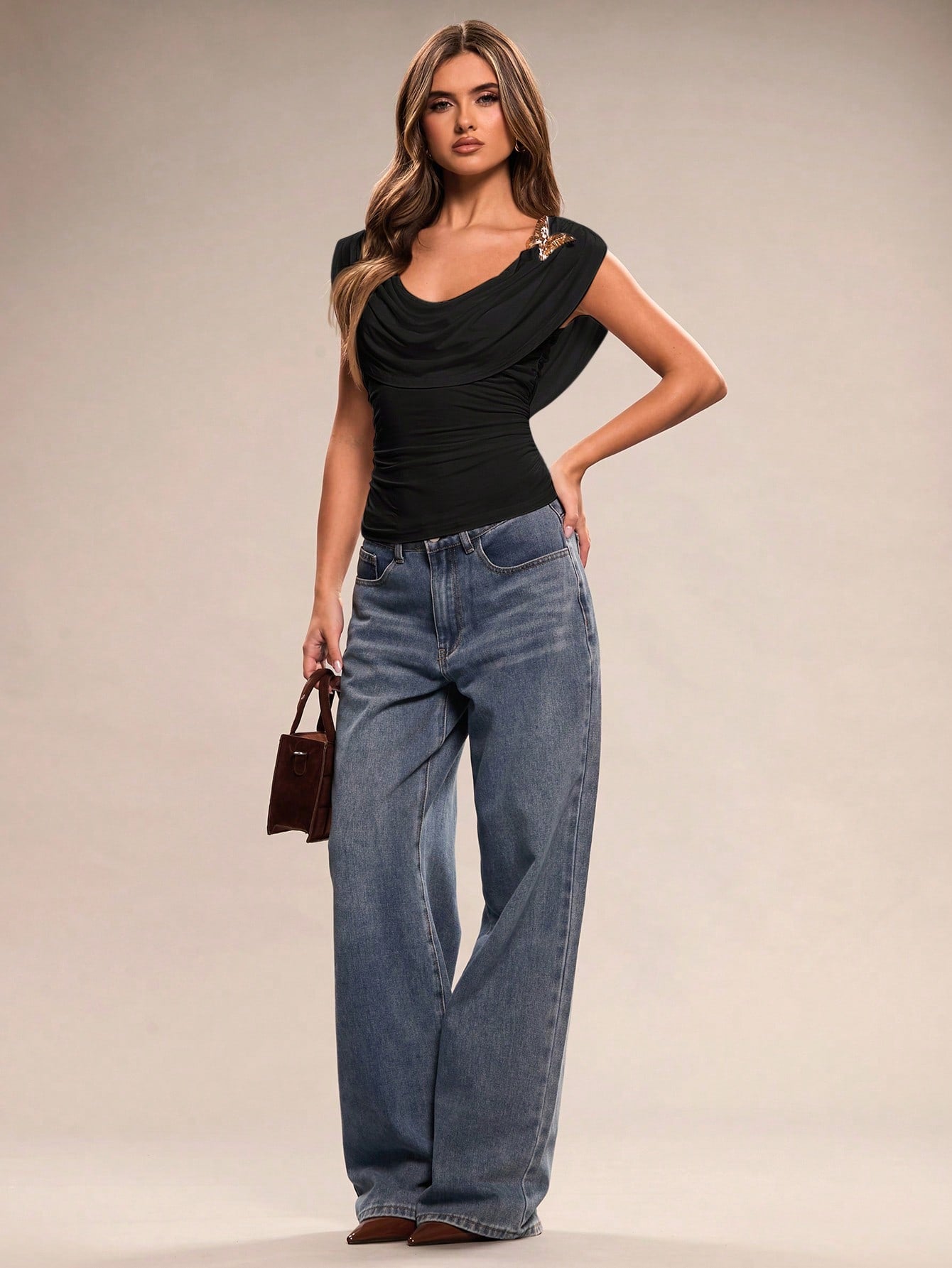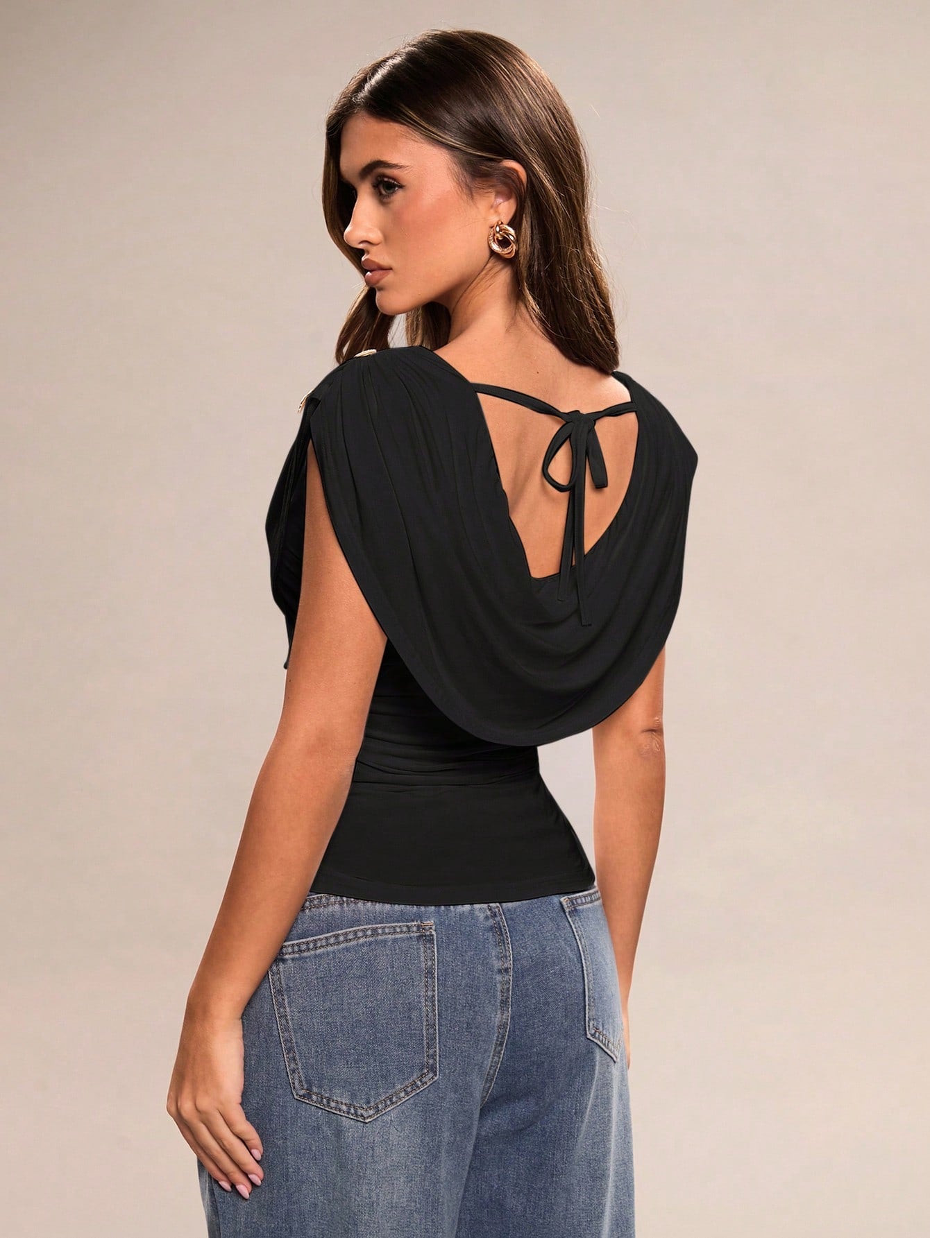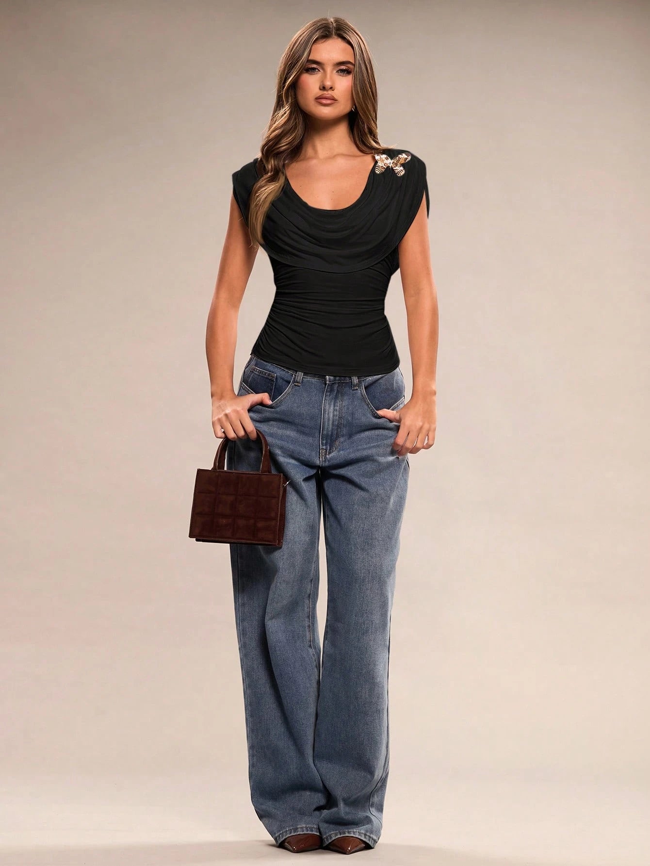 BAE Women's Cowl Collar Butterfly Decor Ruched Casual Top, Simple Design, Summer Tops Women, Going Out