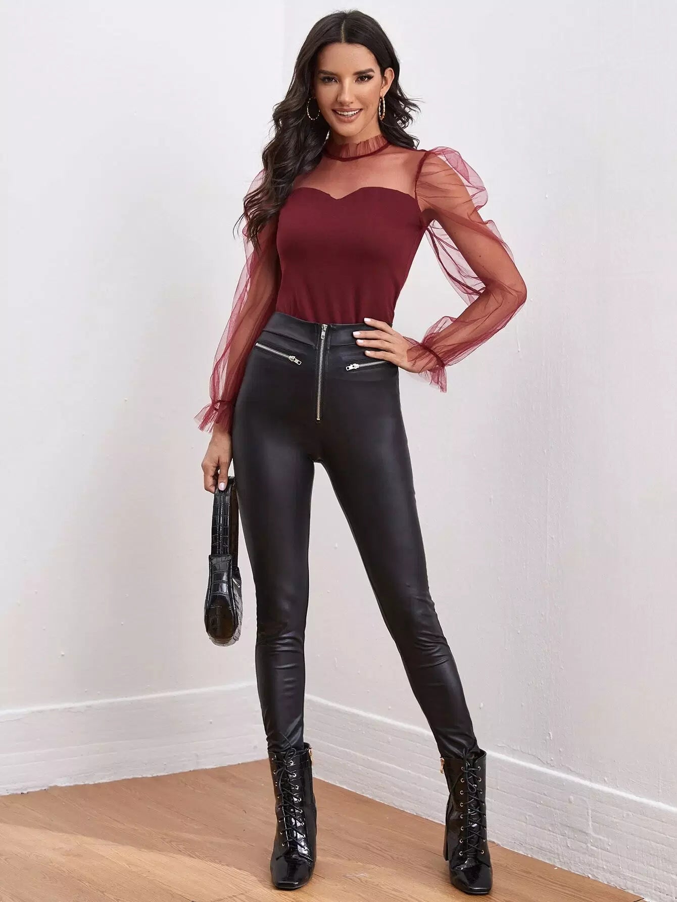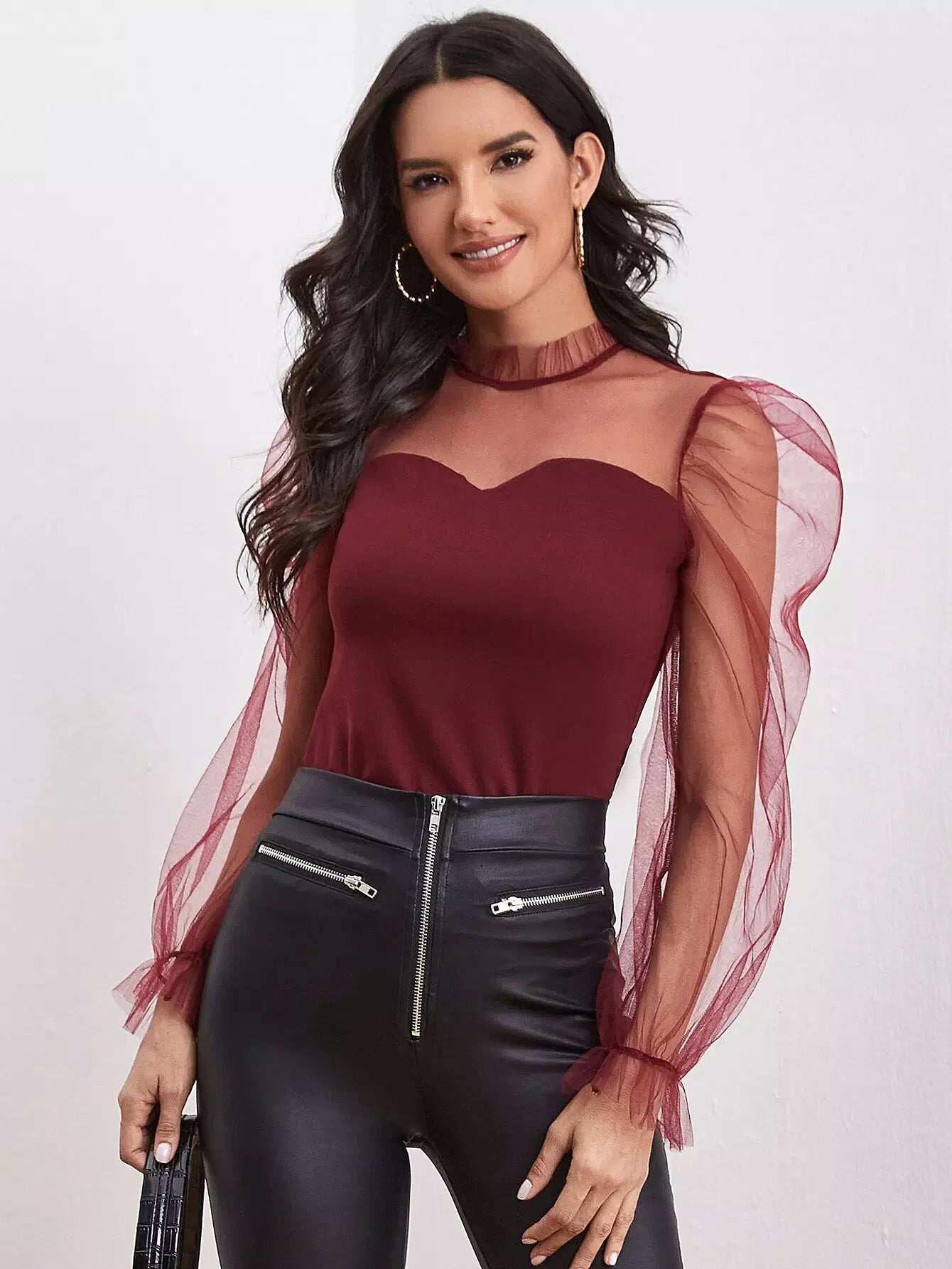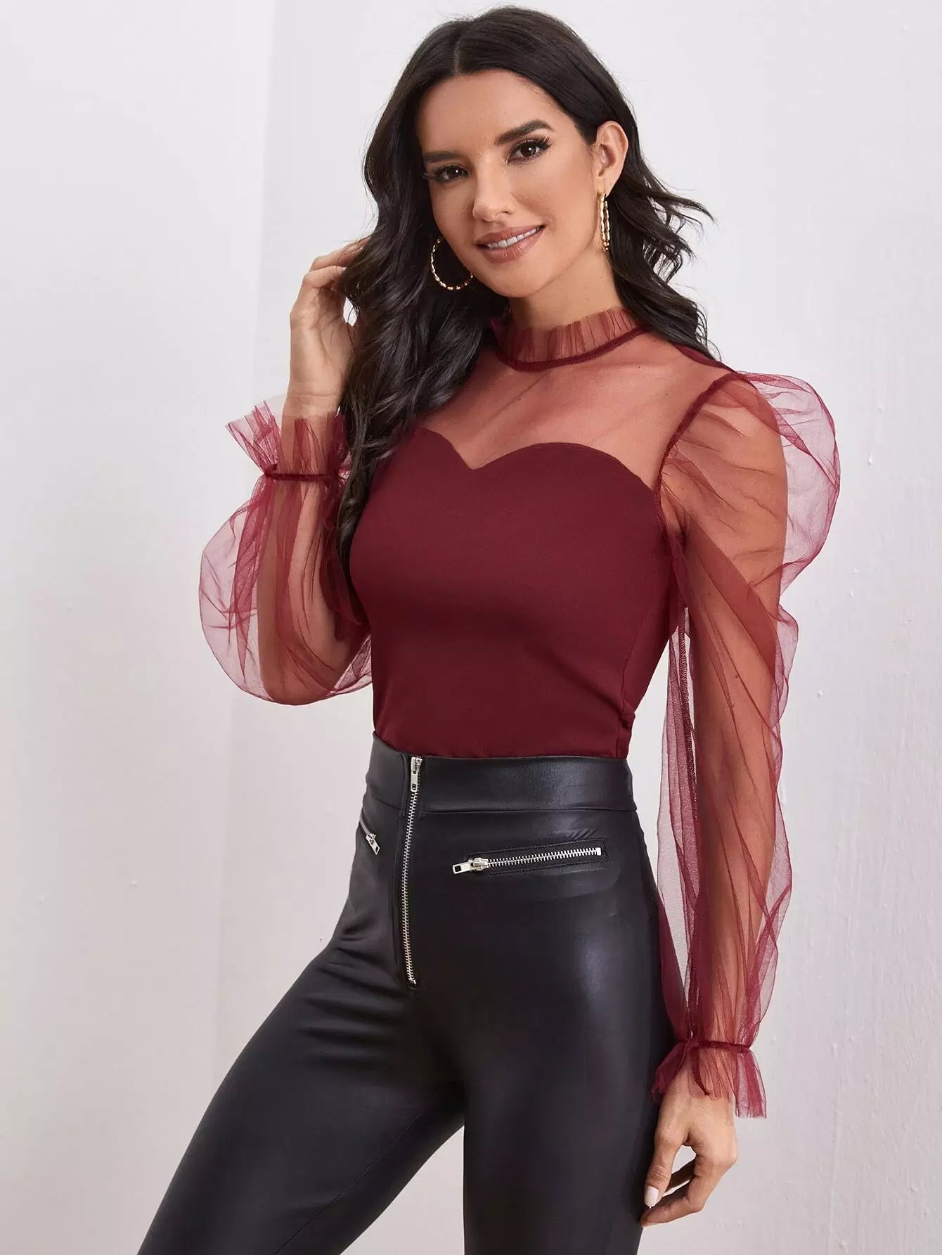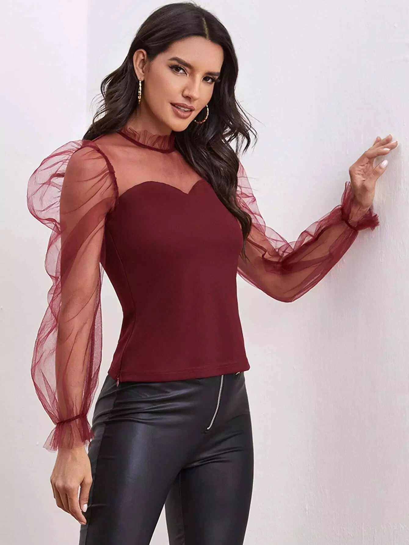 Frill Neck Sheer Mesh Puff Sleeve Top