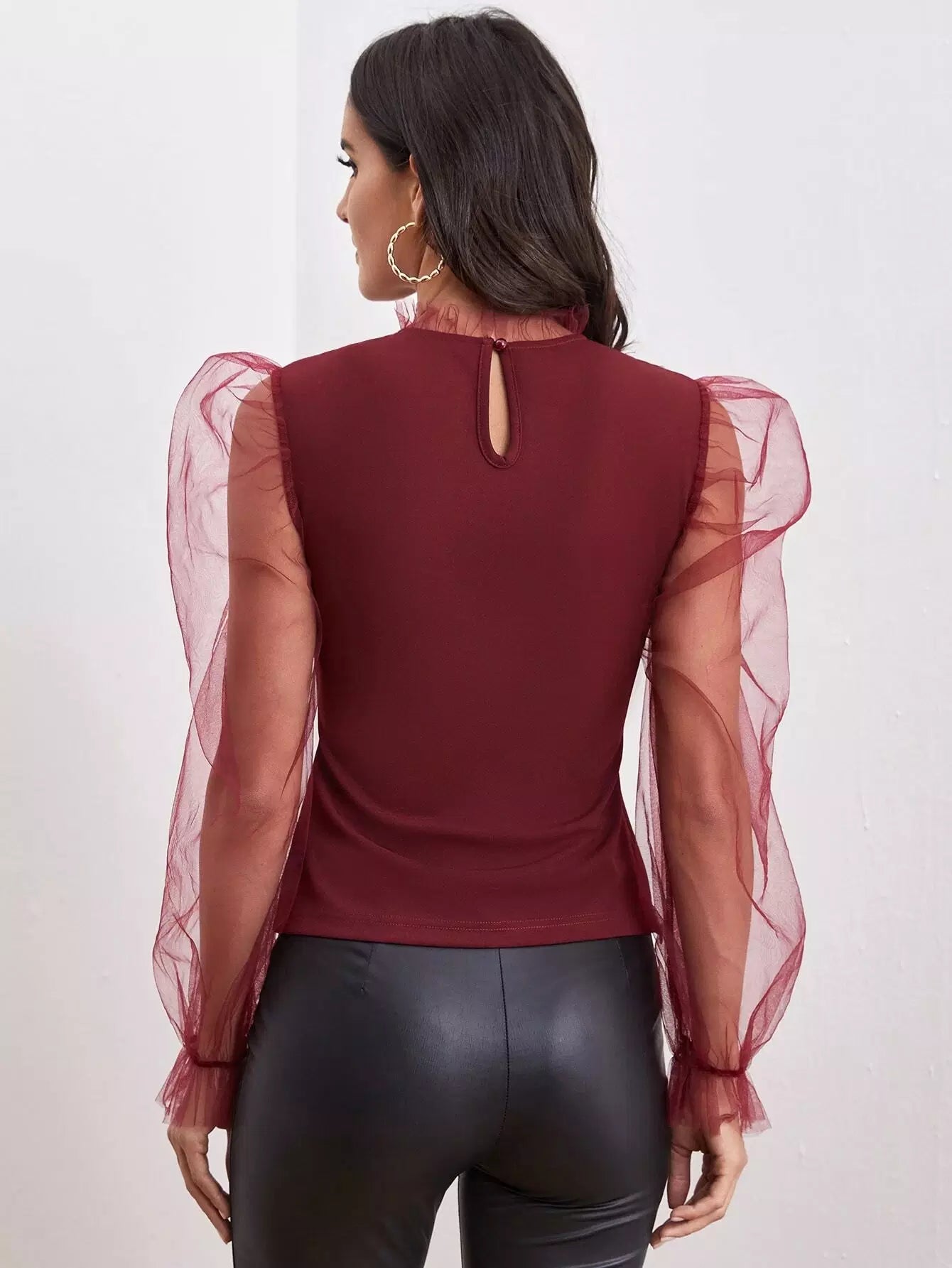 Women - Frill Neck Sheer Mesh Puff Sleeve Top