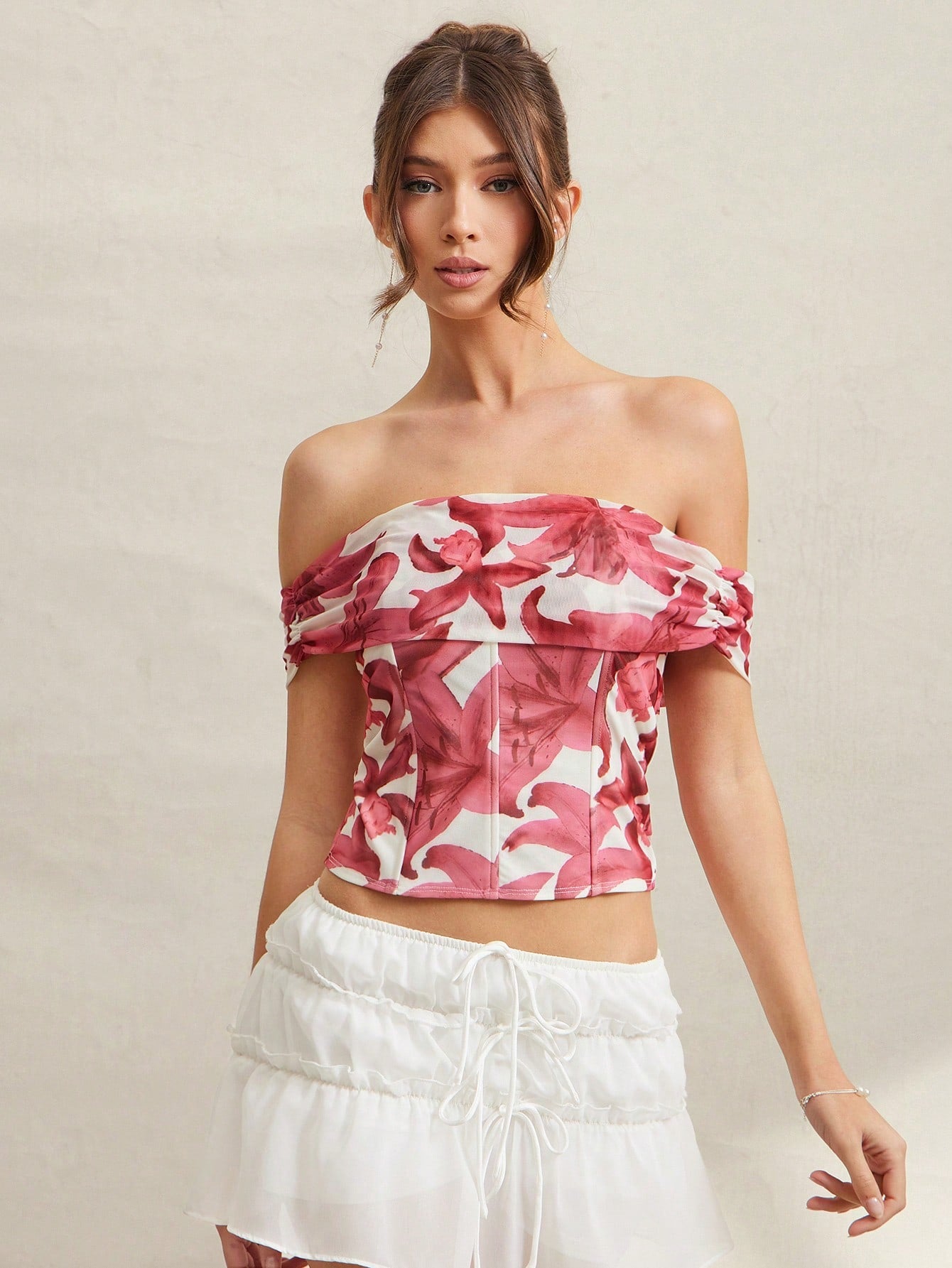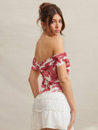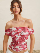 L'Amorae Women's Elegant Floral Pink/White Mesh Off Shoulder Summer Top, Summer Outfits For Women, Beach