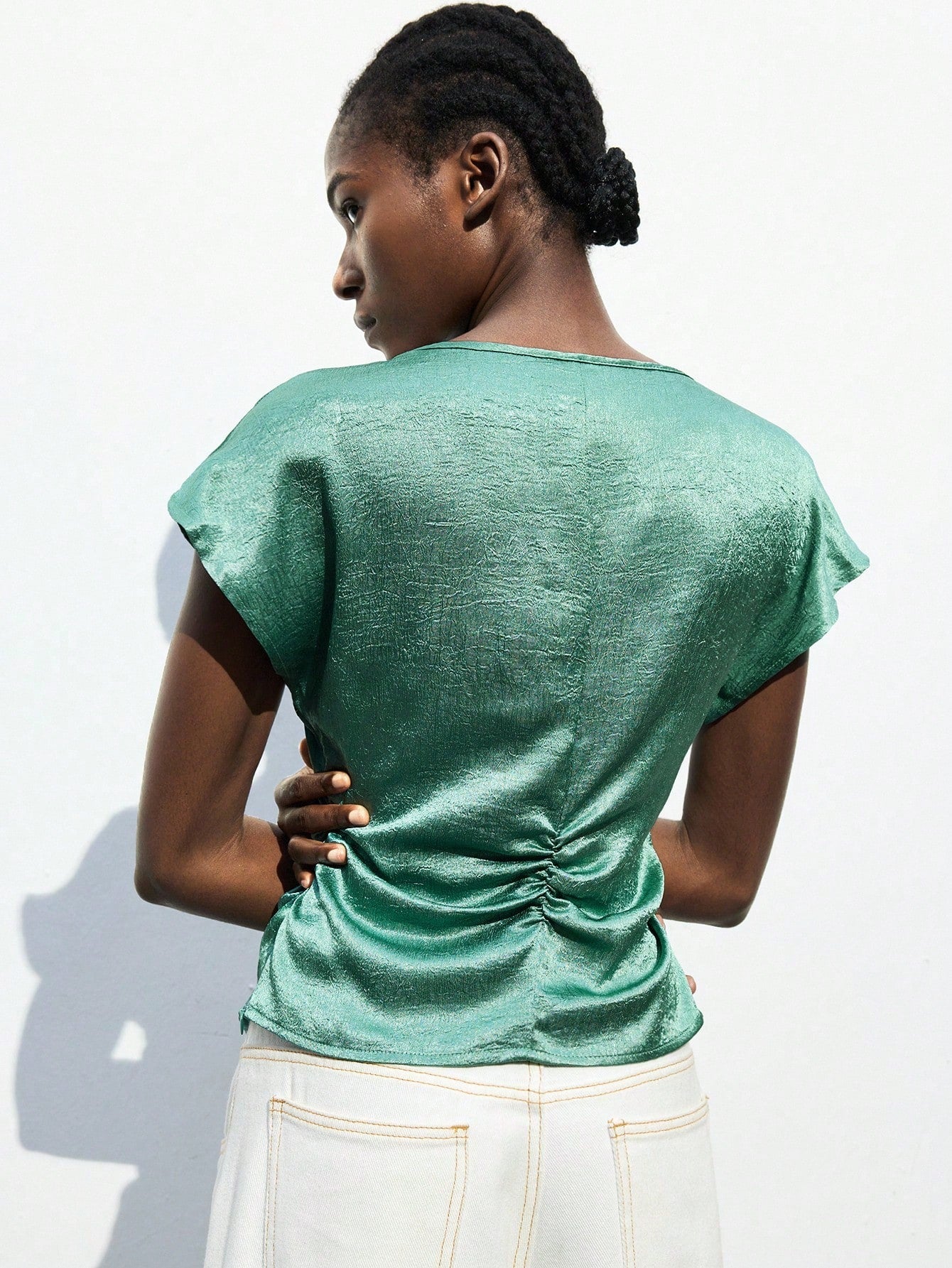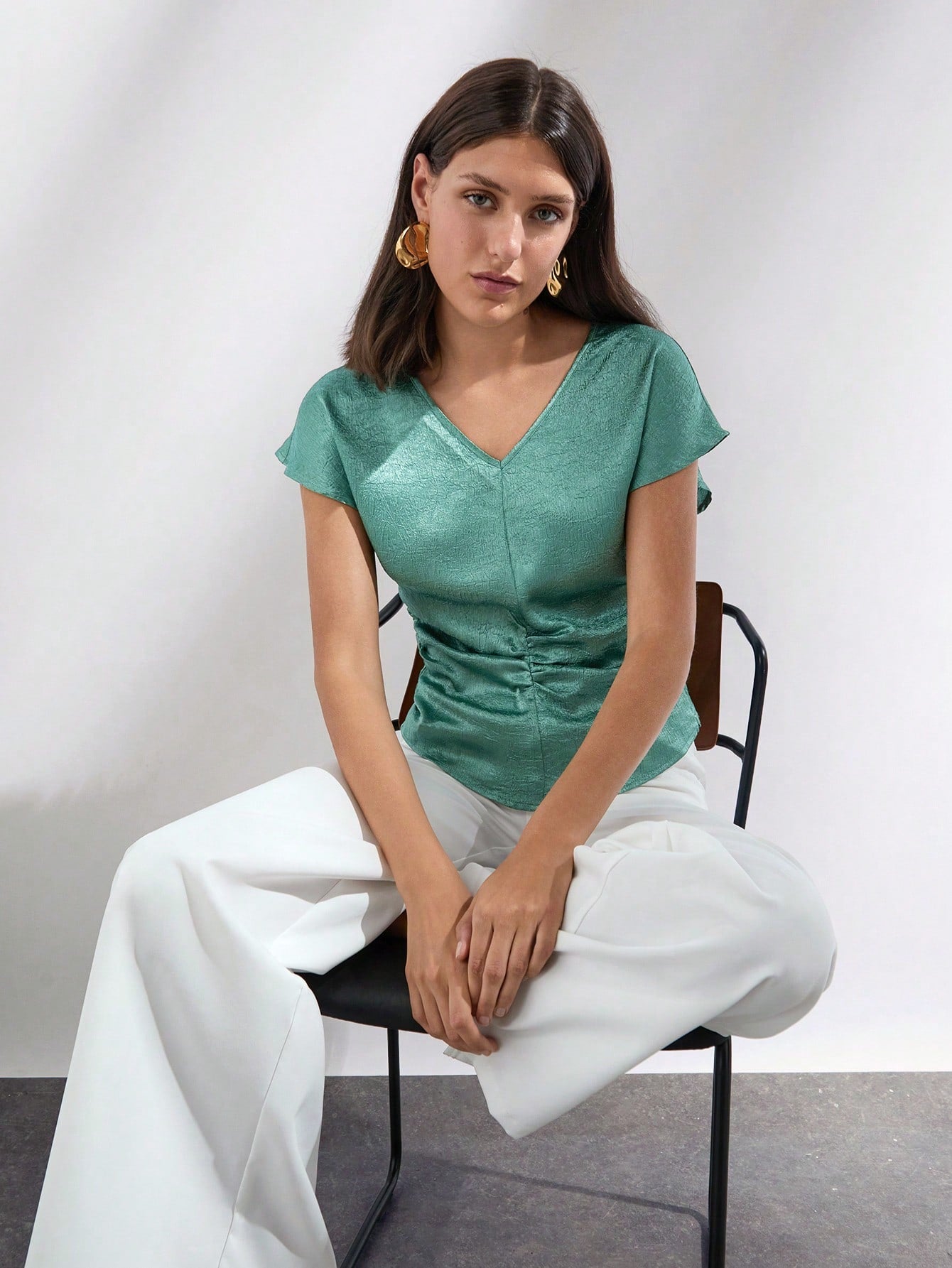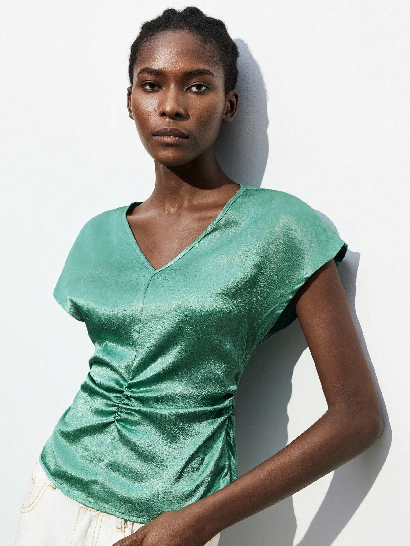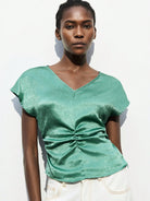 Maija Women's Green Ruched Design Versatile Summer Top, Elegant Urban Chic Modern Fashion, Comfortable
