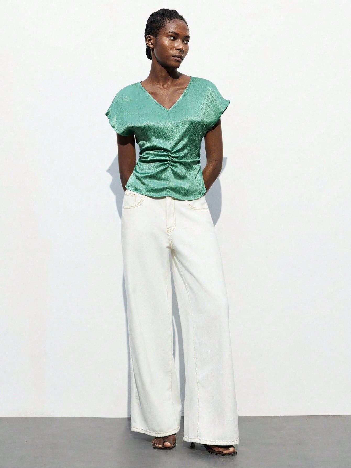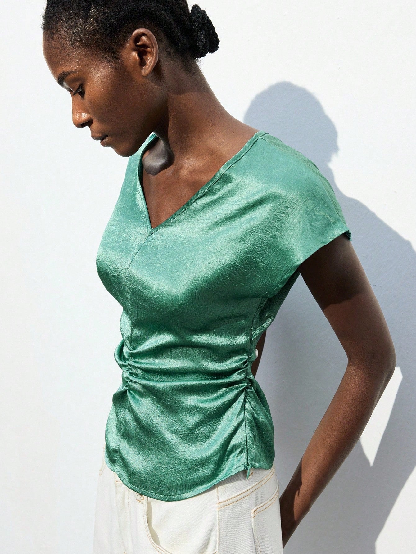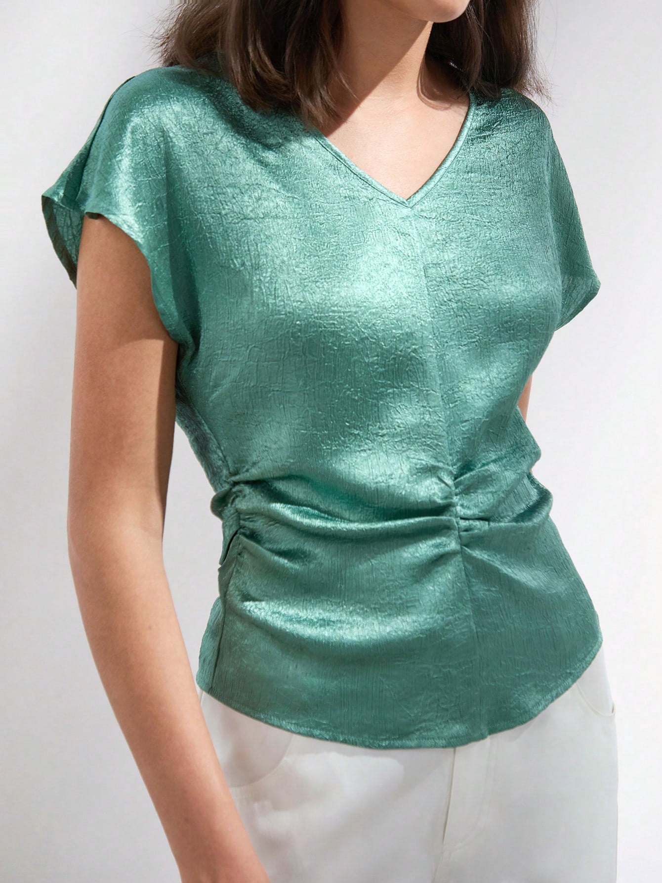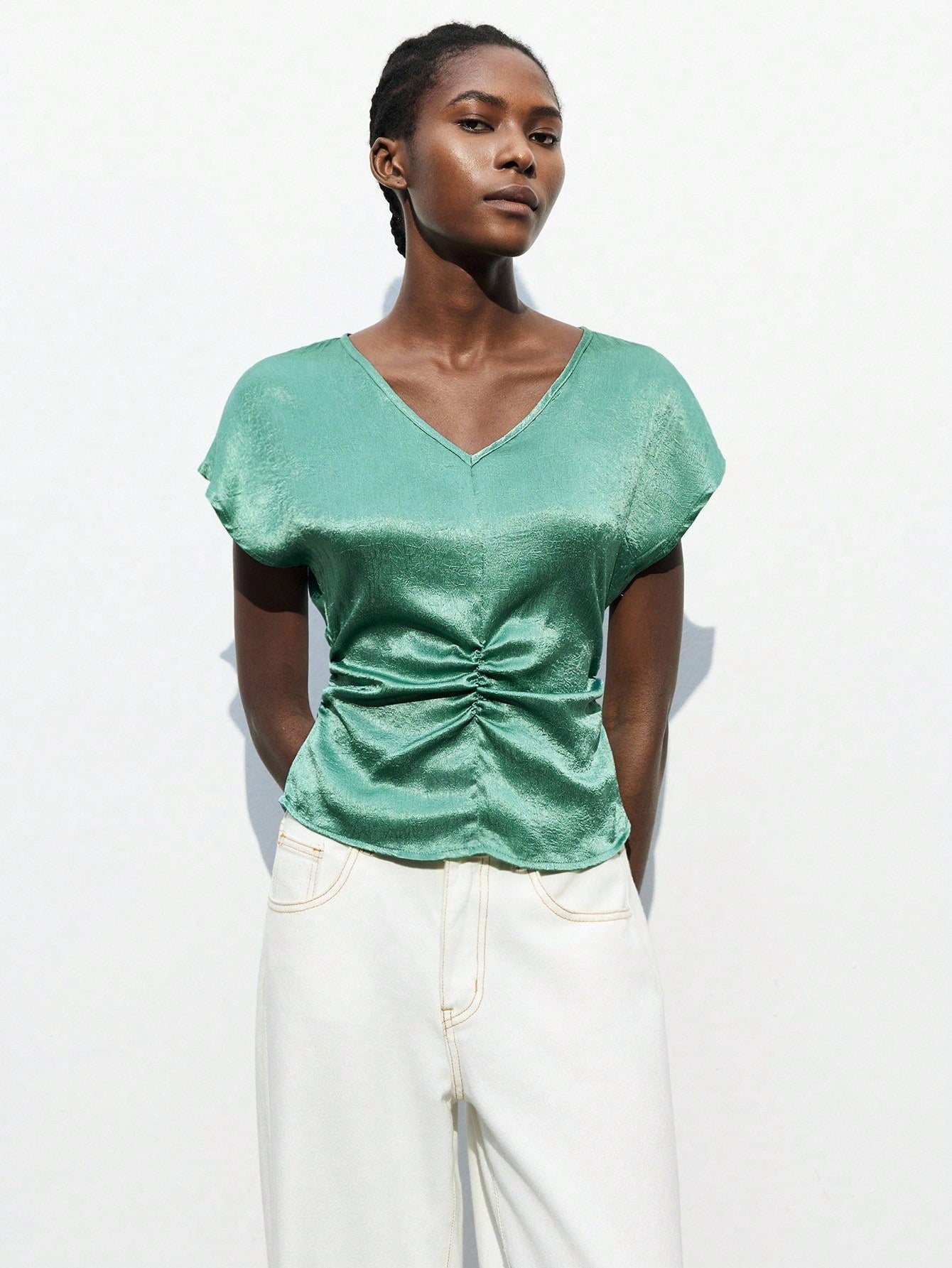 Maija Women's Green Ruched Design Versatile Summer Top, Elegant Urban Chic Modern Fashion, Comfortable