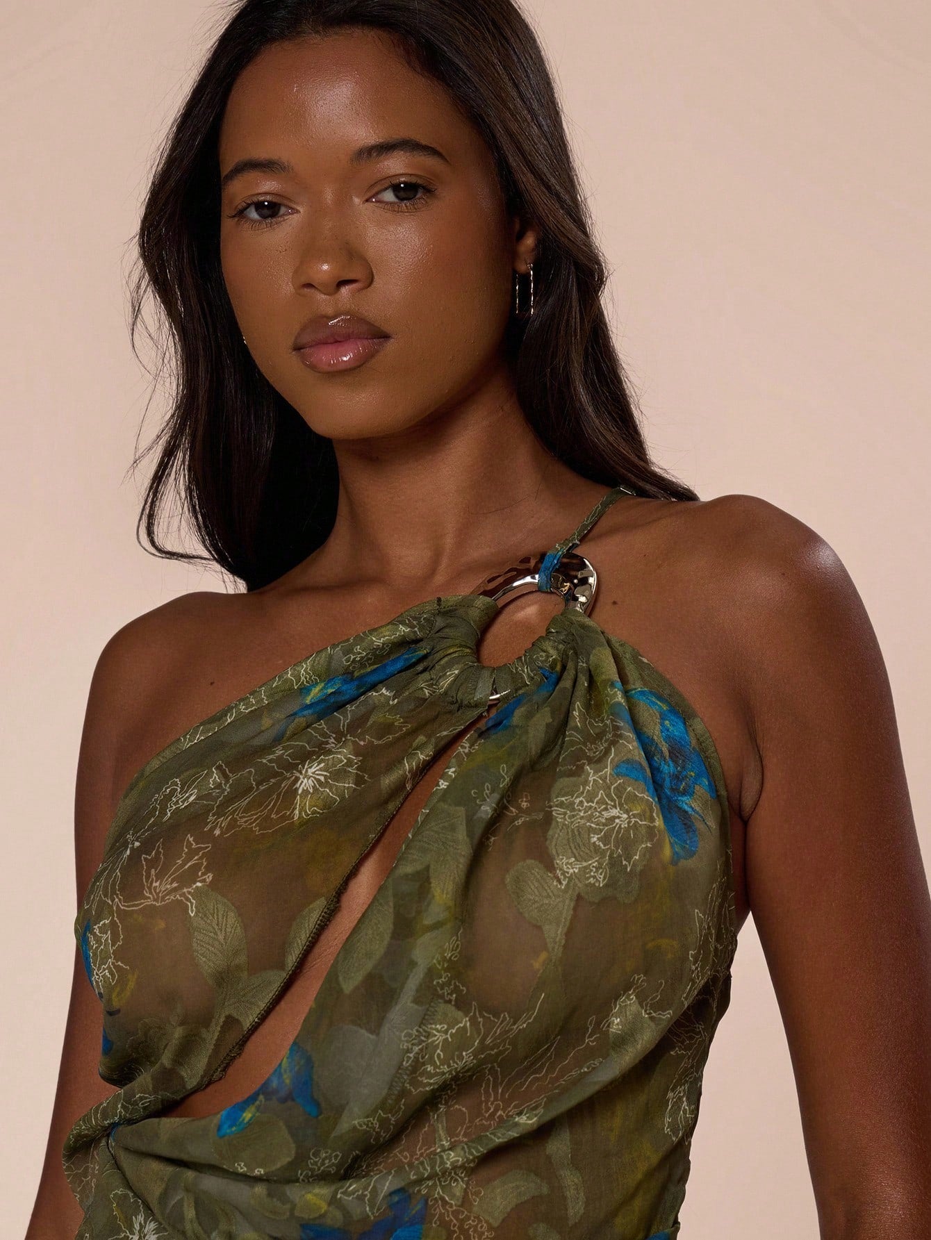 MUSERA Asymmetric One Shoulder Metal Trim Cut Out Drape Loose Fit Top Summer Cute Vacation Sexy Festival