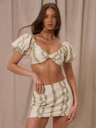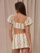 MUSERA Elegant Boho Romantic Open V Neck Patterned Gathered Bust Puffy Short Sleeve Top Only For Spring
