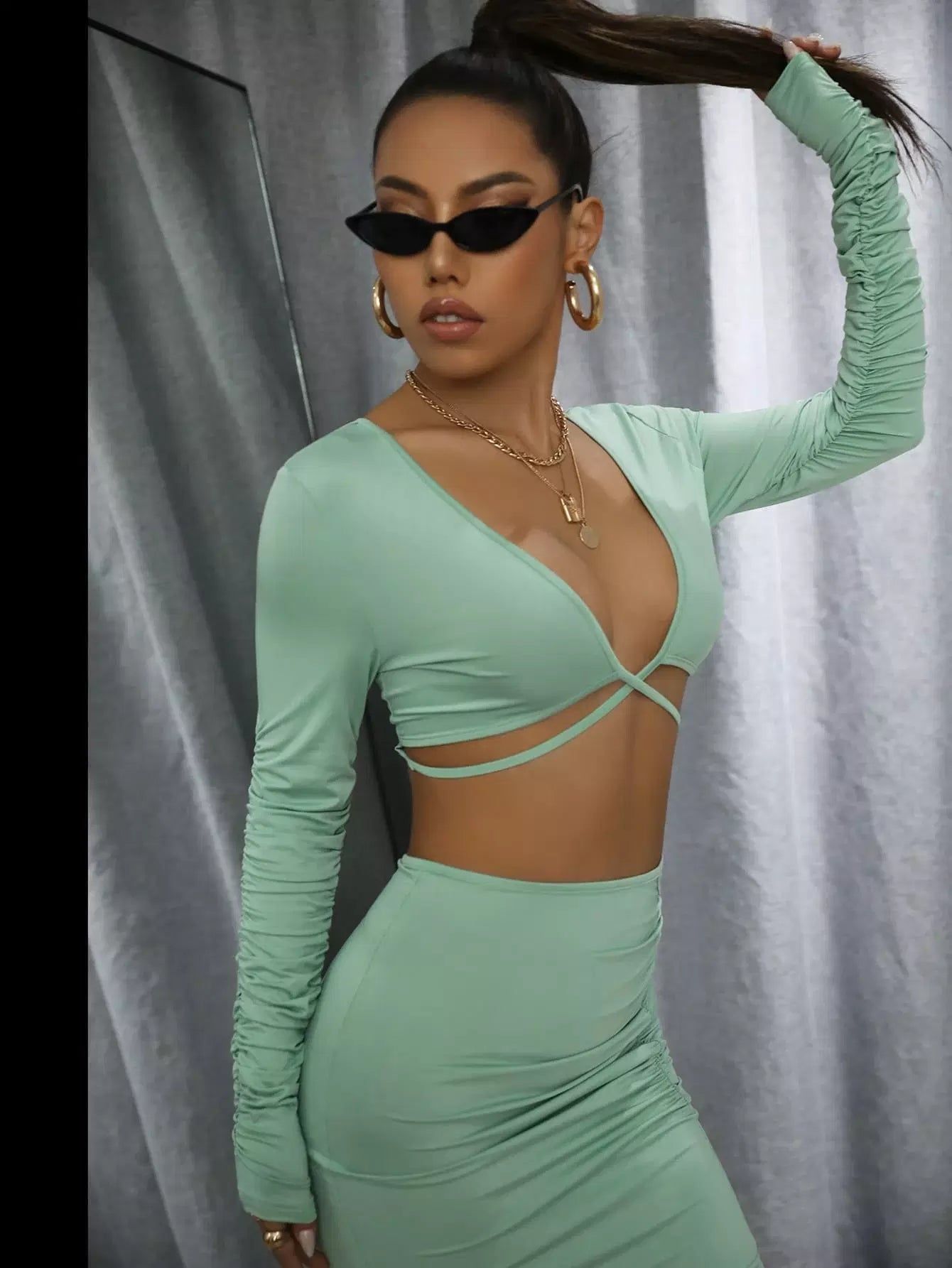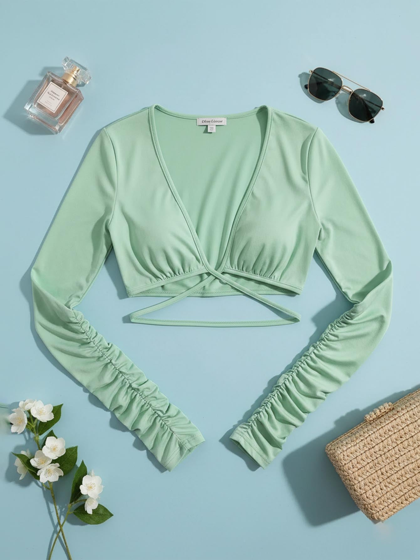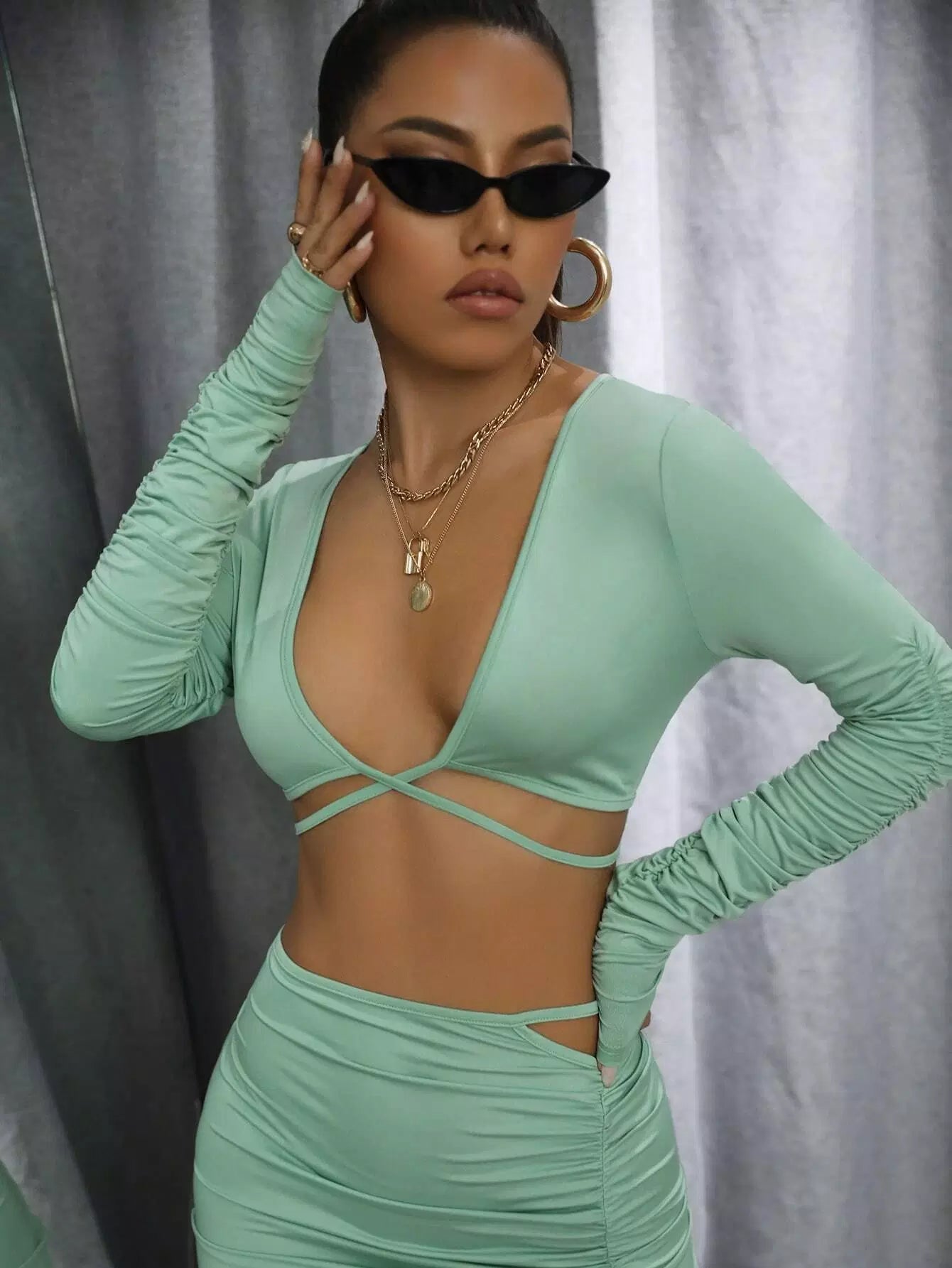 Ruched Sleeve Plunging Neck Crop Top