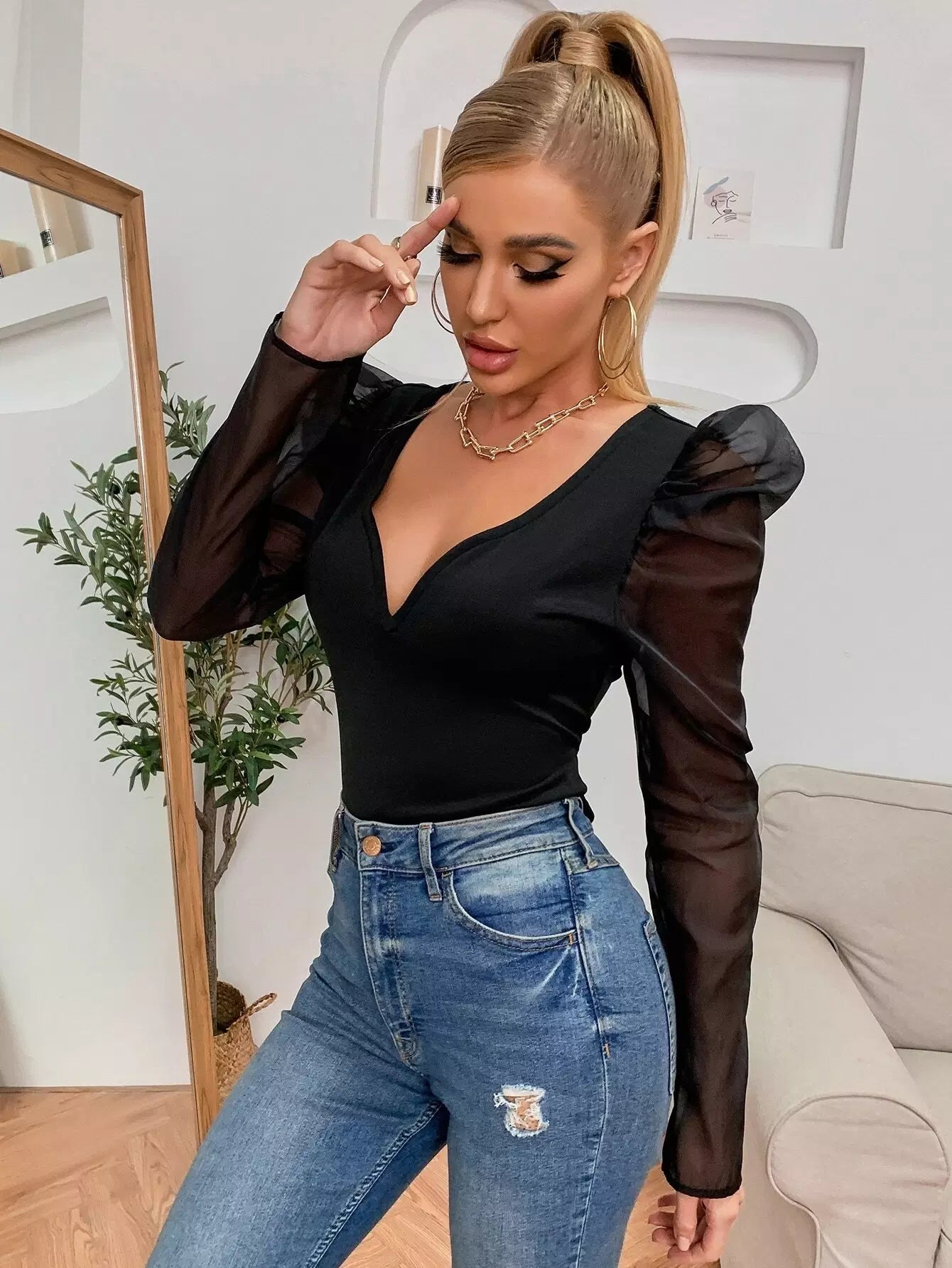 Sheer Puff Sleeve Slim Top