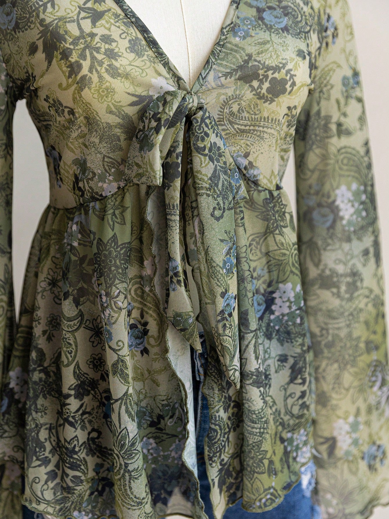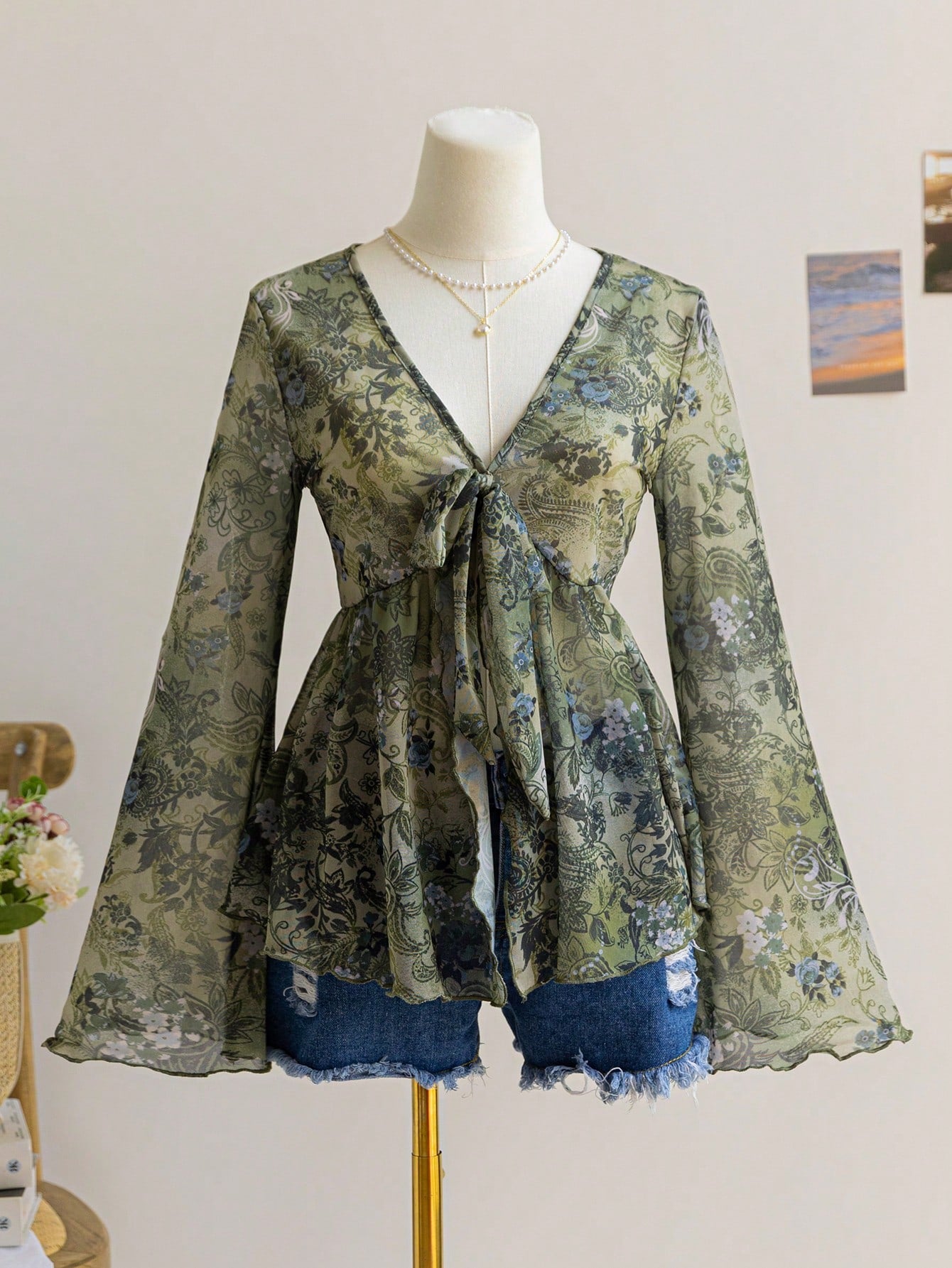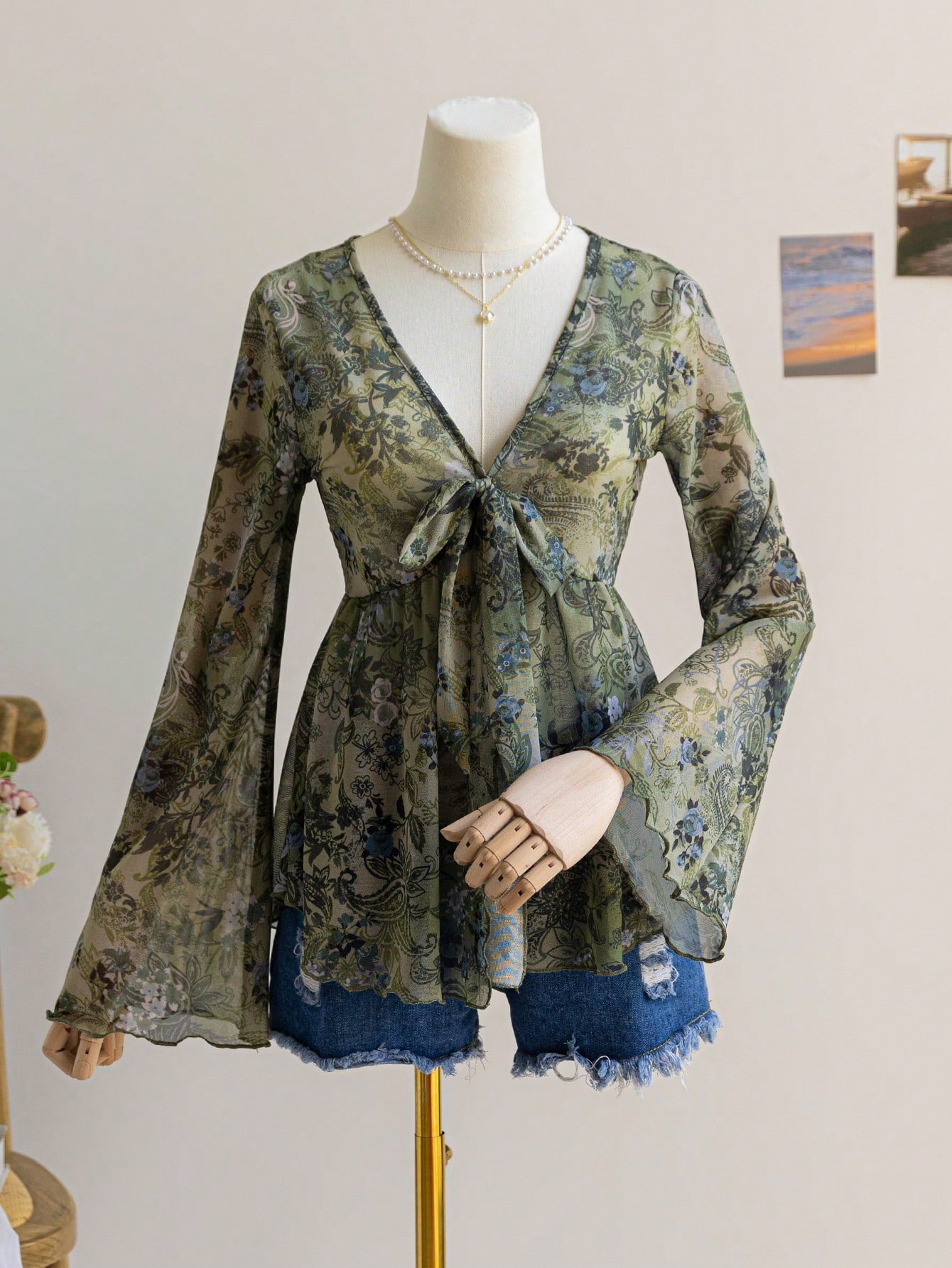 Soleia Women's Retro V-Neck Lace-Up Bowknot Flared Sleeve Asymmetrical Hem Top, Fall & Winter Women Clothes,